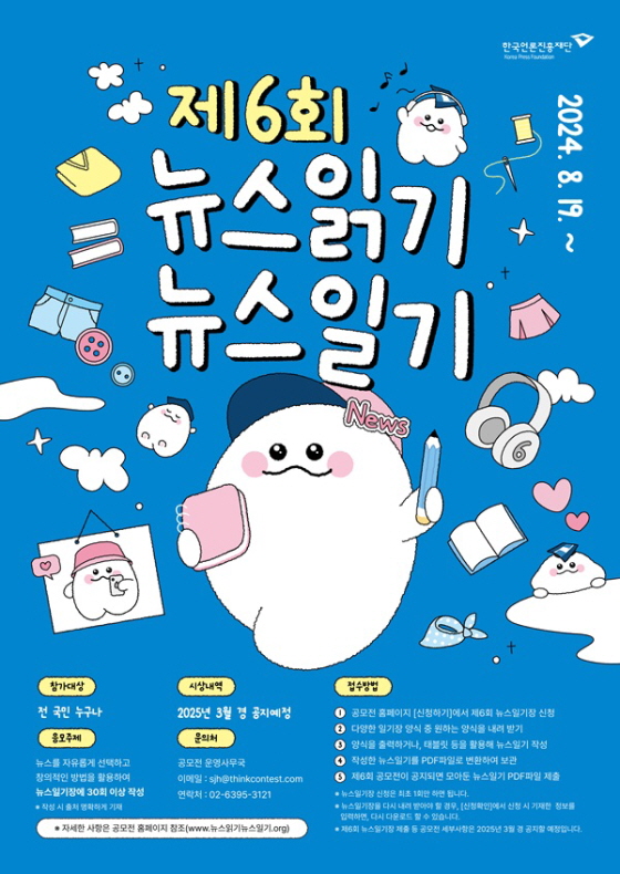 제6회 뉴스읽기 뉴스일기 공모전 뉴스일기장 배포 공모분야 문학/시나리오 접수기간2024.08.19 ~ 2025.06.30 D+228 종료 참가자격 제한없음 주최한국언론진흥재단 1등상금(상품)기타 홈페이지 바로가기 첨부파일 다운로드 유의사항 ※본 내용은 참고 자료로 내용의 오류와 변동에 대해 책임지지 않습니다. (오류 및 변동 신고는 상단의 '제안/오류' 신고를 통해 해주십시오.) ※주최사 사정에 따라 일정 및 내용이 변경될 수 있으니 주최사 홈페이지 등을 통해 관련 안내를 수시로 확인하시기 바랍니다. 상세내용 ■ 제목 제6회 뉴스읽기 뉴스일기 공모전 뉴스일기장 배포 ■ 기간 - 일기장 양식을 내려 받아 작성 : 2024년 8월 19일(월) ~ 2025년 7월 경· 제6회 일기장은 더 많은 사람이 참여하고, 환경을 지키기 위해 ‘온라인 일기장 양식’으로 배포될 예정입니다.· 다양한 양식 중 필요한 양식을 다운로드하여 온/오프라인으로 작성하시면 됩니다.· 뉴스의 정확한 출처만 표기하신다면, 직접 만든 양식에 뉴스일기를 작성해도 됩니다.- 작성한 뉴스 일기장 제출 : 2025년 3월 경 ~ 2025년 7월 경· 제6회 일기장은 환경 보호 및 더 많은 사람의 참여를 위해 '온라인 일기장 양식' 으로 배포됩니다.※ 상기 일정은 변경 가능하며, 변경 시 공모전 홈페이지를 통해 안내 예정※ 공모전 세부 일정은 2025년 3월 경 공지 예정 ■ 참가자격 - 어린이(저) : 2017년~- 어린이(중) : 2015년~2016년- 어린이(고) : 2013년~2014년- 청소년(중등) : 2010년~2012년- 청소년(고등) : 2007년~2009년- 성인 : 2006년 이전 출생자 (2006년생 포함)※ 개인접수(단체 접수 불가능) ■ 참여방법 / 접수방법 <공모 주제>- 뉴스를 읽거나 본 후, 소감 등을 뉴스일기로 30회 이상 작성하여 제출* 뉴스 주제 등에 제한은 없으며, 다양한 방법으로 일기를 자유롭게 작성※ 뉴스일기 별로 뉴스 출처 기재 필수 뉴스 출처 구분 출처 기재 예시 언론명보도 일자기사 분류기자명기사 제목 종이신문 ㅇㅇ일보, 2024.8.1.(화), 문화(13면), 김△△, “언론진흥재단, 제5회 뉴스읽기 뉴스일기 공모” 인터넷신문 ××인터넷, 2024.8.1.(화), 문화, 이◇◇, “언론진흥재단, 제5회 뉴스읽기 뉴스일기 공모” 방송 □ □ □, 2024.8.1.(화), 문화, 박○○, “언론진흥재단, 제5회 뉴스읽기 뉴스일기 공모” ※ 뉴스 선택방법 : 자유롭게 선택할 수 있으며, 한국언론진흥재단 빅카인즈 이용을 추천함 * 빅카인즈(www.bigkinds.or.kr)는 104개 언론사가 참여하는 뉴스빅데이터 분석 시스템으로, 약 1억건의 기사를 보유함. 광고 없이 기사를 검색할 수 있고, 시각화 보고서 등 뉴스 분석 기능을 무료로 지원함 <신청 방법>1) 공모전 홈페이지 [신청하기]를 통해 제6회 뉴스일기장 신청2) 신청 후 일기장 온라인 양식 다운로드 *2024년 8월 19일부터 상시 다운로드 가능3) 일기장 양식 다운로드 후 양식에 맞춰 문서 작성 또는 출력(A4사이즈)하여 작성* 공모전 홈페이지 [신청하기]를 통해 일기장 양식(표지, 속지, 스티커) 다운로드 후 문서(PC 또는 태블릿) 작성 또는 출력(A4사이즈)하여 작성 <접수 방법>1) 작성한 일기장을 PDF 형식으로 변환* 홈페이지 [접수하기]를 통해 입력한 개인정보로 로그인하여 접수마감까지 작성한 일기장 상시 제출 가능(최종적으로 작성한 일기장을 1개의 PDF로 제출을 권장 드리오나, 일기장들을 개별적으로 제출 가능) ▶ 제6회 뉴스일기장 제출(접수)은 2025년 3월 경 ~ 2025년 7월 경 2) 공모전 홈페이지에서 [접수하기]를 통해 온라인 접수 시, PDF 형식으로 일기장 제출* 수기 작성한 일기장 스캔 시, 글씨를 인식 가능한 수준의 화질로 PDF 제작 후 첨부(작성 안내 참조)* 일기장 작성 및 PDF 변황 방법은 홈페이지 공지사항의 ‘일기장 작성 가이드북’ 참조 <심사 방법>- 1, 2차 심사 홈페이지 참조■ 시상내용 / 혜택 - 2025년 3월 경 공지 예정 ■ 유의사항 - 응모작은 국내외의 저작권, 초상권 또는 이와 유사한 타인의 권리를 침해하지 않는 순수 창작품이어야 하며, 문제 발생 시 수상과 상금 지급이 취소되며, 모든 법적 책임은 응모자에게 있습니다. - 최종 제출된 작품에 대한 저작권은 응모자 본인에게 있으며, 주최 기관은 수상작 전체 또는 일부를 변경하여 공익적 목적으로 (제작, 복제, 배포 등) 자유롭게 이용 가능합니다. ■ 문의사항 - 공모전 운영사무국 공모전 누리집 : www.뉴스읽기뉴스일기.org sjh@thinkcontest.com 02-6395-3121 카카오톡 채널ID : ‘뉴스읽기 뉴스일기 공모전’ 검색- 연락가능시간 : 09:00~18:00 * 제6회 뉴스일기장 작성 및 제출방법 등 관련 문의사항은 [공모전 홈페이지] - [FAQ] 확인 바라며, 이 외 자세한 문의는 위 문의처를 통해 연락 바랍니다. 목록
