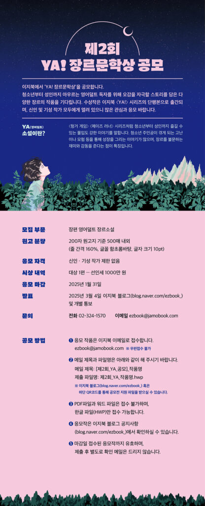 YA!(영어덜트) 장르문학상 공모분야 문학/시나리오 접수기간2024.10.16 ~ 2025.01.31 D+378 종료 참가자격 제한없음 주최자음과모음 1등상금(상품)500만원~1천만원 홈페이지 바로가기 첨부파일 다운로드 유의사항 ※본 내용은 참고 자료로 내용의 오류와 변동에 대해 책임지지 않습니다. (오류 및 변동 신고는 상단의 '제안/오류' 신고를 통해 해주십시오.) ※주최사 사정에 따라 일정 및 내용이 변경될 수 있으니 주최사 홈페이지 등을 통해 관련 안내를 수시로 확인하시기 바랍니다. 상세내용 ■ 제목 YA!(영어덜트) 장르문학상 ■ 개요청소년부터 성인까지 아우르는 영어덜트 독자를 위해 오감을 자극할 스토리를 담은 다양한 장르의 작품을 기다립니다.수상작은 이지북 <YA!> 시리즈의 단행본으로 출간되며, 신인 및 기성 작가 모두에게 열려 있으니 많은 관심과 응모 바랍니다. ■ 기간 ~2025년 01월 31일까지 <발표 일자>2025년 03월 4일 이지북 블로그(https://blog.naver.com/ezbook_) 및 개별 통보 ■ 참가자격신인, 기성 작가 제한 없음 ■ 참여방법 / 접수방법 <모집 부문>장편 영어덜트 장르소설 – 원고 분량 : 200자 원고지 기준 500매 내외 (줄 간격 160% 글꼴 함초롬바탕, 글자 크기 10pt) - 한글파일(hwp)만 접수 가능 (PDF, 워드파일 불가) 메일 제목과 파일명은 아래와 같이 해주시기 바랍니다.메일 제목 : [제2회_YA_공모]_작품명제출 파일명 : 제2회_YA_작품명.hwp - 이지북 이메일로 접수 (우편접수 불가)ezbook@jamobook.com ■ 시상내용 / 혜택 대상 1편 : 선인세 1000만 원 ■ 문의전화 02-324-1570 이메일 ezbook@jamobook.com ■ 유의사항 - 응모작은 이지북 공지사항에서 확인하실 수 있습니다. - 마감일 접수된 응모작까지 유효하며, 제출 후 별도로 확인 메일은 드리지 않습니다. 목록
