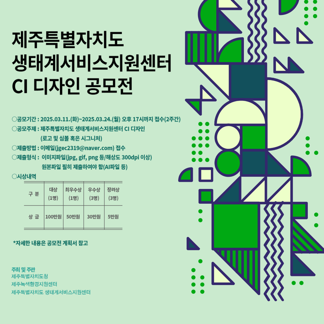 제주특별자치도 생태계서비스지원센터 CI 디자인 공모전 공모분야 디자인/캐릭터 접수기간2025.03.11 ~ 2025.03.24 D+330 종료 참가자격 제한없음 주최제주특별자치도청, 제주녹색환경지원센터 주관제주특별자치도 생태계서비스지원센터 1등상금(상품)100만원~199만원 홈페이지 바로가기 첨부파일 다운로드 유의사항 ※본 내용은 참고 자료로 내용의 오류와 변동에 대해 책임지지 않습니다. (오류 및 변동 신고는 상단의 '제안/오류' 신고를 통해 해주십시오.) ※주최사 사정에 따라 일정 및 내용이 변경될 수 있으니 주최사 홈페이지 등을 통해 관련 안내를 수시로 확인하시기 바랍니다. 상세내용 ■ 제목제주특별자치도 생태계서비스지원센터 CI 디자인 공모전 ■ 기간- 접수기간 : 2025. 3. 11.(화) ~ 3. 24.(월) 17시 마감 ■ 참가자격전 국민 누구나(개인, 단체 무관) ■ 참여방법 / 접수방법<출품부문> - CI 디자인 내용 : 제주특별자치도 생태계서비스지원센터 CI 디자인 · 제주형 생태계서비스 지불제와 잘 부합하는 디자인 · 최신 트렌드를 반영한 심미적인 디자인 · CI는 로고(한글 혹은 영어) 및 심볼 혹은 시그니처로 구성하여 디자인해야 함 <제출형식>응모신청서, 서약서, 개인정보 수집·이용 동의서, 원본파일 - CI 디자인은 이미지파일(jpg, gif, png 등)(로고 및 심볼, 시그니처) - JPG로 신청서 삽입 후 파일 별도 첨부(해상도 300dpi 이상) - 원본파일(AI파일 등) 필히 제출하여야 함 <제출방법> 제주특별자치도 생태계서비스지원센터에 접수 - 접수처 이메일 : jgec2319@naver.com - 문의전화(담당자) : 070-4850-8831 ■ 시상내용 / 혜택 - 대상 1명 : 100만원 - 최우수상 1명 : 50만원 - 우수상 3명 : 각 30만원 - 장려상 3명 : 각 5만원 ■ 유의사항- 우수상 이상의 공모작은 저작권을 포함한 지적재산권이 제주특별자치도로 귀속됨 - 심사 후 표절 시비가 발생했을 때는 시상 후에라도 수상 취소 및 환수 조치됨(표절로 인한 모든 법적 책임은 응모자에게 있음)- 다음 해당하는 다자인은 공모전에 출품할 수 없음 · 국내외 이미 공개된 디자인 · 다른 작품을 표절한 것으로 인정되는 디자인 - 제출된 서류 및 출품물은 일체 반환하지 아니함 ■ 문의070-4850-8831 목록