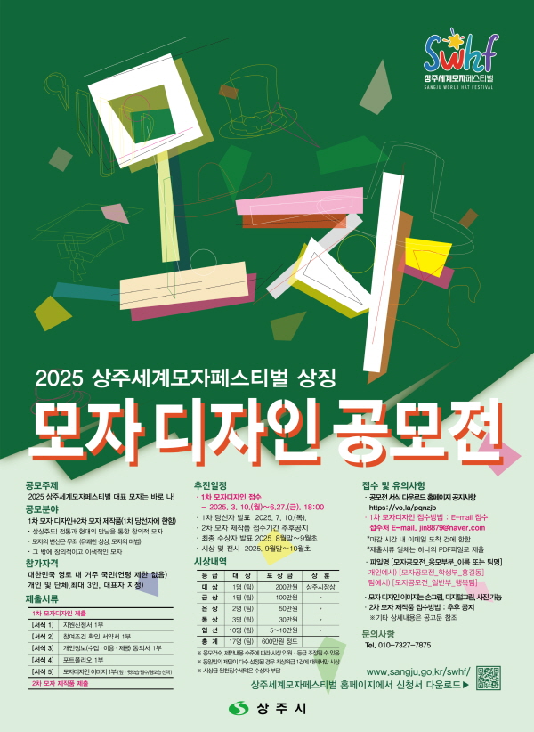 2025 상주세계모자페스티벌 상징(대표) 모자 디자인 공모전 공모분야 디자인/캐릭터 접수기간2025.03.10 ~ 2025.06.27 D+235 종료 참가자격 제한없음 주최경상북도, 상주시 1등상금(상품)200만원~499만원 홈페이지 바로가기 첨부파일 다운로드 유의사항 ※본 내용은 참고 자료로 내용의 오류와 변동에 대해 책임지지 않습니다. (오류 및 변동 신고는 상단의 '제안/오류' 신고를 통해 해주십시오.) ※주최사 사정에 따라 일정 및 내용이 변경될 수 있으니 주최사 홈페이지 등을 통해 관련 안내를 수시로 확인하시기 바랍니다. 상세내용 ■ 제목2025 상주세계모자페스티벌 상징(대표) 모자 디자인 공모전 ■ 기간 - 접수 기간 : 2025. 3. 10.(월) ~ 6. 27.(금) - 1차 결과 발표 : 2025. 7. 10.(목) ■ 참가자격 - 전 국민 누구나 (연령 제한 없음) - 개인 및 단체 (최대 3인, 대표자 지정) ■ 참여방법 / 접수방법● 공모분야: 축제 상징 모자 디자인 및 제작 <공모 주제> - 상상주도! 전통과 현대의 만남을 통한 창의적 모자 - 모자의 변신은 무죄 (유쾌한 상상, 모자의 마법) - 그 밖에 창의적이고 이색적인 모자 <제출서류>1) 지원신청서2) 참여조건 확인 서약서3) 개인정보 수집, 이용, 제공 동의서4) 포트폴리오5) 모자디자인 이미지 (앞, 뒷모습 필수 / 옆모습 선택)※ 1차 합격 시 모자 제작품 제출 - 양식은 홈페이지 공고에서 다운로드 <접수 방법> - 이메일 접수 : jin8879@naver.com - 접수서류 일체는 하나의 PDF파일로 제출 - 파일명 [모자공모전_응모부문_이름 또는 팀명]예시> [모자공모전_학생부_홍길동]※ 모자 디자인 이미지는 손그림, 디지털 그림, 사진 가능 ■ 시상내용 / 혜택 - 대상 1 : 200만원 및 상주시장상 - 금상 1 : 100만원 및 상주시장상 - 은상 2 : 각 50만원 및 상주시장상 - 동상 3 : 각 30만원 및 상주시장상 - 입선 10 : 5~10만원 및 상주시장상 ■ 유의사항- 동일인의 제안이 다수 선정된 경우 최상위 1건에 대해서만 시상- 축제장 공모 당선작 모자 전시 및 모자제작(선물 및 관련자 착용)- 2024년 공모전과 연계하여 모자 디자인 공모전 전시관 운영 ■ 문의 010-7327-7875 목록