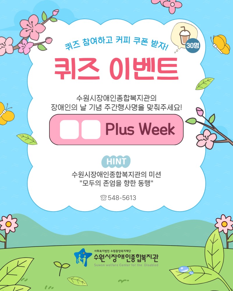 장애인의 날 기념 퀴즈 이벤트 접수기간2025.03.17 ~ 2025.04.23 D+300 종료 참가자격 제한없음 주최수원시장애인종합복지관 1등상금(상품)기타 홈페이지 바로가기 첨부파일 다운로드 유의사항 ※본 내용은 참고 자료로 내용의 오류와 변동에 대해 책임지지 않습니다. (오류 및 변동 신고는 상단의 '제안/오류' 신고를 통해 해주십시오.) ※주최사 사정에 따라 일정 및 내용이 변경될 수 있으니 주최사 홈페이지 등을 통해 관련 안내를 수시로 확인하시기 바랍니다. 상세내용 ■ 제목장애인의 날 기념 퀴즈 이벤트 ■ 개요제45회 장애인의 날 기념 주간 행사명을 맞춰주세요!참여 완료와 정답을 맞힌 분들 중 추첨을 통해 커피 쿠폰을 드립니다 ■ 기간 - 참여기간 : 2025년 3월 17일(월)~4월 23일(수) - 당첨자 발표 : 2025년 4월 25일(금) ■ 참가자격제한없이 누구나 ■ 참여방법 / 접수방법1) 수원시장애인종합복지관 인스타그램 팔로우!2) 이벤트 게시글에 좋아요 누르기!3) 이벤트 게시글에 정답 댓글 남기기!(친구 태그 시 당첨 확률 UP!) - 참여 방법을 완료하고 정답을 맞힌 분들 중 추첨을 통해 당첨자를 선정합니다. - 당첨자는 공지 후 개별 DM으로 연락드립니다. ● 링크 : https://www.instagram.com/p/DHFgOW1xuZT/?utm_source=ig_web_copy_link&igsh=MzRlODBiNWFlZA== ■ 참가 혜택추첨을 통해 3,000원 상당의 커피쿠폰 증정 (30명) 목록