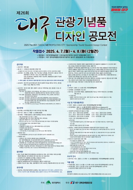 제26회 대구 관광기념품 디자인 공모전 공모분야 디자인/캐릭터 접수기간2025.04.07 ~ 2025.04.08 D+315 종료 참가자격 제한없음 주최대구광역시 주관대구경북공예협동조합 1등상금(상품)200만원~499만원 홈페이지 바로가기 첨부파일 다운로드 유의사항 ※본 내용은 참고 자료로 내용의 오류와 변동에 대해 책임지지 않습니다. (오류 및 변동 신고는 상단의 '제안/오류' 신고를 통해 해주십시오.) ※주최사 사정에 따라 일정 및 내용이 변경될 수 있으니 주최사 홈페이지 등을 통해 관련 안내를 수시로 확인하시기 바랍니다. 상세내용 ■ 제목제26회 대구 관광기념품 디자인 공모전 ■ 기간접수기간 : 2025. 4.7(월) ~ 4.8(화)【2일간】 ■ 참가자격제한 없음 - 1인당(2인공동포함) 2작품 이내 출품 가능※ 출품작 모두 동상 이상 선정 시 한 작품만 동상이상 선정하고 나머지는 입선이하로 선정함 ■ 참여방법 / 접수방법<공모대상> ‧ 민․공예품, 공산품, 가공․기능식품, 녹색상품, 하이브리드 상품 등 국내외 관광객들이구매 할 수 있는 모든 관광기념품․ 디자인 ‧ 국내ㆍ외 관광객이 저렴하게 구매가 가능하며, 대량생산과 유통이 가능한 관광기념품·디자인 ※ 캐릭터 상품은 기존 캐릭터의 사용허가를 득한 디자인 또는 응모자 본인이 창작한 캐릭터에 한함. <공모분야>대구지역 공모주제와 같이 대구의 문화적 특성을 테마로 하거나, 대구를 알릴 수 있는 제품 또는 디자인 <공모주제> 대구의 축제‧행사‧관광지‧산업 등 지역특색을 상징․홍보할 수 있는 것● 공모주제 예시 ‧ 자연자원: 대구근대골목, 마비정 벽화마을, 대구12경(http://tour.daegu.go.kr참고), 연꽃(반야월 연꽃 단지), 현풍백년도깨비시장, 서문시장, 신천 수달, 수성못 등 ‧ 역사‧문화: 경상감영공원, 국채보상운동, 대구근대역사관, 디아크, 모명재, 녹동서원 등 대구지역의 역사적 인물 등 ‧ 지역 산업: 대구약령시, 대구메디시티, 섬유스트림, 패션쥬얼리, 안경 및 의료산업 등 ‧ 축제․행사: 대구약령시 한방문화축제, 팔공산산중전통장터, 대구국제바디페인팅페스티벌, 대구국제뮤지컬페스티벌, 대구국제오페라축제, 비슬산 참꽃문화제, 대구치맥페스티벌, 파워풀대구페스티벌 등 ‧ 기타 : 도시브랜드(Powerful Daegu), 대구10味 등 대구를 대표하는 음식, 제과류 등 <접수안내> 응모제한, 유의사항을 확인 후 아래 구비서류 작성 제출(붙임 서식 참조) ▸접수방법 : 시제품(실물)또는 상품시안(패널) 우편 또는 현장접수 ☞작품 2점이내(세트로 된 경우 1~2세트) * 시제품(실물) 제출 시에 1작품 당 제품 제출 개수는 제한 없음. ☞상품시안만 제출할 경우 심사가 가능한 크기(규격 59.4×84.1㎝ 크기의 두께 3㎝이내의 패널 2매 이내)로 디자인한 출력물 ▸구비서류(제출된 서류는 일체 반환되지 않음) ① 참가신청서 ② 제품설명 및 상품화 실적 또는 계획서(제품사진(4×6인치, 칼라)) ③ 개인정보 수집·이용 동의서 ④ 출품작(시제품(실물)또는 상품시안(패널)) * 구비서류 확인, 타 공모전 출품 및 수상 경력 등 응모 제한 사항 확인 ▸현장접수 장소 - 대구문화예술회관 12전시실 (우:42672 대구광역시 달서구 공원순환로 201) ▸우편접수 장소 - 우편접수는 접수 마감일인 4월8일 18:00 도착분에 한함 - 대구ㆍ경북공예협동조합 (우:42672)대구광역시 달서구 공원순환로 46(두류동 588) 받는 사람 : 대구관광기념품·디자인공모전 담당자 앞 문의처: (053) 626-6131 ※ 우편(택배) 접수 시 포장된 상태로 보내야 하며 출품작의 파손, 분실 등에 대하여 책임을 묻지 않는다는 동의서와 개인정보동의서를 같이 첨부하여야함.(조합으로 문의) ※ 우편발송 시 출품작품, 참가신청서, 개인정보동의서 등 관련 서류를 동봉하여 등기발송을 권장함. 우편발송 후 접수여부는 반드시 유선으로 확인하여야 함(053-626-6131) ■ 시상내용 / 혜택 - 대상 1 : 상장 및 상금 300만원 - 금상 1 : 상장 및 상금 150만원 - 은상 2 : 상장 및 상금 100만원 - 동상 3 : 상장 및 상금 50만원 - 장려상 5 : 상장 및 상금 30만원 - 입선 약간명 : 상장 ■ 유의사항 이하 자세한 내용은 붙임파일 공고문을 참고해 주십시오. ■ 문의 053-626-6131 목록