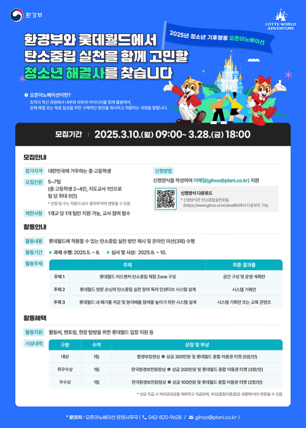 2025년 청소년 기후행동 오픈이노베이션 공모 공모분야 기획/아이디어/마케팅, 정책 제안, 대회/전시/제작 접수기간2025.03.10 ~ 2025.03.28 D+325 종료 참가자격 청소년 주최환경부 후원/협찬롯데월드 1등상금(상품)200만원~499만원 홈페이지 바로가기 첨부파일 다운로드 유의사항 ※본 내용은 참고 자료로 내용의 오류와 변동에 대해 책임지지 않습니다. (오류 및 변동 신고는 상단의 '제안/오류' 신고를 통해 해주십시오.) ※주최사 사정에 따라 일정 및 내용이 변경될 수 있으니 주최사 홈페이지 등을 통해 관련 안내를 수시로 확인하시기 바랍니다. 상세내용 ■ 제목2025년 청소년 기후행동 오픈이노베이션 공모 ■ 개요롯데월드에는 어트랙션 탑승 대기와 운영, 방문객의 이동 등에 있어 탄소중립을 실천할 수 있는 다양한 기회가 숨어있습니다.청소년의 아이디어와 기획으로 테마파크의 탄소 배출을 줄이고, 방문객과 함께 탄소중립을 실천해 나갈 수 있는 방안을 모색합니다. 오픈이노베이션이란 문제 해결 또는 목표 달성을 위한 구체적인 방안을 제시하고, 적용하는 과정을 말합니다. 오픈이노베이션을 통해 제안된 여러분의 아이디어와 실현 방안은 기업 전략에 반영되어, 지속 가능한 경영과 환경 문제 해결에 기여할 수 있습니다. 활동 주제 ① 롯데월드 어드벤처 탄소중립 체험ZONE 구성② 롯데월드 방문 손님의 탄소중립 실천 참여를 독려 인센티브 시스템 설계③ 롯데월드 내 폐기물 저감 및 분리배출 참여를 높이기 위한 시스템 설계 ■ 기간 모집 기간 : 2025. 3. 10.(월) 09:00 ~ 2025. 3. 28.(금) 18:00 결과 발표 : 2025. 4. 9.(수) 선발자 이메일 개별 발송 예정 활동 기간 : 2025. 5. ~ 8.(4개월간), 2025. 9. ~ 10. 심사 및 시상식 ※ 선발 후 팀 소개 제출 및 발대식(2025. 5. 9., 롯데월드) 참석 필수 ※ 활동 지역 : 롯데월드(서울 송파구 소재) / 온라인(탄소중립 실천포털) ■ 참가자격대한민국에 거주하는 중·고등학생 - 모집 인원 : 5~7팀(중·고등학생 2~4인, 지도교사 1인으로 팀 당 최대 5인) ※ 선발 팀 수는 지원서 심사 결과에 따라 변동될 수 있음 ※ 1개교 당 1개 팀만 지원 가능 ※ 팀 구성 시 동일 소속(학교)로만 구성하며, 지도교사 1인 필수 포함 ■ 참여방법 / 접수방법<활동 내용> 현장 탐방 등을 바탕으로 롯데월드의 탄소중립 활동 주제에 대한 아이디어와 해결 방안을 담은 제안서 제출, 정기 온라인 미션 수행 <지원 사항> - 활동 기간 중(5월~8월, 4개월 간) 1인 5만원/월 지급 ※ 발대식, 시상식 등 공식 행사 참가의 경우 교통비 지급 규정에 따라 실비 지급 - 기업 멘토와 함께하는 롯데월드 현장 견학 - 멘토링(중간점검)을 통한 아이디어(최종 결과물) 고도화 - 프로그램 참여시 소속된 학교에 협조공문 발송 등 <지원 방법> 모집 공고를 참고하여 이메일(gihoo@plani.co.kr) 지원 <제출 서류> 서식1~3(지원서, 개인정보 동의서, 출품작 제3자 공개·공유 동의서) ※ 수집된 개인정보는 ‘2025년 청소년 기후행동 오픈이노베이션’ 운영 목적 외에는 사용하지 않음 <지원서 작성 요령> - 서식 2, 3의 동의서는 지도교사가 서명하며, 팀원 전원이 동의한 것으로 간주함 - 작성 양식의 항목 및 형태 등은 수정할 수 없으며, 최종 제출 시 PDF형태로 제출 - 지원서 작성 분량(기본정보 최대 2장, 아이디어 제한서 최대 4장) 준수 - 오픈이노베이션 과제 중 택 1하여 해결 방안 제시(붙임1 참고) ■ 시상내용 / 혜택 구분수여상장 및 부상대상1팀환경부장관상 상금 300만 원 및 롯데월드 종합이용권 5장/인최우수상1팀한국환경보전원장상상금 200만 원 및 롯데월드 종합이용권 3장/인우수상1팀한국환경보전원장상상금 100만 원 롯데월드 종합이용권 2장/인 ※ 상금 지급 시 제세공과금을 제외하고 지급되며, 부상(종합이용권)은 상황에 따라 변동될 수 있음 ■ 문의오픈이노베이션 운영사무국(T. 042-820-9628 / E-mail. gihoo@plani.co.kr) 목록