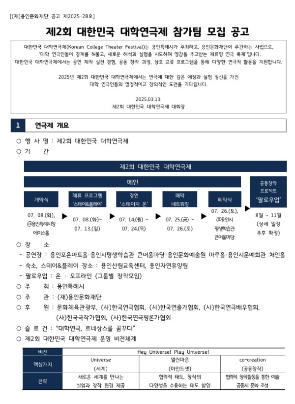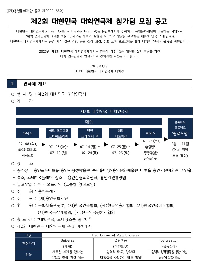 제2회 대한민국 대학연극제 참가팀 모집 (선정된 12팀 400만원 + 베스트 3팀 1천만원) 공모분야 대회/전시/제작, 기타분야 접수기간2025.03.25 ~ 2025.05.09 D+283 종료 참가자격 대학(원)생/청년 주최용인특례시 주관(재)용인문화재단 후원/협찬문화체육관광부, (사)한국연극협회 등 1등상금(상품)1천만원 초과 홈페이지 바로가기 첨부파일 다운로드 유의사항 ※본 내용은 참고 자료로 내용의 오류와 변동에 대해 책임지지 않습니다. (오류 및 변동 신고는 상단의 '제안/오류' 신고를 통해 해주십시오.) ※주최사 사정에 따라 일정 및 내용이 변경될 수 있으니 주최사 홈페이지 등을 통해 관련 안내를 수시로 확인하시기 바랍니다. 상세내용 ■ 제목제2회 대한민국 대학연극제 참가팀 모집 ■ 기간 - 접수 기간 : 2025. 03. 25.(화) ~ 05. 09.(금) 18:00까지 ■ 참가자격국내 대학 내 연극관련학과 공연예술학과공연 관련 정규동아리 등 - 학교당 접수팀 수 제한은 없으나 최종 12개 참가팀은 대학당 최대 2팀 선정 가능.※ 예) 서류 심사 결과 12개 참가팀 내 동일 대학 3팀 이상 포함된 경우총점이 가장 높은 2팀까지 선정. - 배우 및 주요 스태프(연출/감독)는 재학생으로 제한. 단, 장비를 다루는 스태프의 경우 졸업생, 휴학생 등이 객원으로 보조 지원 가능.※ 예) 작품의 조명감독은 반드시 재학생이어야 함 - 성별 혼합이 필요한 여자대학의 경우 타대학 남자배우를 섭외해 참여 가능. 단, 참가는 여자대학 단일팀으로만 가능. <참가작품> - 창작극, 번역극, 뮤지컬 등 60~90분 내외 ※ 참가작에 대한 저작권은 반드시 사전 확인해야 하며, 저작권법 위반으로 인한 모든 책임은 참가대학에 있음. ■ 참여방법 / 접수방법<접수방법> - 이메일 제출 (모든 자료를 1개 파일로 압축) - 메일 주소 : yicfkctf@gmail.com - 메일 제목 : [대학명] 참가신청_작품명 - 압축 파일명 : [대학명] 참가신청_작품명※ 참가신청서 및 모든 동의/서약서 내 직인을 찍어 원본 서류를 스캔(컬러)하여 파일로 제출 <제출서류>● 필수 제출서류 - 참가신청서 (서식1) - 공연계획서 (서식2) - 개인정보 수집 활용 동의서 (서식3) - 성희롱 성폭력 예방 실천 서약서 (서식4) - 공연대본 (넌버벌 장르일 경우 구성안 제출) - 공연 소개 PPT (PDF파일 / 공연 줄거리, 주제, 연출의도, 연출계획 등 포함) ● 추가 제출서류 (해당팀) - 저작재산권 사용 동의서 (서식 5) ※ 저작권이 필요한 경우 등 상세 내용은 공고문 참조 - 공연 영상 URL (유튜브 영상 URL) ※ 재연(필수) : 공연 전체 영상 / 초연(선택) : 공연 연습 영상 (1막 이상의 영상 권장) - 저작권 사용 동의서 제출 서약서 (서식 6 / 기간 내 저작재산권 증빙이 어려운 경우 작성) ■ 시상내용 / 혜택 - 선정팀 12팀 : 각 400만원 - Best 3 : 각 1,000만원 - 앙상블상, 네트워킹 상 5개 부문 : 각 200만원 ※ 선정팀에겐 공연장 무상 대관 - 셋업 2일, 공연 1일 1회, 공연 당일 철수 총 3일 - 야간(22:00~) 셋업 불가. 철수는 일정에 따라 야간 가능 ■ 유의사항○ 필수 및 제한사항- 필수사항 : 참가 작품 및 모든 소스는 저작권과 초상권을 침해해서는 안 되며, 관련 분쟁 발생 시 모든 책임은 참가팀이 부담함 - 제한사항 : 성범죄 혐의로 수사를 받거나 기소되어 판결이 확정되지 않은 자 중, 이로 인해 연극제 참가가 곤란하거나 불확실하다고 인정되는 자 / 성폭력 범죄로 형을 선고받거나 치료감호 처분을 받은 자 또는 해당자가 포함된 팀 ○ 기타 안내사항- 모든 제출서류는 양식에 맞게 작성하여 제출해야 하며, 접수기간 외에는 접수할 수 없음- 제출서류의 규격이 맞지 않거나 누락, 미비된 경우 심사대상에서 제외됨 - 참가 대학생 중심으로 연극을 만들어가는 본 연극제의 취지에 따라 지도교수 등 공연장 방문, 참관은 가능하나, 공연장 내 셋업, 리허설 현장에서 지도 불가. 위반 시 심사에서 제외되거나 수상 취소될 수 있음 - 참가 작품이 타인의 명예를 훼손하거나 음란물, 폭력물, 불법적인 내용을 포함할 경우 심사에서 제외될 수 있음 - 수상작은 주최, 주관사의 홍보 및 사업 등에 활용될 수 있으며, 원본 또는 차 저작물로 재제작되어 제작, 복제, 배포 등의 방식으로 사용될 수 있음. - 본선에 진출하거나 수상한 작품이라도 제출 자료 및 작품과 관련된 허위 사실 등이 밝혀질 경우 선정이 취소될 수 있음 - 참가팀의 본선 진출 시 지급되는 시상금 및 앙상블상은 대표자에게 지급되며, Best3상은 학교 연극 발전 장학금으로, 네트워킹상은 네트워킹팀 개인에게 지급됨. 또한 주최, 주관기관은 배분 문제에 관여하지 않음 ■ 문의 용인문화재단 대학연극제팀 T. 031-260-3330~1 M. yicfkctf@gmail.com ※ 월~금 9~18시 (공휴일 제외 / 점심시간 12~13시) 목록