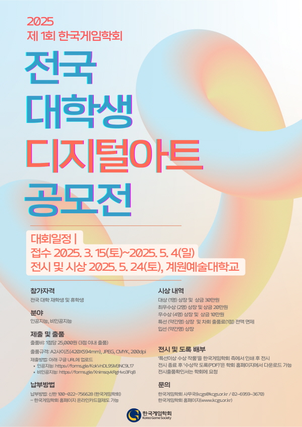 2025 제1회 한국게임학회 전국 대학생 디지털아트 공모전 공모분야 사진/영상, 웹툰/포스터/미술, 게임/어플/프로그램 접수기간2025.03.15 ~ 2025.05.04 D+288 종료 참가자격 대학(원)생/청년 주최한국게임학회 1등상금(상품)100만원 이하 홈페이지 바로가기 첨부파일 다운로드 유의사항 ※본 내용은 참고 자료로 내용의 오류와 변동에 대해 책임지지 않습니다. (오류 및 변동 신고는 상단의 '제안/오류' 신고를 통해 해주십시오.) ※주최사 사정에 따라 일정 및 내용이 변경될 수 있으니 주최사 홈페이지 등을 통해 관련 안내를 수시로 확인하시기 바랍니다. 상세내용 ■ 제목2025 제1회 한국게임학회 전국 대학생 디지털아트 공모전 ■ 기간 - 접수기간: 2025년 3월 15일(토) ~ 5월 4일(일)24:00까지 ■ 참가자격전국 대학 재학생 및 휴학생 누구나 ■ 참여방법 / 접수방법● 분야: 인공지능, 비인공지능 ● 작품접수비: 1점 25,000원(3점 이내 출품) - 납부방법: 신한 100-022-756628 (한국게임학회) - 한국게임학회 홈페이지 온라인 카드 결제도 가능 ● 제출 방법: 아래 구글 URL에 작품 업로드 - 인공지능: https://forms.gle/KokVnDL9SM3NC9L17 - 비인공지능: https://forms.gle/XnimsqvkRgHvo3Fq8 ■ 시상내용 / 혜택 - 대상 (1명) 상장 및 상금 30만원 - 최우수상 (2명) 상장 및 상금 20만원 - 우수상 (4명) 상장 및 상금 10만원 - 특선 (약간명) 상장 및 차회 출품료(1점) 전액 면제 - 입선 (약간명) 상장 ※ ‘특선이상 수상 작품’을 한국게임학회 측에서 인쇄 후 전시※ 전시 종료 후 ‘수상작 도록(PDF)’은 학회 홈페이지에서 다운로드 가능 ■ 문의 - 한국게임학회 사무국(kcgs@kcgs.or.kr / 02-6959-3670) - 한국게임학회 홈페이지(www.kcgs.or.kr) 목록