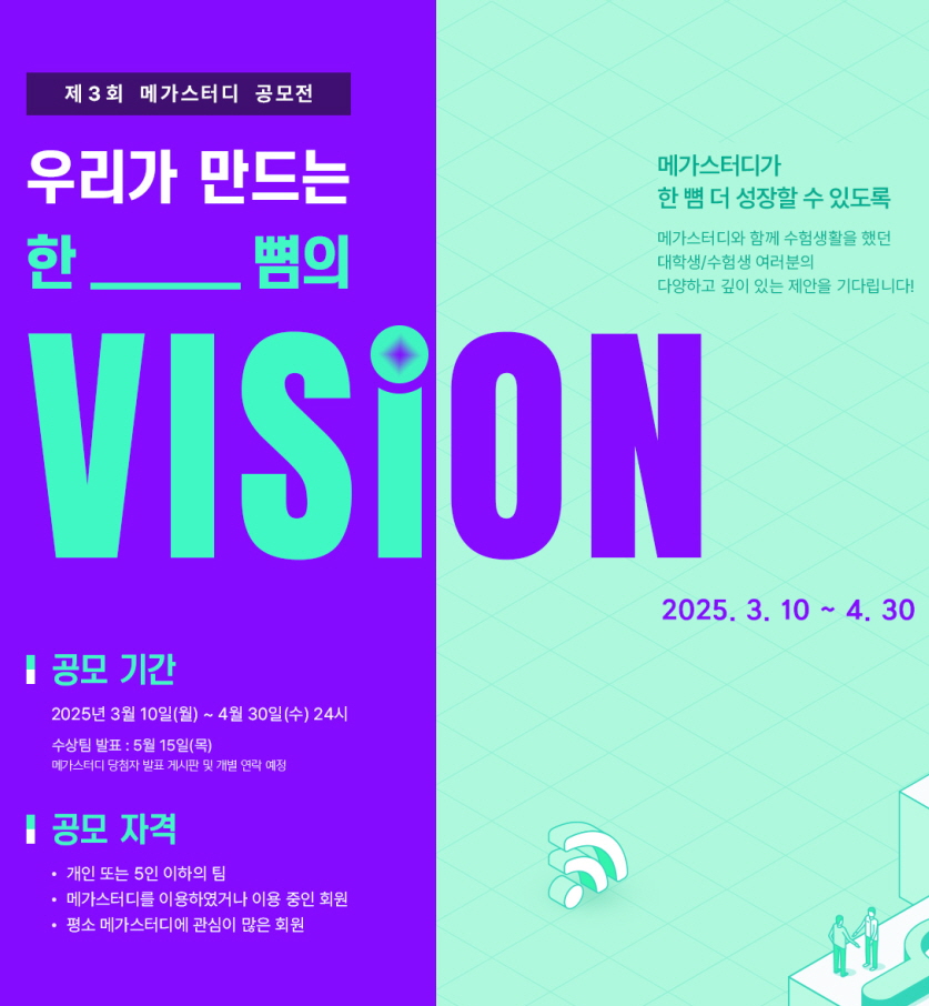 제3회 메가스터디 아이디어 공모전 우리가 만드는 한 뼘의 vision 공모분야 기획/아이디어/마케팅 접수기간2025.03.10 ~ 2025.04.30 D+292 종료 참가자격 기타 제한 주최메가스터디 1등상금(상품)200만원~499만원 홈페이지 바로가기 첨부파일 다운로드 유의사항 ※본 내용은 참고 자료로 내용의 오류와 변동에 대해 책임지지 않습니다. (오류 및 변동 신고는 상단의 '제안/오류' 신고를 통해 해주십시오.) ※주최사 사정에 따라 일정 및 내용이 변경될 수 있으니 주최사 홈페이지 등을 통해 관련 안내를 수시로 확인하시기 바랍니다. 상세내용 ■ 제목제3회 메가스터디 아이디어 공모전 우리가 만드는 한 뼘의 vision ■ 기간 - 접수 기간 : 2025년 3월 10일(월) ~ 4월 30일(수) 24시 - 결과발표 : 2025년 5월 15일(목) / 당첨자 발표 게시판 및 개별 연락 예정 ■ 참가자격 - 개인 또는 5인 이하의 팀 - 메가스터디를 이용하였거나 이용 중인 회원 - 평소 메가스터디에 관심이 많은 회원 ■ 참여방법 / 접수방법<공모 주제>더 나은 메가스터디를 위한 분야별 아이디어 - 메가패스 가치를 어필할 수 있는 제안 - 메가스터디 X AI 아이디어 제안 - 큐브 앱 이용자 증가를 위한 서비스 제안 - 학생에게 필요한 신규 서비스 제안 - 메가스터디 신규 회원 증대 마케팅 전략 - 수시 대비를 위한 메가스터디만의 서비스 제안 - 기타 제안 <접수 방법>공모전 홈페이지 (https://www.megastudy.net/Event/2025/0310_cp31415/main.asp) 에서 접수하기 클릭하여 접수 ■ 시상내용 / 혜택 - 대상 1팀 : 300만원 - 최우수상 3팀 : 100만원 - 우수상 5팀 : 50만원 - 장려상 15팀 : 10만원 ■ 유의사항 - 접수는 메가스터디 공모전 페이지를 통해서만 가능합니다. (대면 및 이메일 접수 불가) - 접수 가능한 파일 형태는 5mb 이하의 DOC, HWP, PPT, PPTX, PDF, JPG, BMP, ZIP, ALZ만 첨부 가능합니다. - 개인 또는 5인 이하로 구성된 팀으로 참여 가능합니다. - 메가스터디 회원만 접수 가능하며, 그 외 팀원은 비회원이어도 참여 가능합니다. - 공모전 진행 및 발표 일정은 사전 고지 없이 내부 사정에 의해 변동될 수 있습니다. - 수상팀은 5/15(목) 오후 메가스터디 공지사항 > 당첨자 발표 게시판에 공지되며, 발표 이후 개별 연락 예정입니다. - 상금 및 디지털 인증서는 대표 1인에게만 수여됩니다. - 안내된 상금은 세전 금액이며, 향후 제세공과금을 제외하고 지급됩니다. - 수상팀의 수상 서류에 대해 상금을 지급받은 경우 메가스터디에게 지식재산권의 통상 실시를 허락한 것으로 하며, 이에 대한 대가는 지급한 것으로 간주합니다. - 접수 이후 추가 서류 제출, 서류 교체는 불가합니다. - 접수 최종 마감시에는 시스템 오류나 접속에 어려움 등이 발생할 수 있으니 충분한 시간적 여유를 두고 접수해주시길 바랍니다. 목록
