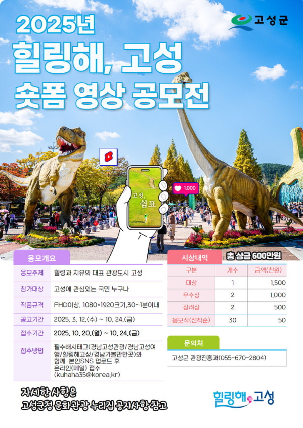 2025년 힐링해 고성 숏폼 영상 공모전 공모분야 사진/영상 접수기간2025.10.20 ~ 2025.10.24 D+114 종료 참가자격 제한없음 주최고성군 1등상금(상품)100만원~199만원 홈페이지 바로가기 첨부파일 다운로드 유의사항 ※본 내용은 참고 자료로 내용의 오류와 변동에 대해 책임지지 않습니다. (오류 및 변동 신고는 상단의 '제안/오류' 신고를 통해 해주십시오.) ※주최사 사정에 따라 일정 및 내용이 변경될 수 있으니 주최사 홈페이지 등을 통해 관련 안내를 수시로 확인하시기 바랍니다. 상세내용 ■ 제목2025년 힐링해 고성 숏폼 영상 공모전 ■ 개요심사기준 적합한 작품에 대해서 선착순 시상금도 지급하오니관광하기 좋은 고성의 모습을 영상 콘텐츠에 담아 고성관광을 널리 알리는데 동참해주세요 :) ■ 기간 - 접수기간: 2025. 10. 20.(월) ~ 10. 24.(금) 18:00까지 - 결과발표: 2025. 11. 중 * 누리집 게시 및 수상자 개별 통지 ■ 참가자격고성에 관심있는 대한민국 국민 누구나 ※ 단, 본인이 아닌 타인의 명의로 작품 제출 시, 수상 취소(상금 반환) ■ 참여방법 / 접수방법<공모분야> 힐링과 치유의 대표 관광도시 고성을 표현하는 30초~1분 이내의 짧은 영상 ※ 2025.1.1.이후 본인SNS 게시, 조회수 1,000회 이상 <출품수량> 개인 또는 팀당 1점 <출품조건> 2025년 1월 1일 이후 본인소유의 계정에 게시된 영상 - 특산물, 관광지, 축제, 체험 등 고성군의 매력을 표현한 영상 - 조회수 1,000회 이상, 공개 게시물 - 필수 해시태그: #경남고성관광 #경남고성여행 #힐링해고성 #경남가볼만한곳 <출품규격> - FHD이상, 세로 형태의 영상/ 가로 1080 × 세로 1920 (9:16 비율) - MP4, AVI 파일/ 영상 길이는 30초~1분 이내(제목, 크레딧 제외) - 제3자의 초상권을 침해하지 않아야 하며, 인물식별이 가능한 작품일 경우 초상권 사용 동의서 제출 필수 - BGM(음원) 사용, 자막, 서체 저작권 등 법적 문제 없이 사용 가능하여야 함 <접수방법> - 이메일 접수: kuhaha35@korea.kr - 이메일 제목: 힐링해, 고성 숏폼 공모전_이름(팀명) - 파일명: 힐링해, 고성 숏폼 공모전_작품명_이름(팀명) <제출서류> 원본 파일, 참가신청서(서약서, 활용동의서 등), 초상권자 사용동의서(해당자만), 1,000회 재생 증빙 화면저장 파일 (한글파일의 경우 스캔본 1부로 제출) ■ 시상내용 / 혜택 - 대상 1 : 150만원 - 우수상 2 : 각 100만원 - 장려상 2 : 각 50만원 - 응모작 30 : 각 5만원 (선착순, 심사기준 적합자) ■ 유의사항가. 응모작품은 국내․외에 발표된 적이 없는 순수 창작물이어야 하며, 다음의 결격사유가 있는 경우에는 심사에서 제외함. 또한, 수상 후에도 위반사실이 밝혀졌을 경우에는 수상 취소 및 지급된 상금은 반환하여야 함 - 타 공모전 수상작, 명의도용, 컴퓨터 그래픽 이미지, 타 작품을 표절하거나 합성한 것으로 인정되는 경우 - 공공질서 또는 미풍양속에 저해되는 경우 - 특허권, 상표권, 저작권, 초상권 등 관련 법규에 따른 법적 분쟁이 있는 경우 등 - 드론 촬영 출품작 중 촬영·비행 불가 지역 등에서 무단 촬영일 경우 등 나. 응모작품의 초상권, 저작권 등 민․형사상 모든 법적책임은 응모자에게 있음 다. 입상한 작품에 대한 저작권은 응모자에게 있으며, 고성군은 수상작에 한하여 비영리, 공익적 목적으로 SNS 게시 등 고성군 홍보를 위해 사용할 수 있음 라. 고성군은 수상작에 대해 공고된 상금이나 부상을 지급함으로써 정당한 대가를 지급하는 것으로 간주하며, 수상작에 대한 저작재산권(복제권, 공중송신권, 전시권, 배포권, 대여권 등)을 이용할 권리를 가지며, 입상자와 별도의 이용 허락을 얻어 2차적 저작물을 작성할 수 있음 마. 드론 촬영 시에는 운항 및 항공촬영과 관련한 법 규정을 반드시 준수할 것 ※ 드론원스톱 민원서비스 이용 또는 부산지방항공청(☏051-974-2155) 문의 바. 제출한 서류는 일체 반환하지 않으며, 기재한 사항이 사실과 다를 경우 입상을 취소하고, 상장 및 시상금을 회수함 사. 기타 정하지 않은 사항 발생 시 관련 법규, 일반적인 사례, 대한민국 공모전 운영의 통상적인 관례 등을 참고하여 주최 측의 결정에 따름 ■ 문의고성군청 관광진흥과 관광정책담당자 (☎055-670-2804) 목록