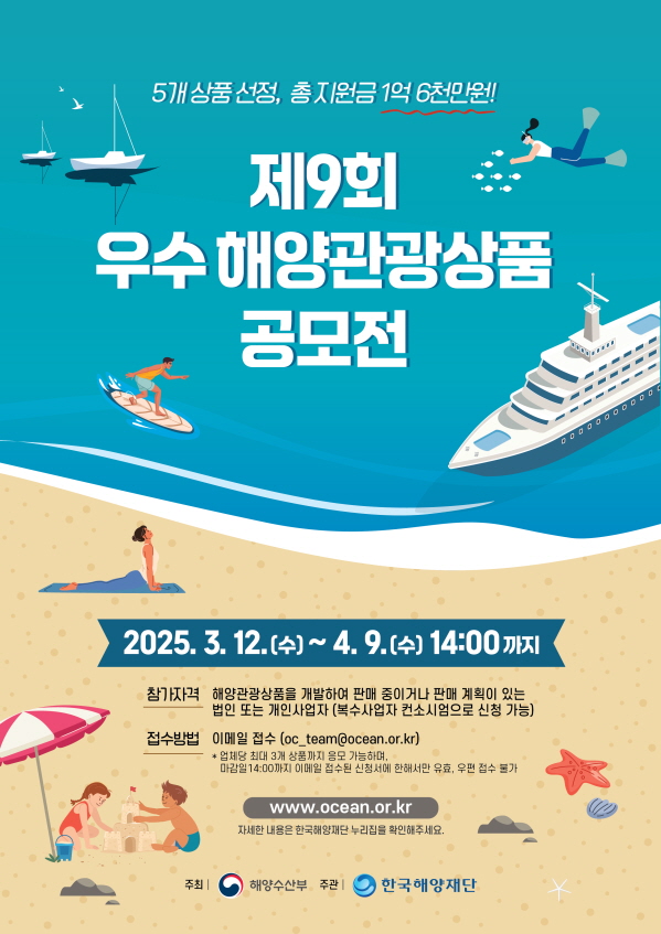 2025년 우수 해양관광상품 공모전 공모분야 디자인/캐릭터, 대회/전시/제작, 기타분야 접수기간2025.03.12 ~ 2025.04.09 D+312 종료 참가자격 기타 제한 주최해양수산부 주관(재)한국해양재단 1등상금(상품)1천만원 초과 홈페이지 바로가기 첨부파일 다운로드 유의사항 ※본 내용은 참고 자료로 내용의 오류와 변동에 대해 책임지지 않습니다. (오류 및 변동 신고는 상단의 '제안/오류' 신고를 통해 해주십시오.) ※주최사 사정에 따라 일정 및 내용이 변경될 수 있으니 주최사 홈페이지 등을 통해 관련 안내를 수시로 확인하시기 바랍니다. 상세내용 ■ 제목2025년 우수 해양관광상품 공모전 ■ 기간 - 공모기간 : 2025. 3. 12.(수) ~ 4. 9.(수) 14:00까지 ■ 참가자격해양관광상품을 개발하여 판매 중이거나 판매 계획이 있는 법인 또는 개인사업자(복수사업자 컨소시엄 가능) * 컨소시엄은 최대 2개까지 가능 ■ 참여방법 / 접수방법<공모분야> 섬ㆍ무인도, 해수욕장, 어촌, 해양레저ㆍ생태체험 관광, 인바운드 등 다양한 연안지역의 특성화된 해양자원 등을 활용한 관광상품- 해양레저 : 해양레저, 스포츠 등을 활용한 상품 - 어촌·섬 : 어촌과 섬의 다양한 해양자원을 활용한 상품- 신 해양관광 : 해양치유, 크루즈, 마리나, 수중레저 등 핵심 해양레저관광 산업과 연계한 상품- 인바운드 : 외래 여행객을 대상으로 한 해양레저 체험 및 해양관광 상품- 융·복합 : 해양관광과 내륙관광 등 이종 분야 간의 콘텐츠 결합 상품- 기타 : 5개 분야 외에 포함되지 않는 특색있는 해양관광 상품 * 업체당 최대 3개 상품까지 응모 가능** 응모 가능한 상품은 여행 및 레저 등 체험형 상품 또는 축제 상품이며 판매를 위해 제작되는 물품은 미포함 <접수방법>- 이메일 접수 : 한국해양재단 누리집(www.ocean.or.kr)에서 제출 서류 양식을 다운 받아 (재)한국해양재단 이메일(oc_team@ocean.or.kr)로 접수- 마감일(4. 9.(수) 14:00)까지 이메일 접수만 유효, 우편 또는 방문 접수 불가* 접수 시 메일 제목 : 제9회 우수 해양관광상품_업체명_상품명** 파일 제출시 참가신청서, 상품설명서, 요약본, 서약서, 동의서 모두 각각 pdf 파일로 변환하여 제출 <제출서류>● 서류심사 제출서류ㆍ참가신청서 1부ㆍ상품설명서 1부ㆍ상품설명서 요약본 1부ㆍ업체개요 1부ㆍ서약서 1부ㆍ협업기관의 사업 참여 동의서 1부(해당자에 한함)ㆍ개인정보 수집ㆍ활용 동의서 1부ㆍ사업자등록증 1부 ● 발표심사 제출서류 (서류심사 합격자만 제출)ㆍPT 발표자료(상품설명서 기준)ㆍ최근 3개 년도 결산서(공인회계사 날인본 혹은 세무서 발급 표준재무제표 증명) 1부ㆍ납세증명서(국세, 지방세) * 개인사업자는 대표자명, 법인사업자는 법인명으로 발급된 것만 인정 / 공고일 이후 발급본으로 미·체납 사실이 없어야 함(사업자만 제출) ※ 제출된 서류는 일체 반환하지 않으며, 단계별 심사 후 파기 ■ 시상내용 / 혜택- 사업화 지원금 30,000천원 지급 및 최우수 상품에 대해 추가 10,000천원 지원- 해양관광 및 사업 운영 관련 맞춤형 컨설팅 제공- 상품 운영 현장 전문가 컨설턴트 - 간담회 개최 등을 통한 업계 사업자 네트워킹 ■ 유의사항- 본 공모전에 최종 선정된 이후라도 심사 제외 대상 항목에 해당하는 사유가 발견될 시 즉시 선정을 취소할 수 있으며 기 지원금은 회수 조치되고 기지원된 사항에 대해 손해배상을 청구할 수 있음- 제출서류의 모든 항목은 채점기준이 되며, 일부 항목을 미작성하여 제출할 시 심사과정에서 불이익이 있을 수 있음- 제출된 서류는 일체 반환하지 않음- 공모에 동일인이 다수 응모한 경우, 심사결과에 따라 최상위 1건만 선정 가능함- 본 공모요강에 제시되지 않은 사항은 주최 및 주관 측의 해석에 따름- 공모전 공고일 기준, 3년 이내 동일 및 유사한 상품으로 재단 및 타 기관으로부터 수혜를 받았거나, 수혜 예정인 상품은 중복 수혜자로 간주하여 선정 제외- 선정된 우수 해양관광상품의 계획 및 운영 관련하여 발생하는 모든 민·형사상 문제에 대해 해양수산부 및 (재)한국해양재단은 관여 또는 책임지지 않음- 우수 해양관광상품 인증기간 중 여행피해 신고, 불법·부정행위(무자격 가이드 고용, 보험 미가입 등) 적발 시 우수 해양관광상품 인증 즉시 취소, 지급된 지원금은 환수될 수 있음 ■ 문의 (재)한국해양재단 문화사업팀(02-741-5278 목록