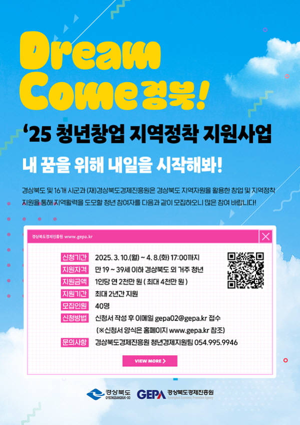 DREAM COME 경북 2025 청년창업 지역정착 지원사업 공모분야 창업/사업 지원, 기타분야 접수기간2025.03.10 ~ 2025.04.08 D+313 종료 참가자격 제한없음, 기타 제한 주최경상북도 주관경상북도경제진흥원 1등상금(상품)1천만원 초과 홈페이지 바로가기 첨부파일 다운로드 유의사항 ※본 내용은 참고 자료로 내용의 오류와 변동에 대해 책임지지 않습니다. (오류 및 변동 신고는 상단의 '제안/오류' 신고를 통해 해주십시오.) ※주최사 사정에 따라 일정 및 내용이 변경될 수 있으니 주최사 홈페이지 등을 통해 관련 안내를 수시로 확인하시기 바랍니다. 상세내용 ■ 제목DREAM COME 경북 2025 청년창업 지역정착 지원사업 ■ 개요경북 청년인구 유입을 위해 지역자원을 활용하여 경북 도내 창업 및 지역정착으로 지역경제 활성화에 기여하는 청년 창업가 육성ㅇ 지역사회 문제해결,지역자원 활용 등 창의적인 아이템이 실제 사업화로 연계될 수 있도록 사업화자금 및 정착활동비,교육·멘토링,청년 간 네트워킹 등 지원 ■ 기간 - 신청기간: 2025.03.10.(월) ~04.08.(화) 17:00까지 - 서류 심사 합격자 발표예정일: 4.15. - 대면심사 대상자 사전교육 : ’25.4.17. ∼ 4.18. *서류심사 합격자에 한하여 운영 - 대면 심사 : ’25.4.23. ∼ 4.25. ■ 참가자격경상북도 지역사회 발전에 이바지할 자질이 있고,혁신적인 사업 아이디어 보유 및 지속적인 활동의지가 있는 자여야 하며,협약 전(일부사항은 운영기관이 지정한 날)까지 운영지침에서 규정하고 있는 자격을 갖춘 자①만 19세 이상 만 39세 이하(’1985.01.02.∼’2006.01.01.)의대한민국 국민으로서 사업참여 배제 사유가 없는 자 ※2025.01.01.기준- 신청자는 최초 공고일 전일 기준 경상북도 외에 주소*를 두어야 함* 주소지는 주민등록등본 상 주소지를 의미함- 경상북도 내 주소지를 둔 청년은 경상북도 외 지역 거주자와 함께 팀으로써 참여 가능 ② 개인 또는 팀별(최대 2인) 참여 가능- 경상북도 내 주소지를 둔 청년은 단독으로 참여할 수 없으며, 경상북도 외 지역에 주소지를 둔 청년과 팀을 구성하여 지원 가능- 단, 팀을 구성하여 신청할 경우 선정 이후에는 반드시 공동대표로 사업자 등록을 완료해야 하며, 부득이한 경우에는 대표자 1인이 구성원을 고용하는 형태로 고용보험에 가입해야 함 - 기 취(창)업자는 사업선정 후 퇴사(폐업) 조건으로 참여가능하며, 협약체결일로부터 1개월 이내에 퇴사(폐업)해야 한다. * 기 창업자의 경우 기존사업과 동일 업종으로 사업장을 단순 이전하는 경우, 폐업 이후에도 참여 불가능함 ■ 참여방법 / 접수방법 <접수방법>○ 이메일접수 : gepa02@gepa.kr* 신청서 제출 시 e-mail 제목명 : [지역정착신청서]-[신청지역]-[팀명] ㅇ (신청 시·군)공고문상 시·군별 모집인원을 확인하여, 1개 지역을선택하여 신청하도록 함-중복지원은 원칙적으로 불가하며,심사과정에서 해당 내용이 확인될경우 중복 시·군 모두 신청이 취소됨 신청서류는 홈페이지 공고문 참조 ■ 시상내용 / 혜택1인당 연간 2천 만원 (최대 2년간 지원하며, 2차년도는 전년도 사업평가를 통해 지원 확정)- 1년차 : 사업화 자금, 정착활동비(월 60만원 한도 내) 지원*정착 활동비의 경우 1인 최대 500만원 한도로 지급- 2년차 : 사업화 자금 ■ 유의사항기타 상세한 자격, 신청 방법, 지원 내용, 유의사항은 홈페이지 공고문 참조 바랍니다. ■ 문의○ 사업 및 신청서 작성 문의 : 청년경제 지원팀 ☎ 054-995-9946, (E-mail) gepa02@gepa.kr○ 본 공고와 관련하여 이의사항이 있는 경우에는 사업부서 및 진흥원 홈페이지 (고객의소리)를 통하여 의견을 제시할수 있음 목록