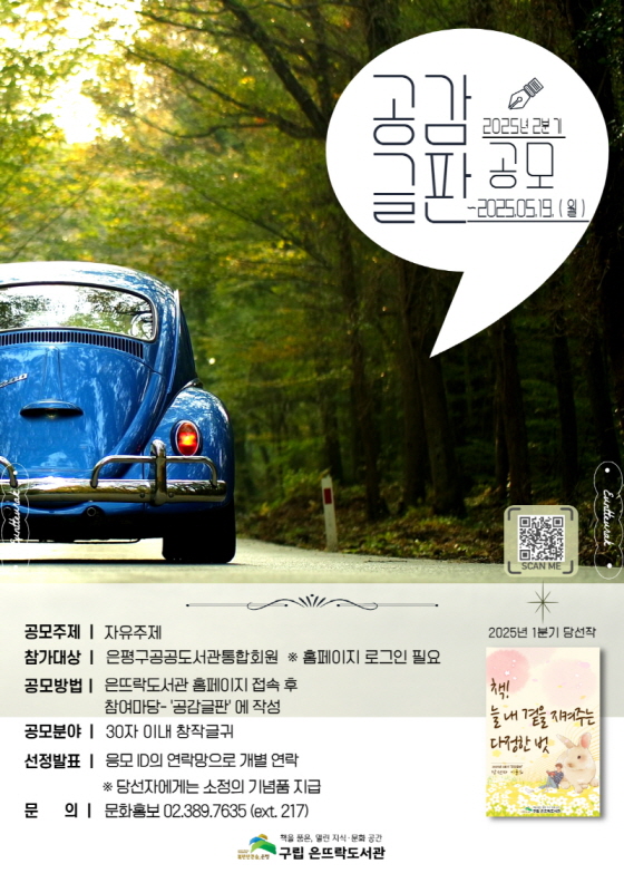 은뜨락도서관 2025년 2분기 공감글판 창작글귀 공모 공모분야 문학/시나리오, 논문/수기/사례, 기타분야 접수기간2025.03.14 ~ 2025.05.19 D+272 종료 참가자격 제한없음 주최은뜨락도서관 1등상금(상품)기타 홈페이지 바로가기 첨부파일 다운로드 유의사항 ※본 내용은 참고 자료로 내용의 오류와 변동에 대해 책임지지 않습니다. (오류 및 변동 신고는 상단의 '제안/오류' 신고를 통해 해주십시오.) ※주최사 사정에 따라 일정 및 내용이 변경될 수 있으니 주최사 홈페이지 등을 통해 관련 안내를 수시로 확인하시기 바랍니다. 상세내용 ■ 제목은뜨락도서관 2025년 2분기 공감글판 창작글귀 공모 ■ 개요이웃의 마음에 울림을 주는 메시지, 2025년 2분기 [공감글판] 글귀를 공모합니다. 당선된 글귀는 대형현수막으로 제작되어 은뜨락도서관 건물 외벽에 설치됩니다. 여러분의 메시지를 보내주세요! ■ 기간 - 접수 기간 : ~2025.05.19(월) ■ 참가자격은평구 공공도서관 통합회원 ※ 홈페이지 로그인 필요 ■ 참여방법 / 접수방법● 공모주제 : 자유주제 ● 공모분야 : 30자 이내의 창작글귀 ● 공모방법 : 은뜨락도서관 홈페이지 접속 후 참여마당- '공감글판' 에 작성 - 공감글판 : https://www.edlib.or.kr/parti/event_comment.asp ■ 시상내용 / 혜택당선자에게는 소정의 기념품 지급 ※ 선정발표 : 응모ID의 연락망으로 개별연락 ■ 문의02)389-7635 (내선217) 목록