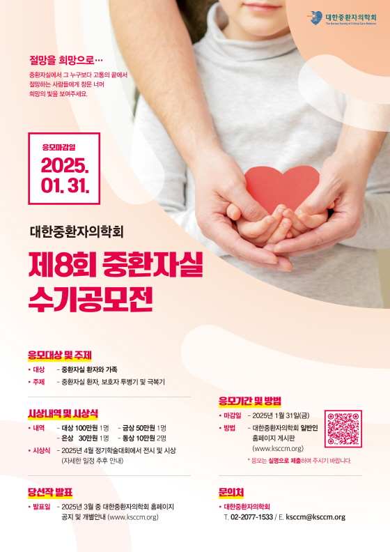 대한중환자의학회 제 8회 중환자실 수기공모전 공모분야 문학/시나리오, 기타분야 접수기간2024.12.04 ~ 2025.01.31 D+378 종료 참가자격 기타 제한 주최대한중환자의학회 1등상금(상품)100만원~199만원 홈페이지 바로가기 첨부파일 다운로드 유의사항 ※본 내용은 참고 자료로 내용의 오류와 변동에 대해 책임지지 않습니다. (오류 및 변동 신고는 상단의 '제안/오류' 신고를 통해 해주십시오.) ※주최사 사정에 따라 일정 및 내용이 변경될 수 있으니 주최사 홈페이지 등을 통해 관련 안내를 수시로 확인하시기 바랍니다. 상세내용 ■ 제목대한중환자의학회 제 8회 중환자실 수기공모전 ■ 기간 ~2025년 1월 31일(금)까지 <발표>2025년 3월 중 대한중환자의학회 홈페이지 공지 및 개별안내 ■ 참가자격- 중환자실 환자와 가족 ■ 참여방법 / 접수방법<공모주제>- 중환자실 환자, 보호자 투병기 및 극복기 <접수방법>- 대한중환자의학회 일반인 홈페이지 게시판 (www.ksccm.org)※ 응모는 실명으로 제출하여 주시기 바랍니다. ■ 시상내용 / 혜택- 대상 100만원 1명- 금상 50만원 1명- 은상 30만원 1명- 동상 10만원 2명 ※ 시상식 : 2025년 4월 정기학술대회 전시 및 시상 예정 (자세한 일정 추후 안내) ■ 문의- 대한중환자의학회 : TEL. 02-2077-1533 / ksccm@ksccm.org 목록