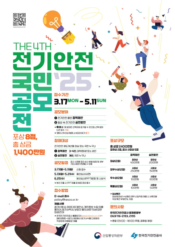 2025년 제4회 전기안전 국민 공모전 공모분야 기획/아이디어/마케팅, 정책 제안 접수기간2025.03.17 ~ 2025.05.11 D+279 종료 참가자격 제한없음 주최산업통상자원부 주관한국전기안전공사 1등상금(상품)200만원~499만원 홈페이지 바로가기 첨부파일 다운로드 유의사항 ※본 내용은 참고 자료로 내용의 오류와 변동에 대해 책임지지 않습니다. (오류 및 변동 신고는 상단의 '제안/오류' 신고를 통해 해주십시오.) ※주최사 사정에 따라 일정 및 내용이 변경될 수 있으니 주최사 홈페이지 등을 통해 관련 안내를 수시로 확인하시기 바랍니다. 상세내용 ■ 제목2025년 제4회 전기안전 국민 공모전 ■ 개요 한국전기안전공사는 국민이 생각하는 전기재해 예방과 체계적인 전기안전관리 방안에 대한 의견을 수렴하고, 이를 바탕으로 제도발굴 및 정책실현을 위해 ‘2025년 제4회 전기안전 국민 공모전’을 다음과 같이 공고합니다. 국민 여러분의 많은 관심과 참여 부탁드립니다. ■ 기간 - 공모기간 : 2025. 3. 17(월) ~ 5. 11(일) 24:00까지 - 결과 발표 : 5.23(금) / 한국전기안전공사 홈페이지 게시 및 개별통보 - 온라인 설명회 : 5.28(수) / 오리엔테이션 실시(Webex이용) - 국민참여투표 : 6.13(금) ~ 6.20(금) / 본선심사 진출작 투표 - PT 심사 : 6.25(수) / 한국전기안전공사 본사에서 진행(전북 혁신도시) ■ 참가자격전기안전 제도개선에 관심 있는 국민 누구나 - (구분) ①정책제안(3~4인, 대학(원)생 또는 성인), ②실천방안(개인, 국민 누구나) ■ 참여방법 / 접수방법<공모분야> ①전기안전 열린 정책제안, ②일상속 전기안전 실천방안 분 야항 목세 부 내 용①전기안전 열린 정책제안전기설비 안전강화▪국가 취약·중요시설, 산업시설, 다중이용시설, 옥외시설 등 전기안전 품질 제고 및 안전기반 조성 방안 등 신·재생E전기설비 안전확보▪환경변화에 따른 태양광, 풍력, 해양에너지, 에너지저장장치(ESS) 등에 대한 전기안전제도 및 기준 강화 방안 등 ▪신·재생E 전기안전 글로벌 선도 및 협력 등을 위한 정책제안 등디지털 기술 활용예방시스템▪전기안전관리체계 고도화 및 비상대응체계 마련 방안 등 ▪전기안전진단 및 검사·점검 방법 등 개선 정책제안분 야세 부 내 용②일상속 전기안전 실천방안▪가정, 학교, 직장, 상업시설, 옥외시설물 등에서 발생할 수 있는 일상생활과 밀접한 전기안전 예방 방안 등 ▪전기안전문화 확산·정착 및 전기안전 대국민 홍보 방안 등 <신청방법> 신청서, 아이디어 제안서 등을 작성하여 이메일 접수 ㅇ (위치) 공사 홈페이지(www.kesco.or.kr) - [열린경영] - [공지사항]에서 공모전 제출서류 다운 및 작성 후 이메일 제출(policy@kesco.or.kr) * 제출서류 : 참가신청서, 아이디어 제안서, 개인정보 수집·이용 동의서, 참가서약서, 보호자 동의서(만 19세 미만 미성년자 해당) <참가방법> 2개 분야(①정책제안, ②실천방안) 중 1개 분야만 응모 가능 ㅇ (접수) 선택 분야는 다건 접수 허용 / 단, 상위 1건만 본선 진출 * (참가제한) 1명이 2개 이상 팀에 소속하여 참가 불가 ■ 시상내용 / 혜택포상규모 : 장관상 2점, 공사 사장상 6점, 상금 총 1,400만원 구 분대상(2점)최우수상(2점)우수상(2점)특별상(2점)①정책제안장관상,400만원사장상,250만원사장상,150만원사장상,100만원②실천방안장관상,200만원사장상,150만원사장상,100만원사장상,50만원 * (장관상) 전기안전대상 행사 시 시상 / ‘25.9.10 ※입상특전 : 대상(장관상)팀의 경우 신입직원 채용 시 서류전형 우대(가점 5%) ■ 유의사항 ㅇ 대내·외 환경변화 등의 사유로 일정 진행 및 방식 등은 불가피하게 변경될 수 있음 ㅇ 수상작은 홈페이지, SNS, 자료집 등에 홍보 등의 목적으로 활용될 수 있음 ㅇ 응모작품의 소유권, 저작권, 지적재산권 등은 그 이용에 법적인 문제가 전혀 없는 것이어야 함 ㅇ 응모작품의 소유권, 저작권, 지적재산권, 명예훼손 등 분쟁 발생 시 모든 민ㆍ형사상의 책임은 응모자에게 있으며, 입상된 이후라도 이와 같은 사실이 밝혀질 경우 해당 작품 수상 취소 및 상금이 환수됨 ㅇ 심사점수는 비공개로 하며, 심사결과에 대해 이의 제기할 수 없음 ㅇ 접수 마감일 이후 내용 변경 및 제출은 불가하며, 심사결과 작품 완성도에 따라 수상인원을 조정할 수 있으며, 적합한 작품이 없을 경우 수상작을 선정하지 않을 수도 있음 ㅇ 기타 공모전에 관한 전반적인 사항은 주최·주관기관 내부 방침을 따름 ■ 문의한국전기안전공사 법제운영부 063)716-2193, 2195 * (작성 가이드) 공모전 신청 서류 작성 [붙임 1, 2] 참고 목록