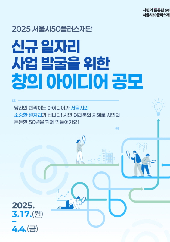 2025년 서울 중장년 신규 일자리 발굴 창의 아이디어 제안 공모 공모분야 기획/아이디어/마케팅, 정책 제안 접수기간2025.03.17 ~ 2025.04.04 D+316 종료 참가자격 지역한정 주최서울시 50플러스포털 1등상금(상품)100만원 이하 홈페이지 바로가기 첨부파일 다운로드 유의사항 ※본 내용은 참고 자료로 내용의 오류와 변동에 대해 책임지지 않습니다. (오류 및 변동 신고는 상단의 '제안/오류' 신고를 통해 해주십시오.) ※주최사 사정에 따라 일정 및 내용이 변경될 수 있으니 주최사 홈페이지 등을 통해 관련 안내를 수시로 확인하시기 바랍니다. 상세내용 ■ 제목2025년 서울 중장년 신규 일자리 발굴 창의 아이디어 제안 공모 ■ 개요서울시50플러스재단에서 ‘중장년 일자리’ 분야 창의 아이디어 제안을 공모합니다. ■ 기간 - 공모기간 : 2025. 3. 17.(월)~4. 4.(금) 18시까지 - 결과발표: 2025.4.14.(월) 17:00 예정 ※ 50플러스포털 내 공고 및 개별연락 ■ 참가자격서울시민 누구나(수상자에 한하여 주민등록 정보에 대해 확인 절차를 거쳐 허위로 판명될 경우, 수상을 취소할 수 있음) ■ 참여방법 / 접수방법<공모주제> 서울시 4060시민의 경력 활용 및 노후준비를 위한 신규 일자리 아이디어 공모 (*시장형, 공공형 일자리 및 직무훈련 프로그램 등)*시장형 일자리: 별도의 공공자금 투입 없이 기업이 구직자를 채용하고, 급여를 제공하는 일자리*공공형 일자리: 기업이 구직자를 채용하되, 급여의 일부 또는 전액을 공공자금으로 지원하는 일자리*직무훈련 프로그램: 기업이 요구하는 직무능력을 갖출 수 있도록 직무훈련 교육과정을 설계하여 구직자에게 제공하는 프로그램 <공모 제출 서류 작성> - 첨부 ① 개인정보 수집․이용 동의서 1부 - 첨부 ② 제안서 1부 <공모 규격> - 제안서 : A4 1~3매 이내 한글파일(HWP) 또는 워드파일 ※ JPG, PDF 등 다른 양식 제출 불가 - 개인정보수집·이용동의서 : 스캔본을 파일 형식 무관하게 제출 - 맑은고딕 12pt, 장평 100%, 줄간격 160% 등 정해진 양식(첨부파일) 준수 <서류제출> - 제출방법: 이메일 제출(bs@seoul50plus.or.kr) - 첨부 1~2의 제출서류를 1개의 폴더(zip)로 압축하여 이메일(bs@seoul50plus.or.kr)로 제출 ※ 파일명 : 시민_이름_핸드폰뒷번호.hwp (예시: 시민_홍길동_1234.hwp) - 메일 발송 완료 후, ‘정상 접수’ 확인 메일이 수신되지 않았을 경우 안내처(02-460-5064)로 문의 ■ 시상내용 / 혜택최우수상(1명, 부상 50만원), 우수상(2명, 부상 25만원), 장려상(5명, 부상 10만원) ※ 작품 건수 및 심사 결과에 따라 당선작 일부를 선정하지 않을 수 있음※ 중복 응모·시상 가능※ 상금은 전원 지역화폐(서울사랑상품권)로 지급하며, 상금의 제세공과금은 본인 부담(세금 4.4% 공제한 금액 지급, 25만원 이하 비과세 ■ 유의사항ㅇ 수상작은 서울시50플러스재단의 신규 추진사업으로 검토할 예정입니다.ㅇ 수상작의 저작권은 응모자에게 귀속됨을 원칙으로 합니다. ㅇ 응모자는 응모와 동시에 추후 수상 시 공모전 요강에 기재되어 있는 이용방법 및 조건의 범위 안에서 수상작의 비영리 목적 사용을 허락한 것으로 보며, 수상작의 저작재산권에 대한 이용료는 입상에 따른 시상금으로 대체합니다.ㅇ 서울시50플러스재단은 수상작에 한하여 본질적인 내용을 변경하지 않는 범위 내에서 수상작의 일부를 편집하여 사용할 수 있습니다.ㅇ 응모자는 타인의 지식재산권을 표절․도용하지 않아야 합니다.ㅇ 부정행위 발견 시 심사에서 제외되며, 시상 이후라도 수상 취소 및 상금의 환수가 있을 수 있습니다.ㅇ 심사위원회는 내·외부 전문가들로 구성하여 공정하게 심사하며, 심사위원 명단 및 구체적인 심사 내용은 공개하지 않습니다.ㅇ 본 공모전 일정과 내용은 서울시50플러스재단의 상황에 따라 변경될 수 있습니다.ㅇ 1인 다수작 응모·시상이 가능합니다 ■ 문의서울시50플러스재단 사업전략팀 : 02-460-5064 목록