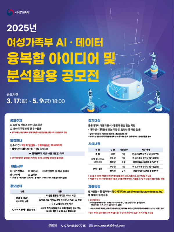 2025년 여성가족부 AI·데이터 융복합 아이디어 및 분석 공모분야 기획/아이디어/마케팅 접수기간2025.03.17 ~ 2025.05.09 D+281 종료 참가자격 제한없음 주최여성가족부 1등상금(상품)200만원~499만원 홈페이지 바로가기 첨부파일 다운로드 유의사항 ※본 내용은 참고 자료로 내용의 오류와 변동에 대해 책임지지 않습니다. (오류 및 변동 신고는 상단의 '제안/오류' 신고를 통해 해주십시오.) ※주최사 사정에 따라 일정 및 내용이 변경될 수 있으니 주최사 홈페이지 등을 통해 관련 안내를 수시로 확인하시기 바랍니다. 상세내용 ■ 제목2025년 여성가족부 AI·데이터 융복합 아이디어 및 분석 ■ 기간 - 접수기간 : 3월 17일(월) ~ 5월 9일(금) 18:00까지 - 결과발표 및 시상 : 6월 2일(월) 이후 ■ 참가자격공공데이터 이용과 분석·활용에 관심 있는 국민 - 대학생·대학원생 또는 직장인, 일반인 등 제한 없음 - 일반국민의 경우 개인 또는 5인 이내 팀으로 신청가능 - 데이터는 공공데이터포털 등에 등록된 여성가족부 정책 관련 데이터 1건 이상 활용 필수 ■ 참여방법 / 접수방법<공모주제>① 창업 및 서비스 아이디어 제안② 데이터 직접분석 및 우수활용※ 공모주제는 여성가족부 정책(가족/청소년/양성평등/인권보호) 관련 분야로 한정 <공모분야>1. 창업 및 서비스 아이디어 부문AI 등을 활용한 대국민 서비스 제안모바일 App 서비스 개발 등의 신규 비즈니스 창출신규 수요 데이터 개방 제안 2. AI, 데이터 분석·활용 부문사회적 현안 해결을 위해 AI를 활용한 분석 또는 데이터 직접분석 및 우수 활용사례 <제출서류>(양식은 홈페이지 ‘공모전 소개’ 게시글에서 다운로드)① 참가신청서② 제안서③ 개인정보 및 제공 동의서④ 서약서⑤ 요약본• 요약본은 파워포인트 20쪽 이내 발표형식 요약보고서로 제출(별도 양식 없음) <필수 기재사항>작성 가이드를 토대로 아래 기재사항에 대해 모든 공모분야 공통으로 공모 제안서 내 필수 작성 - 공모 제목 : 공모 내용에 기반한 제목 기재 - 제안 목적 : 해당 아이디어나 서비스를 제안하는 목적 또는 이유 기재 - 활용 데이터 : 공공데이터포털 개방데이터셋명, 민간데이터 이용 시 해당 데이터명 - 예상 수요처 : 제안하는 서비스 또는 아이디어의 직접적인 예상 수혜자 또는 수요자 - 제안 세부내용 : 활용데이터 상세 구성, 데이터 또는 서비스 연계, 서비스 구성 및 제공 등 상세 내용 - 이해 관계자 : 제공주체, 활용주체, 수요주체, 수혜계층 등 주요 이해관계자 역할·책임 - 고려사항 : 제안 내용의 구체적이고 현실적인 실행을 위해 요구되는 선결사항 또는 요구사항 - 기대효과 : 제안 내용을 통해 예상되는 정성적 또는 정량적 기대효과 <제출방법>참가신청서 등 첨부하여 접수페이지(https://mogefdatacontest.co.kr/)를 통해 신청서 접수 ※ 심사제외 대상- 타 경진대회에서 이미 채택된 아이디어이거나, 기본 구상이 매우 흡사한 경우 (여성가족부 ′23년 이전 참가작 또는 유사작 포함)- 타인이 취득한 특허권, 실용신안권, 디자인권, 저작권에 속하거나, 단순히 국내외 사례를 모방 또는 표절한 경우※ 심사 후라도 공모 제한사유에 해당할 경우 수상이 취소되거나 상금이 회수 처리될 수 있음※ 공모전 주관기관에서는 응모된 작품에 대한 참가 증빙 등 일체의 문서를 발급하지 않습니다. ■ 시상내용 / 혜택 - 통합 대상 1점 : 여성가족부 장관상 및 300만원 ● 창업 및 서비스 아이디어 / 분석·활용 2개 부문 - 각 부문 우수상 1점 : 여성가족부 장관상 및 100만원 - 각 부문 장려상 2점 : 여성가족부 장관상 및 50만원 ※ 직접분석 및 우수사례 예선 통과 작품은 심사를 위해 분석코드 제출을 요구할 수 있음 (미제출 시 입상 제외) ■ 유의사항- 동일 신청인의 신청 건수는 1건으로 한정합니다.- 제출된 서류 일체는 반환하지 않습니다.- 유사 또는 중복 제안은 제출한 순서를 기준으로 우선 순위를 정합니다.- 접수 이후 공개된 아이디어는 지식재산권을 보호받을 수 없으며, 이를 보호받기 위해서는 참가자가 접수하기 전에 직접 지식재산권을 획득하여야 합니다.- 동일 아이디어로 타 기관 창업경진대회 또는 공모전 등에 입상하였거나, 타인의 저작권 등 지식재산권을 침해한 경우 심사 대상에서 제외되며, 시상 이후 밝혀질 경우 시상 무효 처리 및 포상금 환수 조치를 할 수 있습니다.- 심사결과에 따라 시상 계획 및 인원이 축소되는 등 수상 인원이 변동될 수 있으며, 제세공과금은 수상자 본인이 부담하여야 합니다.- 참가자는 심사결과에 이의를 제기할 수 없으며, 평가결과표 등 심사 관련 자료는 공개하지 않습니다.- 응모된 아이디어의 법적 분쟁에 관한 문제가 발생할 경우, 이에 모든 법적 책임은 신청인에게 있으며, 주최·주관은 이와 관련한 분쟁에 대한 책임을 지지 않습니다. ■ 문의공모전 운영단 - 070-4140-7715 - song.meraki@li-st.com 목록