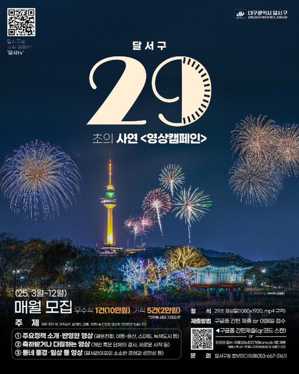 달서구 29초의 사연 영상 캠페인 모집 공모분야 사진/영상 접수기간2025.03.07 ~ 2025.12.31 D+39 종료 참가자격 지역한정 주최대구광역시 달서구 1등상금(상품)100만원 이하 홈페이지 바로가기 첨부파일 다운로드 유의사항 ※본 내용은 참고 자료로 내용의 오류와 변동에 대해 책임지지 않습니다. (오류 및 변동 신고는 상단의 '제안/오류' 신고를 통해 해주십시오.) ※주최사 사정에 따라 일정 및 내용이 변경될 수 있으니 주최사 홈페이지 등을 통해 관련 안내를 수시로 확인하시기 바랍니다. 상세내용 ■ 제목달서구 29초의 사연 영상 캠페인 모집 ■ 개요달서구 주요 정책을 포함한 여러분의 일상 이야기 혹은 재미있는 우리동네 이야기를 담은 29초의 사연 영상을 모집하오니 많은 참여 바랍니다. ■ 기간 - 접수 기간 : 2025. 3. ~ 12월 (상시 모집) - 결과 발표 : 매월 초 개별 통보(sms) 및 달서구청 공식sns 게시 ■ 참가자격달서구민 또는 달서구에 관심이 많거나 직장·대학 등 생활 기반이 있는 대구시민 누구나(개인 또는 팀) ■ 참여방법 / 접수방법<공모주제>① 주요정책을 소개·반영한 영상(결혼친화, 아동·출산, 스마트, 녹색도시 등)예시) 신혼부부, 출산 가정이 실제 지원 받는 혜택(출산지원금 육아혜택) / 탄소중립실천, 나무심기, 기후위기식단 실천 등 / 주민들이 실천하는 작은 친환경 행동(다회용기 사용, 분리배출, 자전거 타기 등) ② 축하하거나 다짐 받는 영상(개인·단체의 경사, 새로운 시작 등)예시) 새로 이사 온 주민, 개업한 가게, 결혼·출산 등 축하받을 일 소개 / 생일, 입학, 취업, 승진 등 개인적인 경사를 재치있게 편집한 영상 / 부녀회, 동호회, 청년창업팀, 봉사단체 등의 다짐 영상 ③ 동네 풍경·일상 등(달서라이프의 소소한 경험과 생활상)예시) 주민들이 직접 촬영한 출근길, 시장, 공원 산책 등 달서구의 일상모습 / 각 동네의 매력을 소개하는 짧은 브이로그 형식 / 우리동네 맛집, 멋집 소개 / 달서구의 반려동물 문화와 펫 프렌들리 공간 소개 <공모형식> 29초 분량, 1080*1920(9:16) 해상도의 영상(mp4, wmv 등) <제출방법>신청서류 및 원본영상 이메일 접수(kyj1009@korea.kr) 혹은 구글폼 간편접수> https://url.kr/pr5pnv ■ 시상내용 / 혜택우수작 1건(10만원), 가작 5건(2만원 상당 기프티콘) ■ 문의달서구청 홍보미디어과(053-667-3161) 목록