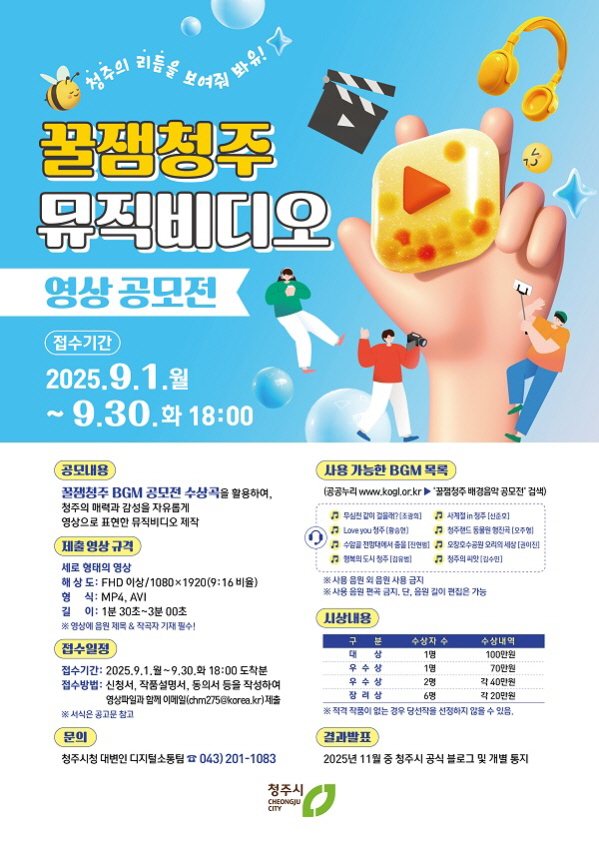 꿀잼청주 뮤직비디오 영상 공모전 공모분야 사진/영상 접수기간2025.09.01 ~ 2025.09.30 D+130 종료 참가자격 제한없음 주최청주시 주관청주시 1등상금(상품)100만원~199만원 홈페이지 바로가기 첨부파일 다운로드 유의사항 ※본 내용은 참고 자료로 내용의 오류와 변동에 대해 책임지지 않습니다. (오류 및 변동 신고는 상단의 '제안/오류' 신고를 통해 해주십시오.) ※주최사 사정에 따라 일정 및 내용이 변경될 수 있으니 주최사 홈페이지 등을 통해 관련 안내를 수시로 확인하시기 바랍니다. 상세내용 ■ 제목꿀잼청주 뮤직비디오 영상 공모전 ■ 기간- 접수기간 : 2025. 9. 1.(월) ~ 9. 30.(화) 18:00까지 ■ 참가자격- 청주에 관심 있는 누구나(개인 또는 팀별 참가) ※ 1인(1팀) 1점의 작품만 응모 가능 ※ 타 공모전에 출품하지 않은 순수 창작물 ※ 공모의 취지를 반영하여 AI 사용 영상물 자제 ■ 참여방법 / 접수방법<공모내용> 꿀잼청주 BGM 공모전 수상곡을 활용하여, 청주의 매력과 감성을 자유롭게 영상으로 표현한 뮤직비디오 <접수방법> - 이메일(chm275@korea.kr) - 메일 제목 ‘꿀잼청주 뮤직비디오 공모전 출품작_OOO(이름 또는 팀명)’ <제출서류> 참가신청서(작품설명서, 동의서 등) 및 동영상 파일 제출 【서식 1,2,3,4】 <제출규격> - FHD 이상, 세로 형태의 영상 1,080(가로) × 1,920(세로) (9:16 비율) - MP4, AVI 파일 - 영상 길이 1분 30초 ~ 3분 00초 - 제작 영상 화면에 사용 음원 곡명 및 작곡가 기재(필수) 예) 무심천 같이 걸을래?_조광희 <사용음원> 공공누리 사이트(www.kogl.or.kr) –‘꿀잼청주 배경음악 공모전’검색 - 무심천 같이 걸을래?_조광희(3분 8초) - 사계절 in 청주_신준호(2분 22초) - Love you 청주_황승현(2분 40초) - 청주랜드 동물원 행진곡_오주형(2분 28초) - 수암골 전망대에서 야경을 보며 춤을_진현범(2분 26초) - 오창호수공원 오리의 세상_권이진(2분 30초) - 행복의 도시 청주_김유범(1분 38초) - 청주의 씨앗_김수민(3분 4초) ※ 사용 음원 외 음원 사용 금지 ※ 사용 음원 편곡 금지 단, 음원 길이 편집은 가능 ■ 시상내용 / 혜택 구 분시상인원시상금훈 격대 상1명(팀)1,000,000원청주시장최우수1명(팀)700,000원“우 수2명(팀)각 400,000원“장 려6명(팀)각 200,000원“ ■ 유의사항1. 응모작은 순수 창작물이어야 하며, 타 공모전에서 수상한 작품이나 타인의 창작물을 도용해 저작권 침해가 우려되는 작품은 선정에서 제외합니다. 만일 도용 확인 시 수상 이후에라도 수상 취소되며 상금은 환수 조치합니다.2. 출품작과 관련한 저작권침해, 초상권 침해 문제가 발생할 경우 모든 법적ㆍ 도의적 책임은 본인에게 있습니다.3. 수상작에 대한 저작권은 출품자와 합의를 통하여 청주시가 양도받을 수 있으며, 양도할 의사가 없는 수상작에 대한 수상은 취소될 수 있습니다. 4. 출품작은 청주시 유튜브 및 블로그, 인스타그램 등 온라인상 게시할 수 있으며, 2차 저작물로 변형하여 활용할 경우, 수상자와의 별도 협의를 거친 후 진행합니다. 5. 제출된 작품 및 관련 서류는 반환하지 않습니다. 하지만 출품자가 저작물의 반환을 요구할 경우 반환하며, 반환과 관련한 비용이 발생하면 출품자가 부담합니다.6. 출품자는 응모와 동시에 추후 입상 시 공모전 수상작 활용계획에 기재되어 있는 내용 범위 안에서 저작물(입상작) 이용을 허락한 것으로 보고, 입상작의 저작재산권에 대한 이용료는 입상에 따른 시상금으로 대체합니다. 7. 1인(팀) 1작품만 출품 가능하며, 모든 작품은 참가자가 직접 제작한 작품이어야 합니다.8. 수상작 상금에 대한 제세공과금은 수상자가 부담합니다. 9. 팀 수상 시 상장 및 상금은 대표자 1인에게 전달하며, 그 외사항에 대하여 주최 측은 관여하지 않습니다.10.주제 및 파일 규격 등 공모 내용에 맞지 않은 작품과 기술적 결함이 있는 작품은 심사 대상에서 제외합니다.11. 응모작품 수 및 수준에 따라 상금, 상격, 수상 인원 등이 변동 될 수 있습니다. ※ 심사 결과에 따라 수상작이 선정되지 않을 수 있음.12. 수상자에 대해 개인정보를 추가 요청할 수 있습니다.13. 수상자의 잘못된 정보입력으로 인한 연락 누락 등의 경우 수상 결정 후에도 수상이 취소될 수 있습니다.14. 공모전에서 저작권 관련 분쟁이 발생한 경우, 응모자 및 주최자는 한국저작권위원회에 조정을 신청할 수 있으며, 양 당사자는 원활한 분쟁해결을 위해 상호 노력해야 합니다. 15. 일정과 시상 내용은 일부 변경될 수 있으며, 변경 사항은 청주시 누리집‘공고’란에서 확인할 수 있습니다. ■ 문의청주시청 대변인 디지털소통팀 ☎ 043-201-1083 목록