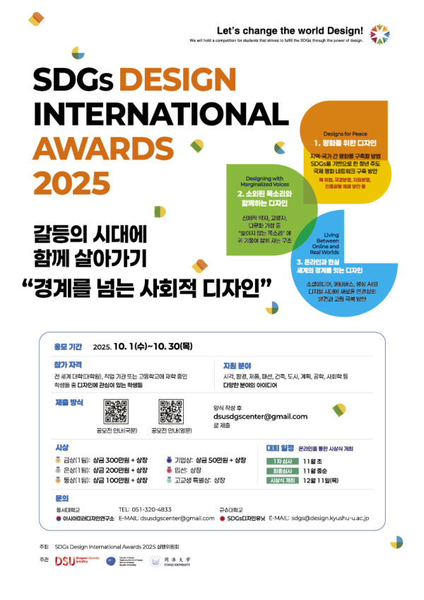 SDGs Design International Awards 2025 공모분야 웹툰/포스터/미술, 디자인/캐릭터 접수기간2025.10.01 ~ 2025.10.30 D+99 종료 참가자격 대학(원)생/청년, 청소년 주최SDGs Design International Awards 2025 실행위원회 주관한국 동서대학교, 일본 규슈대학교, 중국 동제대학교 1등상금(상품)200만원~499만원 홈페이지 바로가기 첨부파일 다운로드 유의사항 ※본 내용은 참고 자료로 내용의 오류와 변동에 대해 책임지지 않습니다. (오류 및 변동 신고는 상단의 '제안/오류' 신고를 통해 해주십시오.) ※주최사 사정에 따라 일정 및 내용이 변경될 수 있으니 주최사 홈페이지 등을 통해 관련 안내를 수시로 확인하시기 바랍니다. 상세내용 ■ 제목SDGs Design International Awards 2025 ■ 개요‘SDGs Design International Awards’는 지속가능한 사회를 위한 세계 청년들의 창의적인 디자인 아이디어를 발굴하고, 사회 혁신의 동력으로 삼는 방법을 모색하기 위해 기획되었습니다. 올해로 7회를 맞는 본 Awards의 주제는 <갈등의 시대에 함께살기 - “경제를 넘는 사회적 디자인”>입니다. 이는 경제적 효율성 중심의 기존 시스템을 넘어, 인간 중심의 포용적이고 지속가능한 사회를 위한 디자인을 모색하는 데 중점을 두고 있습니다. ‘SDGs Design International Awards’는 2019년부터 매년 개최되어, 아시아를 비롯해 전 세계 15개국 내외의 청년 디자이너들이 참가하고 있습니다. 매년 약 200여 점 이상의 작품이 접수되며, 지속가능한 미래를 위한 창의적 디자인 아이디어의 장으로 자리매김하고 있습니다. 지구 곳곳에서 일어나는 갈등의 해결, 사회의 소외된 목소리에 귀 기울이는 따뜻함, 디지털 시대의 새로운 연결과 인간성 회복에 관한 다양한 생각을 나눌 수 있을 것입니다. 본 어워드는 여러분의 높은 정신과 재능을 환영하고 기리고자 합니다. 미래 세대의 주인공인 청년 여러분의 많은 관심과 참여를 부탁드립니다. ■ 기간 - 응모 기간 : 2025년 10월 1일(수)~10월 30일(목) - 시상식 개최 : 12월 11일(목), 온라인으로 진행 ■ 참가자격전 세계 대학(대학원)생, 직업 기관 또는 고등학교에 재학 중인 학생들 ■ 참여방법 / 접수방법SDGs Design International Awards 2025 주제 : 갈등의 시대에 함께살기 “경제를 넘는 사회적 디자인” 1. 평화를 위한 디자인(Designs for Peace)지역·국가 간 평화를 구축할 방법(핵 위협, 영토분쟁, 자원분쟁, 인종갈등 해결 방안)SDGs를 기반으로 한 청년 주도 국제 평화 네트워크 구축 방안 2. 소외된 목소리와 함께하는 디자인(Designing with Marginalized Voices)신체적 약자, 고령자, 다문화 가정 등 "보이지 않는 목소리"에 귀 기울여 함께 사는 구조 3. 온라인과 현실 세계의 경계를 잇는 디자인(Living Between Virtual and Real Worlds)소셜미디어, 메타버스, 생성 AI의 디지털 시대에 새로운 연결성의 발견과 고립 극복 방안 <제출방식> 공모전 지원양식 작성 후 dsusdgscenter@gmail.com 로 제출 ■ 시상내용 / 혜택 - 금상 (1팀) : 상금 300만원 + 상장 - 은상 (1팀) : 상금 200만원 + 상장 - 동상 (1팀) : 상금 100만원 + 상장 - 기업상 : 상금 50만원 + 상장 - 입선 : 상장 - 고교생 특별상 : 상장 ■ 문의 - 전화 : 051-320-4833(Korea) 동서대학교 아시아미래디자인연구소 dsusdgscenter@gmail.com(Japan) 규슈대학교 SDGs디자인유닛 sdgs@design.kyushu-u.ac.jp 목록