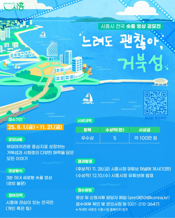 시흥시 전국 숏폼 영상 공모전 - 느려도 괜찮아, 거북섬 공모분야 사진/영상 접수기간2025.08.01 ~ 2025.11.21 D+77 종료 참가자격 제한없음 주최시흥시 주관시흥시 1등상금(상품)100만원~199만원 홈페이지 바로가기 첨부파일 다운로드 유의사항 ※본 내용은 참고 자료로 내용의 오류와 변동에 대해 책임지지 않습니다. (오류 및 변동 신고는 상단의 '제안/오류' 신고를 통해 해주십시오.) ※주최사 사정에 따라 일정 및 내용이 변경될 수 있으니 주최사 홈페이지 등을 통해 관련 안내를 수시로 확인하시기 바랍니다. 상세내용 ■ 제목시흥시 전국 숏폼 영상 공모전 - 느려도 괜찮아, 거북섬 ■ 기간 - 접수기간 : 2025. 8. 1.(금) ~ 2025. 10. 21.(금) ※ 마감일 18:00까지 ■ 참가자격시흥에 관심이 있는 전국민, 등록외국인 누구나!개인 또는 팀 모두 참여 가능 ■ 참여방법 / 접수방법<공모내용> ‘해양레저관광 중심지로 성장하는 거북섬과 시화호의 다양한 매력’을 담은 모든 이야기 - 타 지역과 차별화된 시흥 거북섬, 시화호의 자연경관, 생태환경, 레저활동, 관광자원 등 다양한 주제와 자유로운 형식의 영상 제작 ※ 시화호 및 거북섬에 대한 자세한 정보는 시흥시 누리집 참고 (https://www.siheung.go.kr/sihwaho30th) <영상형식> 3분 이내 세로형 숏폼 영상 (mp4, mov파일 등/ FHD급) - 숏드라마, 뮤직비디오, 영화, 브이로그, 패러디, 애니메이션 등 장르 불문 마. 참여자격 : 시흥시에 관심이 있는 전국민(개인 혹은 팀) - 지역 및 연령 제한 없음 - 개인 또는 팀으로 선택하여 응모 가능(중복 응모 불가능) <참여조건> - 참가자의 개인 SNS(인스타그램, 유튜브, 블로그, 페이스북 등)에 해시태그(#시흥시#거북섬)를 달아 출품작을 게시 - 최종 결과 발표일까지 게시 상태를 유지 <접수방법> 영상 원본 파일, 신청서류 일체를 메일로 제출 - 메일 제목에 ‘느려도 괜찮아, 거북섬 전국 숏폼 영상 공모전(참가자 또는 팀명)’ 표기 - 제출 파일형식 구 분영상규격길이파일 형식세로형1080×1920(9:16)3분 이내FHD급MP4, MOV, AVI <신청서류> ①참가신청서, ②개인정보 수집·이용 동의서, ③서약서 - 서류 미제출 시 심사 제외(동의 체크 및 서명·날인 누락 시 미제출로 간주) - 팀 참가 시 전원 ②개인정보 수집·이용 동의서, ③서약서 제출 요망 - 미성년자의 경우 법정대리인 기재란 반드시 기재 <제출처> 담당자 이메일(snr0810@korea.kr) ■ 시상내용 / 혜택 항 목수상작 수상 금우수상5편각 100만원 ※ 수상자에게는 개별 작품 성격 및 메시지를 반영한 상명을 부여할 예정 ■ 유의사항 - 응모작은 타 공모전에 출품되지 않은 본인의 순수 창작물이어야 합니다. - AI 생성영상, 타인의 영상 클립 활용 등 2차 저작물 형태는 불가합니다. - 작품 제출 후 수정 및 재접수는 불가합니다. 다만 제출서류 등이 미흡할 경우 주최 측이 보완 요구할 수 있습니다. - 신청서 기입 오류 및 미작성 등으로 연락 불가 시 시상에서 제외됩니다. - 접수는 출품자가 담당자 이메일로 제출하며, 제출된 이메일 주소로 접수 완료 회신을 드립니다. 필요 시 홍보담당관(031-310-3647)으로 전화하여 접수 여부를 직접 확인하시기 바랍니다. ※ 메일 전송 실패, 첨부파일 누락, 접수 확인 누락 등 접수 과정에서 발생하는 모든 책임은 출품자에게 있습니다. - 작품 전체 또는 일부가 이미 유포된 것이거나 타 공모전 수상작일 경우, 심사에서 제외되며 시상 후에라도 취소 및 상금 환수 조치합니다. - 응모작은 초상권, 지식재산권, 운항·항공 촬영 등 관련 법령을 준수하여 제작된 것이어야 합니다. - 초상권·지식재산권(저작권, 음원, 폰트, 이미지 등) 일체는 법적인 문제가 없는 것이어야 하며, 음원 제목과 출처를 밝혀야 하는 경우 명시해야 합니다. - 제3자의 초상권 및 타인의 명예 훼손, 지식재산권 침해, 타인의 저작물 및 명의도용으로 확인될 시 심사에서 제외되며 시상 후에라도 취소 및 상금 환수 조치합니다. - 응모작 관련 분쟁 발생 시, 일체의 법적·도의적 책임은 응모자에게 있습니다. - 공고 내용 및 미공시 부분에 관한 사항은 시흥시의 해석을 따르고, 공정한 심사를 위하여 1차 심사위원 및 점수 등 심사과정은 공개하지 않으며 결과에 이의 제기 불가합니다. - 2차 시민참여 심사 및 중복 포상 조회 과정에서 저작권 · 초상권 등 공식적으로 이의제기가 있을 경우, 심사에서 제외합니다. - 2차 심사기준에 해당되는 조회수, 좋아요 수 집계는 시흥시청 유튜브 채널 자체 분석 기준(트래픽 소스 점검)으로 판단하며 부정프로그램 또는 유튜브 광고 등의 사용이 확인될 경우 심사에서 제외합니다. - 심사결과에 따라 시상작 수가 조정되거나 없을 수 있습니다. - 팀 수상 시 대표자에게 포상금이 지급되며, 포상금 배분에는 관여하지 않습니다. - 응모 관련 서류는 원본서류가 아닌 온라인 제출본으로 별도의 반환 절차는 없으나, 공모 절차 종료로부터 1년간 보관 후 폐기합니다. - 수상작은 시흥시청 유튜브 및 SNS, 영상게시대 등 시흥시 공식 매체를 통한 홍보와 각종 보도자료로 활용될 수 있으며 수상작에 대한 저작재산권은 시흥시에도 귀속되어 자유롭게 사용할 수 있습니다. - 공모일정은 사정에 따라 변경될 