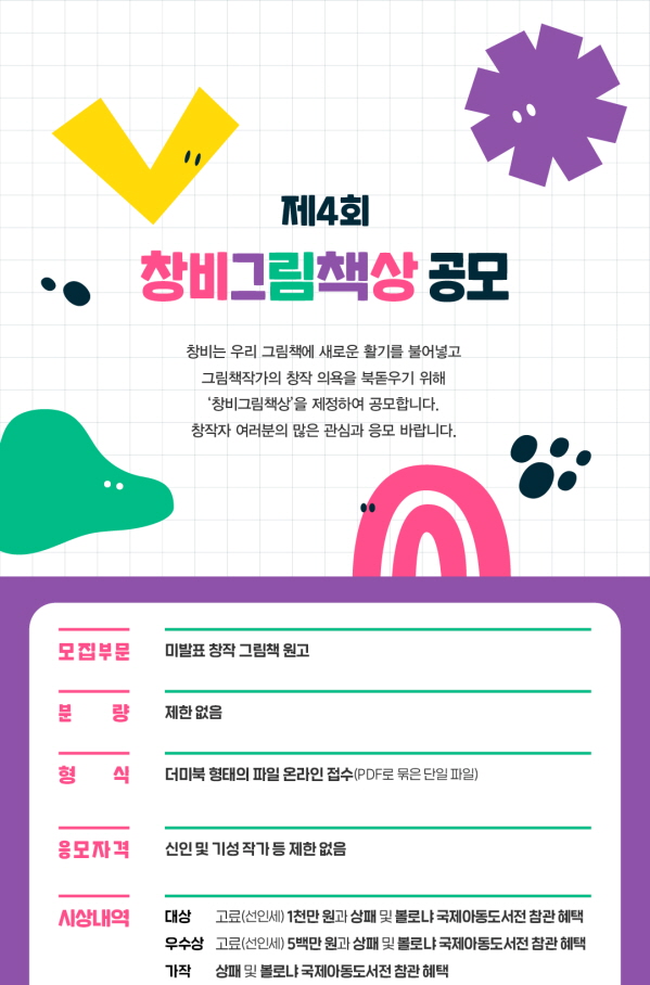 제4회 창비그림책상 공모 공모분야 문학/시나리오 접수기간2025.09.11 ~ 2026.01.30 D+5 종료 참가자격 제한없음 주최창비 주관창비 1등상금(상품)1천만원 초과 홈페이지 바로가기 첨부파일 다운로드 유의사항 ※본 내용은 참고 자료로 내용의 오류와 변동에 대해 책임지지 않습니다. (오류 및 변동 신고는 상단의 '제안/오류' 신고를 통해 해주십시오.) ※주최사 사정에 따라 일정 및 내용이 변경될 수 있으니 주최사 홈페이지 등을 통해 관련 안내를 수시로 확인하시기 바랍니다. 상세내용 ■ 제목제4회 창비그림책상 공모 ■ 개요창비는 우리 그림책에 새로운 활기를 불어넣고 그림책작가의 창작 의욕을 북돋우기 위해 ‘창비그림책상’을 제정하여 공모합니다.창작자 여러분의 많은 관심과 응모 바랍니다. ■ 기간 - 응모마감 : 2026년 1월 30일 (24시 전까지) - 결과 발표 : 2026년 3월 16일 창비 홈페이지 게시 ■ 참가자격신인 및 기성 작가 등 제한 없음 ■ 참여방법 / 접수방법<모집부문>미발표 창작 그림책 원고 <접수 방법>(1) 응모 지원서 제출하기 : https://docs.google.com/forms/d/e/1FAIpQLScYXAsjRZ-Iowjjcu-aIp2QHlJqnPYAIR1VlivimBLlmhT1Eg/viewform(2) 원고 제출하기(PDF로 묶은 단일 파일) : changbi.picturebook@gmail.com - 분량 : 제한없음 - 형식 : 더미북 형태의 파일 온라인 접수 (PDF로 묶은 단일 파일) ■ 시상내용 / 혜택 - 대상 : 고료(선인세) 1천만 원과 상패 및 볼로냐 국제아동도서전 참관 혜택 - 우수상 : 고료(선인세) 5백만 원과 상패 및 볼로냐 국제아동도서전 참관 혜택 - 가작 : 상패 및 볼로냐 국제아동도서전 참관 혜택 ■ 유의사항 - 글 원고 단독 응모는 불가능합니다. - 글, 그림 작가가 다른 경우에도 응모 가능합니다. - 응모작이 타 공모에서 당선되었거나 기금 수혜작 등으로 선정된 경우 심사 대상에서 제외됩니다. - AI 제작 작품은 응모할 수 없습니다. - 원고 파일의 용량은 최대 20MB로 만들어 주십시오. - 메일 제목과 파일명은 작품명으로 작성해 주십시오(파일명에 작가 이름 노출 금지). - 응모 지원서 제출 링크를 통해서 온라인으로 '제4회 창비그림책상 응모 지원서'를 작성한 뒤 제출해 주십시오. - 원고는 이메일로 보내 주십시오. ■ 문의 - 이메일 : noma@changbi.com 목록