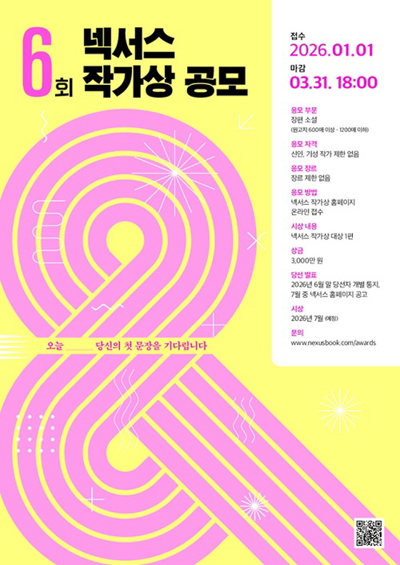 제6회 넥서스 작가상 공모 공모분야 문학/시나리오 접수기간2026.01.01 ~ 2026.03.31 D-13 접수중 참가자격 제한없음 주최넥서스 주관넥서스 1등상금(상품)1천만원 초과 홈페이지 바로가기 첨부파일 다운로드 유의사항 ※본 내용은 참고 자료로 내용의 오류와 변동에 대해 책임지지 않습니다. (오류 및 변동 신고는 상단의 '제안/오류' 신고를 통해 해주십시오.) ※주최사 사정에 따라 일정 및 내용이 변경될 수 있으니 주최사 홈페이지 등을 통해 관련 안내를 수시로 확인하시기 바랍니다. 상세내용 ■ 제목제6회 넥서스 작가상 공모 ■ 기간 - 접수 기간 : 2026년 1월 1일 ~ 3월 31일 18:00 ■ 참가자격 신인, 기성 작가 제한 없음 ■ 참여방법 / 접수방법<응모 부분> - 장편 소설(원고지 600매 이상 - 1200매 이하) - 응모작 소개서 첨부(자유 형식, 원고지 10매 내외) ※ 장르 제한 없음 <응모 방법> - 넥서스 작가상 홈페이지에서만 접수 ※ 우편접수 불가 - 응모작은 '아래한글', '워드프로세서' 문서로 작성해야 하며, 글꼴은 '바탕체(바탕,함초롱바탕,한컴바탕 포함)', 크기는11포인트로 통일, 행간 160%, 편집 용지 A4(위 20mm, 아래15mm, 좌 · 우 30mm, 머리말 · 꼬리말 15mm) - 넥서스 작가상은 온라인으로만 접수 - 온라인 홈페이지에서 응모 파일 업로드 (hwp. pdf. txt. doc.만 업로드 가능함) - 응모 마감까지 원고 수정 및 재 업로드 가능함 (회원가입 시) - 온라인 홈페이지에서 응모 유무를 확인할 수 있음 (회원가입 시) ■ 시상내용 / 혜택 - 대상 1편 3,000만 원 ※ 수상 상금과 출간 시 인세는 별도 지급함 ※ 수상작은 (주)넥서스에서 출간하는 것을 원칙으로 함 ※ 상금/부상의 제세공과금은 본인부담 ■ 유의사항 - 응모작은 온라인 및 오프라인 매체에 발표 또는 연재되거나 단행본으로 출간된 적 없는 독창적인 창작물이어야 하고 추후 표절이 밝혀질 경우 수상을 취소함 - 응모작은 AI와 공동작업하지 않은 순수 창작품이어야 함 - 타 공모전과 동시 수상이 확인되면 자동 탈락함 - 수상작은 주관사인 넥서스에서 단행본으로 출간하며, 출간 판매 부수에 대한 인세는 별도로 지급함 - 응모 마감일까지 홈페이지에 접수된 원고만 심사 대상이 됨 - 수상작 발표 시기는 응모 편수에 따라 다소 변동이 있을 수 있음 - 응모자의 신상정보는 응모작의 관리에만 사용하며, 심사위원에게는 응모자의 신상정보를 제공하지 않음 - 응모작은 반환하지 않으며, 6개월간 보유한 후 폐기함 - 심사 결과에 따라 수상작이 없을 수도 있음 - 응모를 완료하면 상기 사항에 동의한 것으로 간주함 ■ 문의 넥서스 공모전 홈페이지를 통해 문의 목록