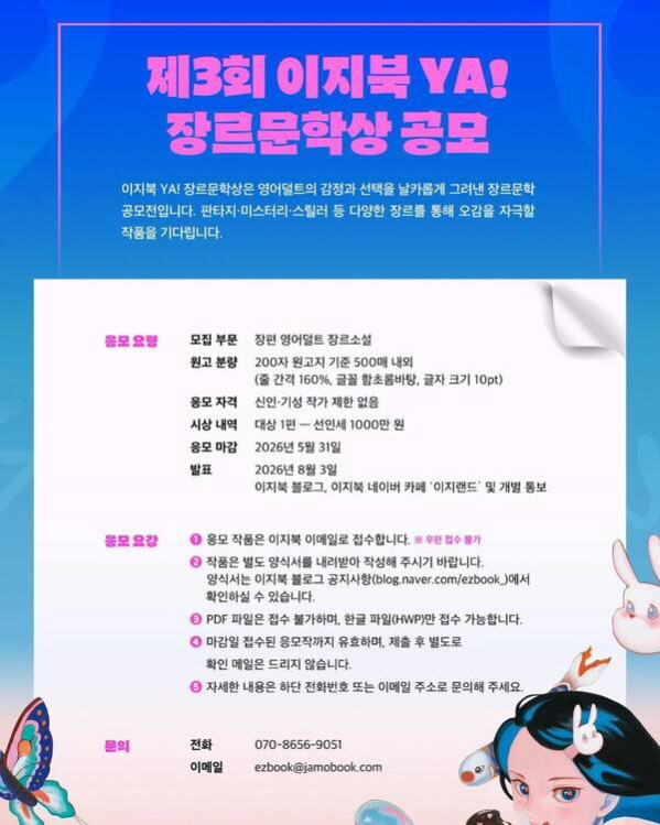 제3회 이지북 YA! 장르문학상 공모 공모분야 문학/시나리오 접수기간2026.01.05 ~ 2026.05.31 D-72 접수중 참가자격 제한없음 주최이지북 주관이지북 1등상금(상품)500만원~1천만원 홈페이지 바로가기 첨부파일 다운로드 유의사항 ※본 내용은 참고 자료로 내용의 오류와 변동에 대해 책임지지 않습니다. (오류 및 변동 신고는 상단의 '제안/오류' 신고를 통해 해주십시오.) ※주최사 사정에 따라 일정 및 내용이 변경될 수 있으니 주최사 홈페이지 등을 통해 관련 안내를 수시로 확인하시기 바랍니다. 상세내용 ■ 제목제3회 이지북 YA! 장르문학상 공모 ■ 개요이지북 YA! 장르문학상은 영어덜트의 감정과 선택을 날카롭게 그려낸 장르문학 공모전입니다. 판타지·미스터리·스릴러 등 다양한 장르를 통해 오감을 자극할 작품을 기다립니다. ■ 기간 - 응모 마감 : 2026년 5월 31일 - 발표 : 2026년 8월 3일 / 이지북 네이버 블로그, 카페(이지랜드) 및 개별 통보 ■ 참가자격신인, 기성 작가 제한 없음 ■ 참여방법 / 접수방법 ● 모집 부문 : 장편 영어덜트 장르소설 ● 원고 분량 : 200자 원고지 기준 500매 내외 (줄 간격 160% 글꼴 함초롬바탕, 글자 크기 10pt) ■ 시상내용 / 혜택대상 1편 : 선인세 1,000만 원 ■ 유의사항 - 이메일로 접수합니다. (우편 접수 불가) - 작품은 별도 양식을 내려받아 작성해 주십시오. - 한글 파일(HWP)만 접수 가능합니다. ■ 문의 - 전화 070-8656-9051 - 이메일 ezbook@jamobook.com 목록