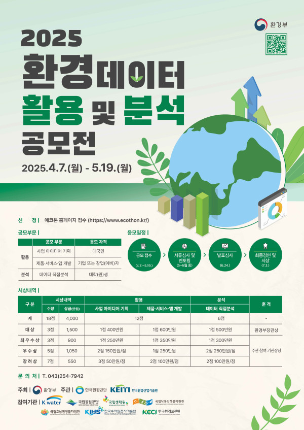 2025년도 제12회 환경데이터 활용 및 분석 공모전 공모분야 기획/아이디어/마케팅, 창업/사업 지원 접수기간2025.04.07 ~ 2025.05.19 D+279 종료 참가자격 제한없음 주최환경부 주관한국환경공단, 한국환경산업기술원 1등상금(상품)1천만원 초과 홈페이지 바로가기 첨부파일 다운로드 유의사항 ※본 내용은 참고 자료로 내용의 오류와 변동에 대해 책임지지 않습니다. (오류 및 변동 신고는 상단의 '제안/오류' 신고를 통해 해주십시오.) ※주최사 사정에 따라 일정 및 내용이 변경될 수 있으니 주최사 홈페이지 등을 통해 관련 안내를 수시로 확인하시기 바랍니다. 상세내용 2025 환경데이터 활용 및 분석 공모전 ● 참가 자격1. 환경데이터 활용- 사업 아이디어 기획 : 대국민(개인 또는 팀)- 제품·서비스(앱App 포함) 개발 : 기업 창업(예비)자(개인 또는 팀)2. 환경데이터 분석- 데이터 직접분석 : 대학(원)생(개인 또는 팀) - 접수 마감일 기준 재학생※ 개인 또는 팀 단위(4인 이내, 팀장/팀원으로 구성) 참가 가능※ 동일 아이템으로 他 공모전 또는 경진대회에 입상하였거나, 타인의 아이템을 도용하여 저작권을 침해한 경우 지원 및 입상 취소※ 환경데이터 분석 '직접분석' 부문의 경우 발표 심사 시 관련 증빙서류(재학증명서, 휴학증명서, 수료증명서/접수 마감일 기준 재학 여부) 등을 요청할 예정이며, 재학생이 아닌 팀원이 있을 경우 지원자격이 맞지 않아 평가에서 제외되는 점 참고 ● 공모 분야1. 환경데이터 활용 부문(1) 아이디어 기획- 미션· 환경기술산업: 환경R&D, 신기술, 해외사업, 국제협력, 그린뉴딜, 일자리 창출 등· 친환경·보건: 친환경 녹색제품, 생활화학 제품, 어린이 보건안전, 피해예방·보전 등· 자연환경: 생태계, 자연공원, 생물다양성, 담수, 자원보전, 교육, 탐방 등· 환경현안: ESG, 탄소중립, 기후변화, 미세먼지, 디지털약자 등 사회·환경문제 해결· 환경일반: 폐기물·대기·수질·토양·소음 등· 수자원환경: 수도‧수자원, 신재생에너지, 물순환, 도시 물특화(스마트시티) 등 물 서비스 향상과 물 문제 해결※ 활용 부문 가점: 국가중점데이터 활용, 수상 아이디어 활용 제품·서비스(2) 제품·서비스(앱APP 포함) 개발- 미션· 환경기술산업: 환경R&D, 신기술, 해외사업, 국제협력, 그린뉴딜, 일자리 창출 등· 친환경·보건: 친환경 녹색제품, 생활화학 제품, 어린이 보건안전, 피해예방·보전 등· 자연환경: 생태계, 자연공원, 생물다양성, 담수, 자원보전, 교육, 탐방 등· 환경현안: ESG, 탄소중립, 기후변화, 미세먼지, 디지털약자 등 사회·환경문제 해결· 환경일반: 폐기물·대기·수질·토양·소음 등· 수자원환경: 수도‧수자원, 신재생에너지, 물순환, 도시 물특화(스마트시티) 등 물 서비스 향상과 물 문제 해결※ 활용 부문 가점: 국가중점데이터 활용, 수상 아이디어 활용 제품·서비스2. 환경데이터 분석 부문(1) 데이터 직접분석- 미션· 건강한 생활환경: 환경보건 서비스, 화학물질 관리 개선· 기후위기에 강한 물 환경과 자연생태계 조성: 안전한 스마트 물 관리, 물 서비스 품질 제고, 환경시설 현대화, 생물다양성 보전· 미세먼지 걱정없는 푸른 하늘: 초미세먼지 국내 감축, 고농도 미세먼지 대응, 초미세먼지 국외 유입 저감, 실내 공기질 관리 강화· 재활용을 통한 순환경제 완성: 발생량 저감, 회수·선별 고도화, 고부가가치 재활용, 바이오가스 확대 ● 공모 주제- 환경데이터 활용 및 분석 ● 시상 내역- 총 상금 4,000만원[대상] 환경부장관 상- 환경데이터 활용ㆍ아이디어 기획 : 1점 400만원 / 제품·서비스(앱App 포함) 개발 : 1점 600만원- 환경데이터 분석ㆍ직접분석 : 1점 500만원[최우수상]- 환경데이터 활용 [한국수자원공사 상, 한국환경산업기술원장 상]ㆍ아이디어 기획 : 1점(⑦) 250만원 / 제품·서비스(앱App 포함) 개발 : 1점(②) 350만원- 환경데이터 분석 [한국환경공단이사장 상]ㆍ직접분석 : 1점(①) 300만원[우수상]- 환경데이터 활용 [한국환경산업기술원장 상, 국립생태원장 상]ㆍ아이디어 기획 : 2점(②,②) 150만원 / 제품·서비스(앱App 포함) 개발 : 1점(④) 250만원- 환경데이터분석 [한국환경공단이사장 상, 국립공원공단이사장 상]ㆍ직접분석 : 2점(①,③) 250만원[장려상]- 환경데이터 활용 [한국환경공단이사장 상, 국립낙동강생물자원관장 상, 국립호남권생물자원관장 상, 한국환경보전원 상, 한국수자원조사기술원 상]ㆍ아이디어 기획 : 3점(①,⑤,⑥) 50만원 / 제품·서비스(앱App 포함) 개발 : 2점(⑧,⑨) 100만원- 환경데이터 분석 [국립낙동강생물자원관장 상, 국립호남권생물자원관장 상]ㆍ직접분석 : 2점(⑤,⑥) 100만원※ 상격 : ① 한국환경공단이사장 상 / ② 한국환경산업기술원장 상 / ③ 국립공원공단이사장 상/④ 국립생태원장 상 / ⑤ 국립낙동강생물자원관장 상 / ⑥ 국립호남권생물자원관장 상 /⑦ 한국수자원공사 상 / ⑧ 한국환경보전원 상 / ⑨ 한국수자원조사기술원 상 ● 공모 일정- 접수기간 : 2025.4.7.(월) ~ 5.19.(월) <6주간>- 서류심사 및 멘토링 : 2025.5~6월 중- 발표심사 : 2025.6.24.(화)- 최종경연 및 시상 : 2025.7.3.(목) ● 접수 방법- 2025년도 환경데이터 활용 및 분석 공모전 홈페이지(https://www.ecothon.kr)