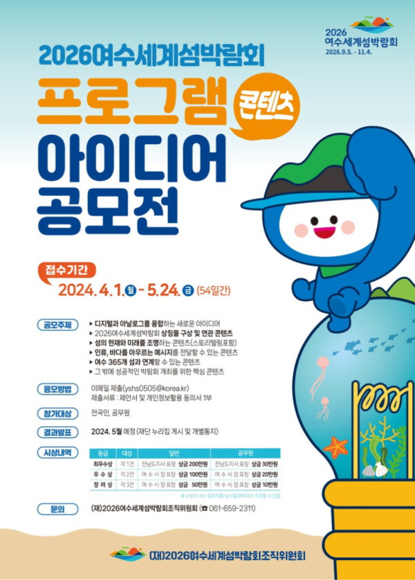 2026 여수세계섬박람회 프로그램 콘텐츠 아이디어 공모전 공모분야 기획/아이디어/마케팅 접수기간2025.04.01 ~ 2025.05.24 D+274 종료 참가자격 제한없음 주최(재)2026여수세계섬박람회조직위원회 1등상금(상품)200만원~499만원 홈페이지 바로가기 첨부파일 다운로드 유의사항 ※본 내용은 참고 자료로 내용의 오류와 변동에 대해 책임지지 않습니다. (오류 및 변동 신고는 상단의 '제안/오류' 신고를 통해 해주십시오.) ※주최사 사정에 따라 일정 및 내용이 변경될 수 있으니 주최사 홈페이지 등을 통해 관련 안내를 수시로 확인하시기 바랍니다. 상세내용 ■ 제목2026 여수세계섬박람회 프로그램 콘텐츠 아이디어 공모전 ■ 기간 - 접수 기간 : 2024. 4. 1.(월) ~ 5. 24.(금) (54일간) ■ 참가자격전국민, 공무원 ■ 참여방법 / 접수방법<공모주제>‣ 디지털과 아날로그를 융합하는 새로운 아이디어‣ 2026여수세계섬박람회 상징물 구상 및 연관 콘텐츠‣ 섬의 현재와 미래를 조명하는 콘텐츠(스토리텔링포함)‣ 인류, 바다를 아우르는 메시지를 전달할 수 있는 콘텐츠‣ 여수 365개 섬과 연계할 수 있는 콘텐츠‣ 그 밖에 성공적인 박람회 개최를 위한 핵심 콘텐츠 ● 응모방법 : 이메일 제출(yshs0505@korea.kr) ● 제출서류 : 제안서 및 개인정보활용동의서 1부 ■ 시상내용 / 혜택 등 급대 상일 반공무원최우수상각 1건전남도지사 표창, 상금 200만원전남도지사 표창, 상금 30만원우수상각 2건여수시장 표창, 상금 100만원여수시장 표창, 상금 20만원장려상각 3건여수시장 표창, 상금 50만원여수시장 표창, 상금 10만원 ■ 유의사항- 응모서류는 반환하지 않으며, 동일 또는 유사한 내용으로 중복 응모된 제안인 경우 먼저 접수된 제안 우선 선정- 제안과 관련하여 제3자의 저작권, 초상권 침해 등 분쟁 발생 시 모든 책임은 응모자에게 있음- 제안 내용이 타 공모전에서 입상한 사실이 있거나, 표절 등 기타 부정한 방법에 의한 경우 심사 대상에서 제외되며 수상 이후 발견 시 수상 취소 및 시상금 환수- 심사평가 결과 우수제안이 없을 경우 전부 또는 일부를 선정하지 않을 수 있음 ■ 문의(재)2026여수세계섬박람회조직위원회 담당자(061-659-2311) 목록