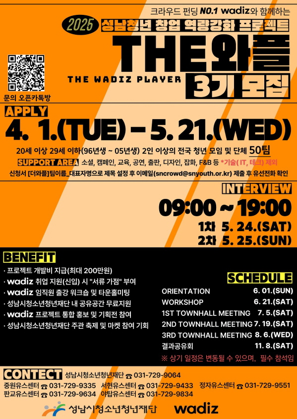 2025 성남청년 창업 역량강화 프로젝트 THE 와플 모집 공모분야 창업/사업 지원, 대회/전시/제작, 기타분야 접수기간2025.04.01 ~ 2025.05.21 D+277 종료 참가자격 대학(원)생/청년 주최성남시청소년청년재단 1등상금(상품)200만원~499만원 홈페이지 바로가기 첨부파일 다운로드 유의사항 ※본 내용은 참고 자료로 내용의 오류와 변동에 대해 책임지지 않습니다. (오류 및 변동 신고는 상단의 '제안/오류' 신고를 통해 해주십시오.) ※주최사 사정에 따라 일정 및 내용이 변경될 수 있으니 주최사 홈페이지 등을 통해 관련 안내를 수시로 확인하시기 바랍니다. 상세내용 ■ 제목2025 성남청년 창업 역량강화 프로젝트 THE 와플 모집 ■ 개요크라우드펀딩1) 플랫폼 운영기업 와디즈2)와 함께, 창업아이템 아이디에이션부터 기금마련을 위한 스토리기획 및 펀딩부스팅 등 일련의 종합 활동 지원을 경험하며 창업 역량강화는 물론, 창업 실현 가능성 진단과 창업시장 진출을 위한 A to Z를 성남시청소년청년재단과 함께 설계하세요. 청년 여러분의 많은 관심 바랍니다. ■ 기간 - 접수기간 : 2025. 4. 1.(화) ~ 5. 21.(수), 23시 59분 접수분까지(마감 시간 준수) - 선발면접 1차 : 2025. 5. 24.(토), 09:00 ~ 19:00 / 2차 : 2025. 5. 25.(일), 09:00 ~ 19:00 - 활동기간 : 2025. 6월 ~ 12월 ■ 참가자격 만20세 이상 만29세 이하(1996년생~ 2005년생) 2인 이상의 전국 청년 모임 및 단체※ 팀원 모두 해당 연령이어야 함. ■ 참여방법 / 접수방법<신청분야>패션, 뷰티, 홈·리빙, 스포츠, 푸드, 도서, 전자책, 디자인, 반려동물, 아트, 캐릭터 굿즈, 영화·음악, 소셜 등 ※ IT&테크 제외 <접수 방법>이메일접수 : sncrowd@snyouth.or.kr- 첨부된 신청서 및 공고문 내용을 꼼꼼히 확인- 이메일 및 제출파일 제목 설정 > [더와플]팀이름_대표자명- 신청서 이메일 발송 후 반드시 유선전화 확인(031-729-9064) ■ 지원 및 혜택- 선발규모 : 50팀- 지원규모 : 팀당 최대 200만원 ※ 크라우드펀딩 프로젝트 개발에 필요한 각종 제반 비용 · 리워드 개발비, 마케팅비, 지재권/인증비, 물품 구입 및 식·간식 등 - 와디즈 취업 지원(신입) 시 “서류 가점” 부여와디즈 임직원 및 전문가 교육 및 컨설팅청년공유공간 무료 지원프로젝트 소개 및 펀딩부스팅 등 프로젝트 홍보 시 와디즈 로고 온·오프라인 사용 가능성남시청소년청년재단 주관 축제(청년의날 등) 내 플리마켓 참여기회 및 창업 관련 자원 연계 등 ■ 유의사항 ❍ 오리엔테이션 / 워크숍 / 타운홀미팅 / 결과공유회 필수 참석 ❍ 선정취소요건(불이익이 있거나 선정이 취소될 수 있습니다.) - 학교 과제의 목적으로 이용 - 특정 종교 관련 포교 및 선교 활동의 경우 - 타 기관으로부터 동일한 사업 아이템으로 동일 또는 유사 사업 지원을 받는 경우 - 법적 결격사유가 있는 자, 정치성, 종교성, 사행성 모임 등 - 사업내용을 통해 부당한 이익(ex: 갈취 및 착취 등)을 취득하려는 경우 ❍ 제출된 서류는 반환되지 않습니다. ■ 문의 - 성남시청소년청년재단 Tel: 031-729-9064 · 중원유스센터 Tel: 031-729-9335 · 서현유스센터 Tel: 031-729-9633 · 정자유스센터 Tel: 031-729-9551 · 판교유스센터 Tel: 031-729-9634 · 야탑유스센터 Tel: 031-729-9834 - 오픈카톡 : https://open.kakao.com/o/gE74Uxnh 목록