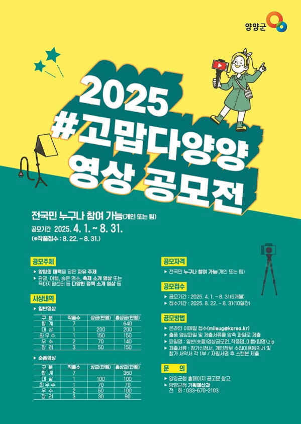 2025 #고맙다양양 영상 공모전 공모분야 사진/영상 접수기간2025.08.22 ~ 2025.08.31 D+174 종료 참가자격 제한없음 주최양양군청 1등상금(상품)200만원~499만원 홈페이지 바로가기 첨부파일 다운로드 유의사항 ※본 내용은 참고 자료로 내용의 오류와 변동에 대해 책임지지 않습니다. (오류 및 변동 신고는 상단의 '제안/오류' 신고를 통해 해주십시오.) ※주최사 사정에 따라 일정 및 내용이 변경될 수 있으니 주최사 홈페이지 등을 통해 관련 안내를 수시로 확인하시기 바랍니다. 상세내용 ■ 제목2025 #고맙다양양 영상 공모전 ■ 개요우리군에서는 창의적이고 재치있는 영상을 발굴하여 양양의 다양한 매력을 홍보하고자「2025 #고맙다양양 영상 공모전」을 개최하오니 많은 참여 바랍니다. ■ 기간 - 접수 기간 : 2025. 8. 22. ~ 8. 31. - 결과발표 : 2025. 9. 17. (예정) (군 홈페이지 게시 및 수상자 개별 통보) ■ 참가자격전 국민 누구나 참여 가능(개인 또는 팀) ■ 참여방법 / 접수방법<공모부문> 일반영상(2분이내, 가로형), 숏폼영상(1분이내, 세로형) 2개 부문 <공모주제> 양양의 매력을 담은 자유 주제 - 관광, 여행, 숨은 명소, 축제 소개 영상 - 육아지원센터 등 다양한 정책 소개 영상 등 <공모방법> 온라인 이메일(mileug@korea.kr) 접수 - 출품 영상파일 및 제출서류를 압축파일로 제출 - 파일명 : 일반(숏폼)영상공모전_작품명_이름(팀명).zip - 제출서류 : 참가신청서, 개인정보 수집이용동의서 및 참가 서약서 각 1부 / 자필서명 후 스캔본 제출 ❍ 출품수량 : 1인(팀)당 부문별 1편 제출 가능(단, 중복수상 불가) (ex. 일반영상 1편, 숏폼영상 1편 각 제출가능) <출품규격>부 문길 이규 격일반영상2분이내 16:9 가로형1920*1080(FHD) 이상, MP4 파일숏폼영상1분이내9:16 세로형1080*1920(FHD) 이상, MP4 파일 ■ 시상내용 / 혜택【일반영상】구분작품수상금(만원)총상금(만원)대상1200200최우수1150150우수270140장려350150 【숏폼영상】구분작품수상금(만원)총상금(만원)대상1100100최우수17070우수250100장려33090 ■ 유의사항❍ 출품작은 응모자가 직접 만든 순수 창작물이어야 하며, 다른 공모전에 출품한 적 없는 작품만 가능합니다. - 이미 다른 공모전에서 수상했거나 타인의 저작물을 활용한 경우 심사 대상에서 제외됩니다. - 시상 이후라도 이러한 사실이 밝혀지면 수상이 취소되고 시상금이 환수될 수 있습니다. - 광고성, 상업적 목적이 강한 영상이나 부적절한 내용(혐오·선정적인 장면, 정치·종교적 메시지 포함)은 심사에서 제외될 수 있습니다. ❍ 출품작은 저작권, 초상권, 특허권 등 법적인 문제가 없어야 하며, 이에 대한 책임은 응모자에게 있습니다. - 영상에 출연자가 있을 경우, 사전 동의를 반드시 받아야 하며, 미성년자가 포함될 경우 보호자의 동의가 필요합니다. - 드론(항공) 촬영 영상은 관련 법규와 비행 허가 규정을 준수해야 합니다. - 심사 후에도 표절, 중복 응모, 법적 문제 등이 확인되면 수상이 취소되고 시상금이 반환될 수 있습니다. ❍ 수상작의 저작권은 양양군에 귀속되며, 군 홍보를 위해 활용될 수 있습니다. - 필요할 경우 2차 저작물로 가공하거나 공익적 목적으로 유관기관에 제공될 수 있습니다. ❍ ChatGPT등 AI툴에 의한 창작물은 인정하지 않으며, 발견 시 당선에서 제외됩니다. ❍ 심사 기준에 부합하는 작품이 부족할 경우, 수상작을 선정하지 않을 수도 있습니다. ❍ 심사 과정 및 점수는 비공개이며, 결과에 대해 이의를 제기할 수 없습니다. ❍ 한 사람이 부문별 작품을 각각 출품할 수 있지만, 가장 높은 점수를 받은 1개 작품만 시상됩니다. ❍ 팀으로 출품한 경우, 대표자 명의로 시상이 진행됩니다. ❍ 제출된 영상과 관련 서류는 반환되지 않으며, 공모전과 관련된 최종 해석은 양양군의 결정에 따릅니다. ■ 문의양양군청 기획예산과 홍보팀 ☎ 033)670-2103 목록