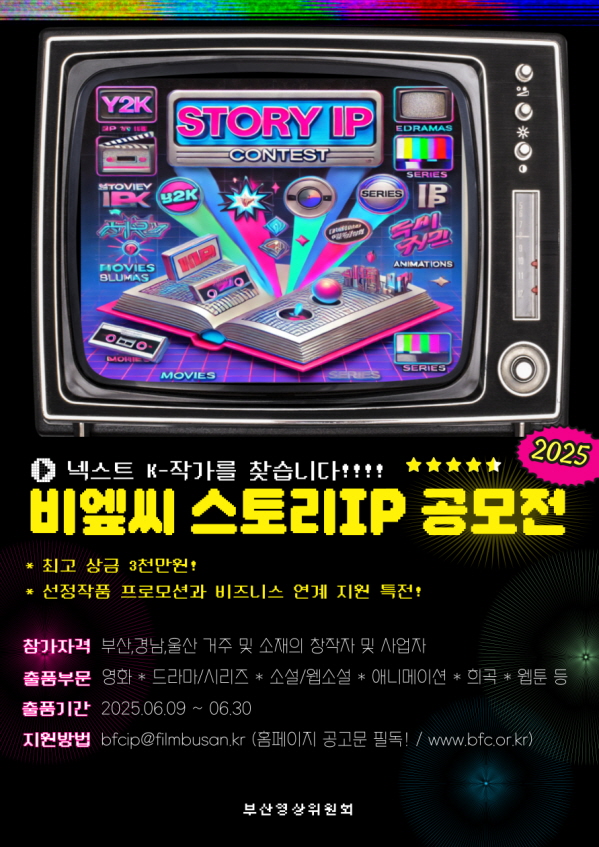 2025 BFC 스토리IP 공모전 (대상 : 3천만원) 공모분야 문학/시나리오, 사진/영상, 웹툰/포스터/미술 접수기간2025.06.09 ~ 2025.06.30 D+236 종료 참가자격 지역한정 주최부산영상위원회 주관부산영상위원회 1등상금(상품)1천만원 초과 홈페이지 바로가기 첨부파일 다운로드 유의사항 ※본 내용은 참고 자료로 내용의 오류와 변동에 대해 책임지지 않습니다. (오류 및 변동 신고는 상단의 '제안/오류' 신고를 통해 해주십시오.) ※주최사 사정에 따라 일정 및 내용이 변경될 수 있으니 주최사 홈페이지 등을 통해 관련 안내를 수시로 확인하시기 바랍니다. 상세내용 ■ 제목2025 BFC 스토리IP 공모전 ■ 개요부산영상 위원회는 ‘2025 BFC 스토리 IP 공모전’을 개최합니다.지역 기반의 우수한 스토리 IP와 창작자를 발굴하고, 당선작에게는 비즈니스 연계지원을 제공함으로서콘텐츠 및 IP 시장 진입 가능성을 높이고 스토리 경쟁력 제고에 기여하고자 합니다. ■ 기간 - 응모 접수 : 2025년6월9일(월)~6월30일(월) 17:00 까지 ■ 참가자격○ 부산 및 경남권(울산·경남)지역에서 활동중인 창작자(개인 또는 사업자)○ 스토리 IP 확장 및 상용화 분야에서 활동중인 부산 및 경남권(울산·경남) 사업자○ 신인 / 기성 제한없음○ 신청자(개인 또는 법인) 기준 최대 3편 출품 가능○ 접수작의 저작권, 판권 및 부가판권 등에 대한 권리는 신청인(개인 또는 사업자)에 있어야 함※ 증빙을 위한 주민등록등본, 사업자등록증, 법인등기부등본 사본제출필수 ■ 참여방법 / 접수방법<모집분야>○ 극영화, 드라마, 소설/웹소설, 웹툰/애니메이션, 희곡 등 스토리 기반 창작물 ○ 신규 IP(신규순수창작물)와 IP 확장을 위한 원저작물 모두 응모 가능 <제출 서류>① 공모전 신청서 : 인적사항, 활동이력, 저작권리자 표시 등② 개인정보 이용 및 사업 참여 동의서③ 저작권 보유 및 권리 확인서 : 저작권등록증 또는 소정양식④ 출품작 기획안 : 로그라인, 인물소개, 트리트먼트 등※ 트리트먼트 분량 엄수(5,000~15,000자 / 공백 포함) ⑤ 출품작품 : 출품작품(원저작물은 ip 활용 계획안 별첨)⑥ 자격 증빙(소재지 증빙) 서류 <접수처>이메일 : bfcip@filmbusan.kr ※ 자세한 방법 및 기타 상세한 내용은 홈페이지 공고문 참조 ■ 시상내용 / 혜택 - 대상 1편 : 3,000만원 - 우수상 2편 : 각 1,000만원 - 장려상 7편 내외 : 각 500만원 ■ 문의이메일 : bfcip@filmbusan.kr 목록