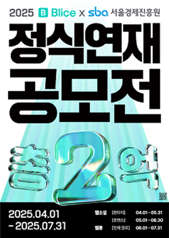 2025 블라이스 × SBA 정식연재 공모전 공모분야 문학/시나리오, 웹툰/포스터/미술 접수기간2025.04.01 ~ 2025.07.31 D+205 종료 참가자격 제한없음 주최블라이스 1등상금(상품)1천만원 초과 홈페이지 바로가기 첨부파일 다운로드 유의사항 ※본 내용은 참고 자료로 내용의 오류와 변동에 대해 책임지지 않습니다. (오류 및 변동 신고는 상단의 '제안/오류' 신고를 통해 해주십시오.) ※주최사 사정에 따라 일정 및 내용이 변경될 수 있으니 주최사 홈페이지 등을 통해 관련 안내를 수시로 확인하시기 바랍니다. 상세내용 ■ 제목2025 블라이스 × SBA 정식연재 공모전 ■ 기간 - 웹소설(판타지) 접수 : 2025. 4. 1. ~ 5. 31. - 웹소설(로맨스) 접수 : 2025. 5. 1. ~ 6. 30. - 웹툰(전체 장르) 접수 : 2025. 6. 1. ~ 7. 31. ■ 참가자격신인 작가와 기성 작가 모두 참여 가능합니다.※ 유료 판매된 적 없는 신작만 참여 가능합니다.※ 출품 작품 수는 제한 없습니다. (단, 수상은 작가당 1개 작품만 가능) ■ 참여방법 / 접수방법<분량> - 웹소설(판타지) : 프롤로그 제외 총 15회 이상이면서 전체 회차 글자 수 공백 포함 7만자 이상 - 웹소설(로맨스) : 프롤로그 제외 총 15회 이상이면서 전체 회차 글자 수 공백 포함 6만자 이상 - 웹툰(전체 장르) : 프롤로그 제외 총 3회 이상이면서 회차당 65컷 이상 <응모 방법> 블라이스( www.blice.co.kr ) 에 작품 연재 - 작품 등록 : 내서재 > 작가활동 > 작품쓰기※ 작품 등록 시 공모전 체크박스를 반드시 선택해 주세요.※ 웹툰 부문은 모집 기간 내 반드시 시놉시스를 제출해 주세요. ■ 시상내용 / 혜택<웹소설(판타지) 부문> - 대상 1종 : 상금 1,500만원 + 최대 고료 800만원 - 최우수상 1종 : 상금 1,000만원 + 최대 고료 700만원 - PD’s pick 4종 : 상금 각 250만원 + 최대 고료 각 600만원 <웹소설(로맨스) 부문> - 대상 1종 : 상금 1,500만원 + 최대 고료 700만원 - 최우수상 1종 : 상금 1,000만원 + 최대 고료 600만원 - PD’s pick 4종 : 상금 각 250만원 + 최대 고료 각 500만원 <웹소설(판타지) 부문> - 대상 1종 : 상금 1,500만원 + 최대 고료 1,100만원 - 최우수상 1종 : 상금 1,000만원 + 최대 고료 1,000만원 - PD’s pick 1종 : 상금 각 500만원 + 최대 고료 각 900만원 ■ 유의사항자세한 내용은 홈페이지 공고를 참조해 주세요. 목록