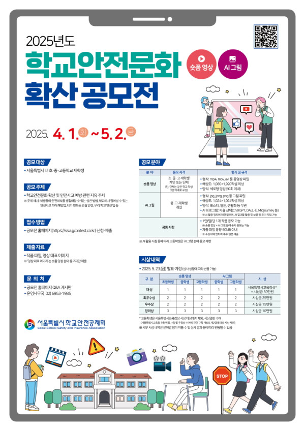 2025년도 학교안전문화 확산 공모전 공모분야 사진/영상, 웹툰/포스터/미술 접수기간2025.04.01 ~ 2025.05.02 D+295 종료 참가자격 청소년, 지역한정 주최서울특별시학교안전공제회 주관서울특별시학교안전공제회 1등상금(상품)100만원 이하 홈페이지 바로가기 첨부파일 다운로드 유의사항 ※본 내용은 참고 자료로 내용의 오류와 변동에 대해 책임지지 않습니다. (오류 및 변동 신고는 상단의 '제안/오류' 신고를 통해 해주십시오.) ※주최사 사정에 따라 일정 및 내용이 변경될 수 있으니 주최사 홈페이지 등을 통해 관련 안내를 수시로 확인하시기 바랍니다. 상세내용 ■ 제목2025년도 학교안전문화 확산 공모전 ■ 개요이 공모전은 학생들이 직접 ① 숏폼 영상과 ② AI 그림 등 창의적이고 개성 있는 작품을 만들어서 응모할 수 있습니다. 안전한 학교를 만들 수 있도록 학생 여러분의 많은 관심과 참여 바랍니다. ■ 기간 - 접수 기간: 2025. 4. 1.(화) ~ 5. 2.(금) ■ 참가자격서울특별시 내 초·중·고등학교 재학생 ■ 참여방법 / 접수방법<공모 주제> 학교안전문화 확산 및 안전사고 예방 관련 자유 주제 ※ 주제 예시 : 학생들의 안전의식을 생활화할 수 있는 실천 방법, 학교에서 일어날 수 있는 안전사고 피해 예방법, 내가 만드는 교실 안전, 우리 학교 안전 팁 등 <공모 분야>① 숏폼 영상(단체 참가 가능. 단, 단체는 같은 학교 학생 3인 이내로 구성)- 형식: mp4, mov, avi 등 동영상 파일- 해상도: 1,080×1,920픽셀 이상- 양식: 세로형 영상(60초 이내) ② AI 그림(개인으로만 참가 가능 / 초등생 참가 불가)- 형식: jpg, jpeg, png 등 그림 파일- 해상도: 1,024×1,024픽셀 이상- 양식: 포스터, 웹툰, 생활화 등 무관- AI 프로그램: 자율 선택(ChatGPT, DALL-E, Midjourney 등) ※ AI 활용 정도에 제한 없으며, AI 결과물 활용 및 보완 등 추가 작업 가능 - 1인(팀)당 1개 작품 응모 가능※ ① 숏폼 영상 + ② AI 그림 분야 동시 응모는 가능- 제출 파일 용량 50MB 이내※ 수상자에 한하여 추후 원본 제출 ※ AI 활용 지침 등에 따라 초등학생은 ‘AI 그림’ 분야 응모 제한 <접수 방법> 공모전 홈페이지(https://ssia.gcontest.co.kr) 신청·제출 <제출 자료> ① 작품 파일, ② 영상 대표 이미지 ※ ‘② 영상 대표 이미지’는 숏폼 영상 분야 응모자만 제출 ■ 시상내용 / 혜택대상 : 초, 중, 고 각 부문 1명씩 : 상장 및 시상금 50만원 등 다수 시상 ※ 고등학생은 시상금만 수여 ■ 유의사항◦ 제출 작품은 응모자가 직접 기획·제작한 미발표 작품이어야 하며, 숏폼 영상 분야에 한하여 단체 응모 가능 (단체는 같은 학교 학생 3인 이내로 구성) ◦ 1인(팀)당 1개 작품 응모 가능하며, 중복 제출 시 최초 1개 작품만 인정 - ① 숏폼 영상 + ② AI 그림 분야 동시 응모는 가능 ◦ 저작권 및 초상권 등 분쟁이 발생할 경우 모든 법적 책임은 응모자에게 있으며, 다른 공모전 수상 작품 및 타인의 창작물을 표절·복제한 경우 심사 대상에서 제외하고, 시상 후에도 이러한 사실이 밝혀질 경우 상장 및 시상금은 일체 회수 조치 ◦ 지식재산 제도의 기본 원칙에 따라 수상 작품의 저작권은 수상자에게 있으나, 학교안전공제회에서는 해당 작품의 발표 및 홍보 등을 위하여 수상자의 동의를 받아 편집·재가공하여 활용 가능 - 수상 작품과 관련된 모든 자료를 서울특별시학교안전공제회의 교육·홍보 자료 활용 목적으로 배포·탑재하는 것에 동의하여야 응모 가능 ◦ 단체(숏폼 영상 분야) 응모자의 경우 상장은 공동 명의로 한 장만 수여되며, 시상금은 응모자 중 대표자에게 지급 (시상금 배분에 관하여 주최 측은 일절 관여하지 않음) ■ 문의공모전 홈페이지 Q&A 게시판, 운영사무국(02-6953-1985) 목록