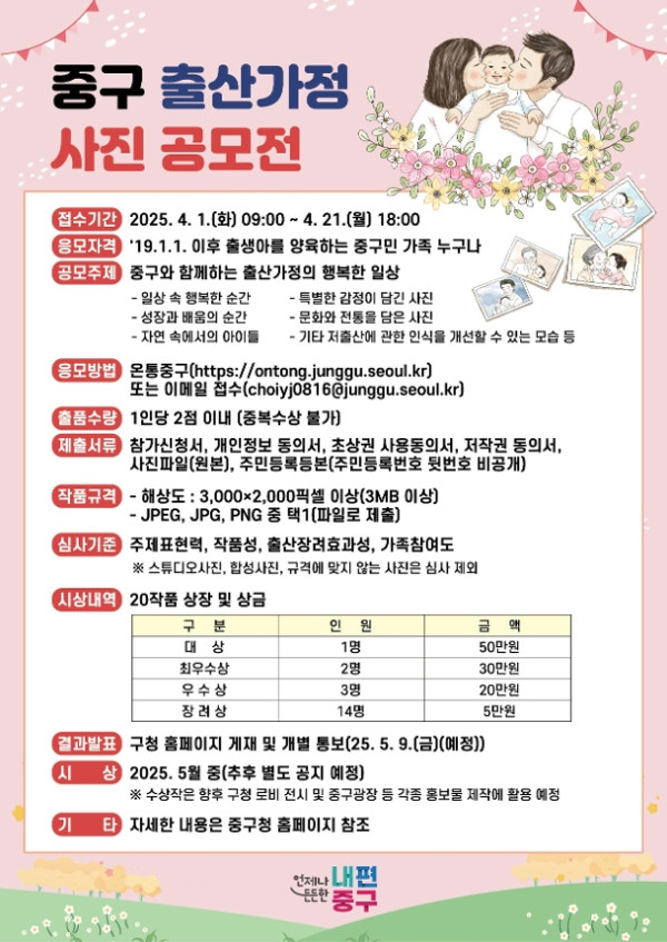서울 중구 출산가정 사진 공모전 공모분야 사진/영상 접수기간2025.04.01 ~ 2025.04.21 D+305 종료 참가자격 지역한정 주최서울 중구 1등상금(상품)100만원 이하 홈페이지 바로가기 첨부파일 다운로드 유의사항 ※본 내용은 참고 자료로 내용의 오류와 변동에 대해 책임지지 않습니다. (오류 및 변동 신고는 상단의 '제안/오류' 신고를 통해 해주십시오.) ※주최사 사정에 따라 일정 및 내용이 변경될 수 있으니 주최사 홈페이지 등을 통해 관련 안내를 수시로 확인하시기 바랍니다. 상세내용 ■ 제목서울 중구 출산가정 사진 공모전 ■ 기간 - 접수기간: 2025. 4. 1.(화) ~ 4. 21.(월) - 발표 : 2025. 5. 9.(금) 예정 / 홈페이지 게시 및 개별 통보 ■ 참가자격'19.1.1. 이후 출생아를 양육하는 중구민 누구나 ■ 참여방법 / 접수방법<공모 주제> 중구와 함께하는 출산가정의 행복한 일상 - 일상 속 행복한 순간 - 성장과 배움의 순간 - 자연 속에서의 아이들 - 특별한 감정이 담긴 사진 - 문화와 전통을 담은 사진 - 기타 저출산에 관한 인식을 개선할 수 있는 모습 등 <작품 규격> - 해상도: 3,000×2,000 픽셀 이상 (3MB이상) - JPEG, JPG, PNG 중 택1 (파일로 제출) ※ 스튜디오사진, 합성사진, 규격에 맞지 않은 사진은 심사 제외 ※ 출품 수량 : 1인당 2점 이내 (1가정 내 중복수상 불가) <응모 방법>온통중구 또는 이메일 접수 - 온통중구 공모 참여 게시글 (https://ontong.junggu.seoul.kr/cmc/contest/contestView.do) 에서 신청서식 다운로드하여 작성 후 제출 - 이메일 접수 : choiyj0816@junggu.seoul.kr <제출서류>(1) 참가신청서 (사진당 각 1부)(2) 개인정보 수집 이용 동의서(3) 초상권자 개인 정보 수집 동의서(4) 저작권 및 사용권 동의서(5) 출품사진(파일 원본)(6) 주민등록등본(주민번호 뒷번호 비공개)※ 필요 시 가족관계증명서 제출 요청 ■ 시상내용 / 혜택 - 대상 1명 : 50만원 및 상장 - 최우수상 2명 : 각 30만원 및 상장 - 우수상 3명 : 각 20만원 및 상장 - 장려상 14명 : 각 5만원 및 상장 ■ 유의사항반드시 공고문을 통해 유의사항 내용을 참조하시기 바랍니다. ■ 문의중구청 가족정책과 담당자 (전화 : 02-3396-5434) 목록