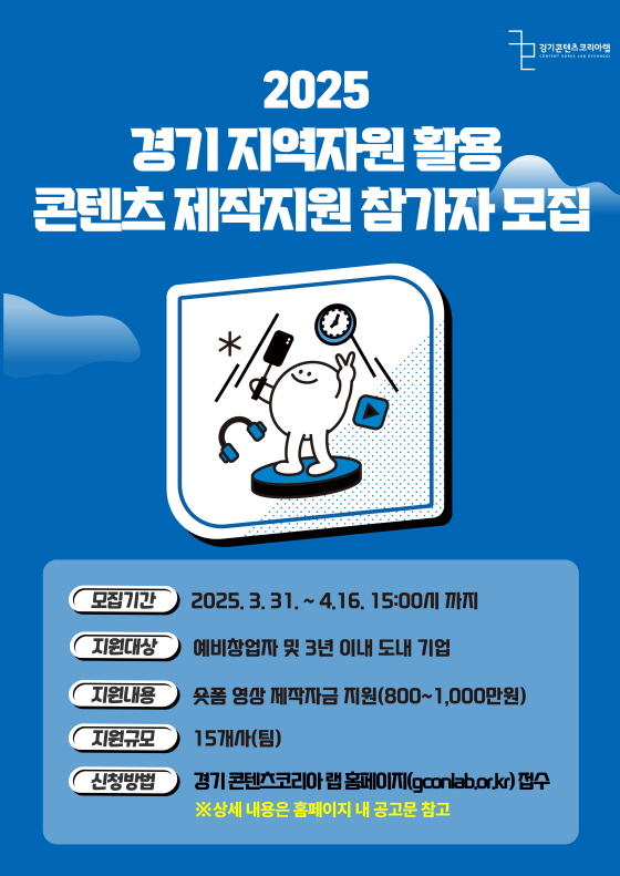 2025년 경기지역자원 활용 콘텐츠 제작지원 참가자 모집 (숏폼 부문) 공모분야 사진/영상 접수기간2025.04.01 ~ 2025.04.16 D+310 종료 참가자격 기타 제한 주최경기콘텐츠진흥원 1등상금(상품)500만원~1천만원 홈페이지 바로가기 첨부파일 다운로드 유의사항 ※본 내용은 참고 자료로 내용의 오류와 변동에 대해 책임지지 않습니다. (오류 및 변동 신고는 상단의 '제안/오류' 신고를 통해 해주십시오.) ※주최사 사정에 따라 일정 및 내용이 변경될 수 있으니 주최사 홈페이지 등을 통해 관련 안내를 수시로 확인하시기 바랍니다. 상세내용 ■ 제목2025년 경기지역자원 활용 콘텐츠 제작지원 참가자 모집 (숏폼 부문) ■ 개요본 사업은 영상 분야 창작자의 콘텐츠 제작을 지원하는 사업으로 ‘경기 콘텐츠코리아 랩’을 통해 운영됩니다.지역자원과 영상 창작에 관심 있는 창작자분들의 많은 참여 바랍니다. ■ 기간 - 신청기간 : 2025. 3. 31.(월) ~ 4. 16.(수) 15:00까지 ■ 참가자격숏폼 영상 제작 역량을 가진 창작자 <자격요건> 아래 조건을 모두 충족하는 창작팀o 창업 후 3년 이내 기창업자(※2022.3.30.이후 창업자) 또는 예비창업자※ 선발된 기창업자가 도내기업이 아닌 경우, 협약 후 10일 이내 사업장 주소지 경기도 이전 필수※ 선발된 예비창업자의 경우, 협약 후 10일 이내 경기도내 사업자등록 필수o 제작기간(~25.10.31) 내 결과물 제작 완료 가능한 창작자o 경기도 지역자원(스토리 및 문화자원)을 활용한 숏폼 영상 제작이 가능한 창작자 ■ 참여방법 / 접수방법<지원분야> 숏폼 영상 (2개 부문 中 택 1)o 1~2분 내외 * 8편 이상 / 3~4분 이내 * 4편 이상o 숏폼 드라마 장르 지원 시 우대 <신청방법> 경기 콘텐츠코리아 랩 홈페이지 접수 o 경기콘텐츠코리아 랩 홈페이지(gconlab.or.kr / 회원가입 및 로그인 필수) ▶ 신청하기 ▶ 프로그램 ▶ 해당 공고 클릭 ▶ 참가신청 ● 제출서류 : 대표자명으로 된 압축파일(.zip) 1개로 업로드 ■ 시상내용 / 혜택● 지원규모 : 15개사(팀) <지원내용> o 콘텐츠 제작 관련 자금지원 : 800~1,000만원 o 참가사 희망 시 사업자 등록증을 위한 가상오피스 주소지 지원 ※ 예시 : 경기도 성남시 분당구 대왕판교로645번길 12 경기창조경제혁신센터 7층 ○○호 o 사업비 정산을 위한 회계 교육 제공 o 사업결과 홍보 전시 및 우수 참가자 후속 지원(SNS 광고) 제공 ※ 관련 세부내용은 선발 후 참가자들 대상 별도 안내 예정 <선정 후 필수 이행 조건> 1) 예비창업자는 지원 선정 후 지원협약 체결 10일 이내 경기도 내 소재지로 제출 필수 ※ 필요 시 사업자 등록을 위한 주소지(가상오피스) 지원 가능 2) 기창업자는 지원 선정 후 지원협약 체결 10일 이내 경기도 내 소재지로 사업자 주소지 변경 후 사업자 등록증 제출 필수 ※ 필요 시 사업자 등록을 위한 주소지(가상오피스) 지원 가능 3) 지원과제 수행 시 최종 확정된 지역소재를 활용해야 함 4) 협약 종료일(‘25.11.30.)까지 지원 사업체 운영 유지 필수 5) 제작 종료일(‘25.10.31.) 이내 보유 채널에 사업계획안 내 내용을 수행한 지원과제 결과물 업로드 완료 필수 ※ 업로드 한 콘텐츠는 2025.12.31.까지 유지해야 함 6) 과제 결과물 내 지원사업 관련 정보 표시 필수 ※ 과제 결과물 내 ‘경기 콘텐츠코리아 랩’의 지원을 받았음을 안내하는 로고삽입 및 안내 문구를 표시해야 함 <지원결과물> o 본편(촬영·편집 후 작업 마스터본) 제작 완료 및 보유 채널 내 업로드 - 콘텐츠 제작 및 보유 채널 내 업로드 - 성과 전시용 30초 영상 및 대표 이미지 1식 제작 및 제출 ● 제작기간 : 협약일 ~ 2025. 10. 31.까지 ● 협약기간 : 협약일 ~ 2025. 12. 31.까지 ※ 이행(지급)보증보험증권 보험기간 : 협약일 ~ 2025. 12. 31.까지 ■ 유의사항자세한 제출 서류, 유의사항 등에 대한 내용은 공고문 참조 ■ 문의김서린 매니저 - 이메일 : ksl@gcon.or.kr - 전화 : 031-776-4637 목록
