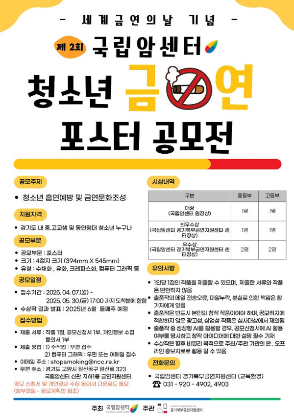 세계금연의날 기념 제2회 국립암센터 청소년 금연 포스터 공모전 공모분야 웹툰/포스터/미술 접수기간2025.04.07 ~ 2025.05.30 D+266 종료 참가자격 청소년 주최국립암센터 주관경기북부금연지원센터 1등상금(상품)기타 홈페이지 바로가기 첨부파일 다운로드 유의사항 ※본 내용은 참고 자료로 내용의 오류와 변동에 대해 책임지지 않습니다. (오류 및 변동 신고는 상단의 '제안/오류' 신고를 통해 해주십시오.) ※주최사 사정에 따라 일정 및 내용이 변경될 수 있으니 주최사 홈페이지 등을 통해 관련 안내를 수시로 확인하시기 바랍니다. 상세내용 ■ 제목세계금연의날 기념 제2회 국립암센터 청소년 금연 포스터 공모전 ■ 개요제38회 세계금연의날을 기념하여 청소년 대상으로 흡연에 대한 경각심과 위해성을 알리고, 함께 만들어가는 흡연예방 및 금연문화조성을 위해 제2회 국립암센터 청소년 금연포스터 공모전을 개최합니다. 많은 참여와 관심 부탁드립니다. ■ 기간 - 접수기간 : 2025.04.07.(월) ~ 2025.05.30.(금) 17:00 도착분에 한함 - 수상작 결과 발표 : 2025. 6월 둘째주 예정 ■ 참가자격경기도 내 중.고교생 및 동연령대 청소년 누구나 ■ 참여방법 / 접수방법<공모주제> 청소년 흡연예방 및 금연문화조성 <공모부문> - 부문 : 포스터 - 크기 : 4절지 크기(394mm × 545mm) - 유형 : 수채화, 유화, 크레파스화, 컴퓨터그래픽 등 <접수방법> - 제출서류 : 작품 1점, 공모신청서 1부, 개인정보수집 동의서 1부 - 제출방법 : 1) 수작업 : 우편 접수 2) 컴퓨터그래픽 : 우편 또는 이메일 접수 ※ 공모신청서 및 개인정보동의서는 첨부파일 다운로드 필요 ■ 시상내용 / 혜택 1) 대상(국립암센터 원장상) : 중등부 1명 / 고등부 1명 2) 최우수상 (국립암센터 경기북부금연지원센터 센터장상) : 중등부 1명 / 고등부 1명 3) 우수상 (국립암센터 경기북부금연지원센터 센터장상) : 중등부 2명 / 고등부 2명 ■ 유의사항 - 1인당 1점의 작품을 제출할 수 있으며, 제출된 서류와 작품은 반환하지 않음 - 출품작의 메일 전송오류, 파일누락, 분실로 인한 책임은 참가자에게 있음. - 출품작은 반드시 본인의 창작물이어야 하며, 공모 취지에 적합하지 않은 광고성, 상업성 작품은 심사대상에서 제외됨 - 출품작 중 생성형 AI를 활용할 경우, 공모신청서에 AI 활용 여부를 명시하고 본인의 창의적 아이디어를 어떻게 작품에 담았는지에 대한 설명을 명확히 제시하여야 함 - 수상작은 향후 비영리 목적으로 주최/주관기관의 온·오프라인 홍보자료로 활용될 수 있음 ■ 문의 국립암센터 경기북부금연지원센터(교육환경) - 전화 : 031-920-4902,4903 목록