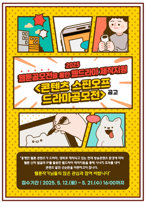 2025 웹툰공모전을 통한 웹드라마 제작지원 '콘텐츠 스핀오프 드라마공모전' 공모분야 문학/시나리오, 웹툰/포스터/미술 접수기간2025.05.12 ~ 2025.05.21 D+275 종료 참가자격 제한없음, 기타 제한 주최방송콘텐츠진흥재단 주관방송콘텐츠진흥재단 후원/협찬유진이엔티 1등상금(상품)1천만원 초과 홈페이지 바로가기 첨부파일 다운로드 유의사항 ※본 내용은 참고 자료로 내용의 오류와 변동에 대해 책임지지 않습니다. (오류 및 변동 신고는 상단의 '제안/오류' 신고를 통해 해주십시오.) ※주최사 사정에 따라 일정 및 내용이 변경될 수 있으니 주최사 홈페이지 등을 통해 관련 안내를 수시로 확인하시기 바랍니다. 상세내용 ■ 제목2025 웹툰공모전을 통한 웹드라마 제작지원 '콘텐츠 스핀오프 드라마공모전' ■ 개요흥행한 웹툰 콘텐츠가 드라마, 영화로 제작되고 있는 현재 방송콘텐츠 환경에 따라 웹툰 신작 발굴과 IP를 활용한 웹드라마 제작지원을 통해 시너지 효과를 내어 콘텐츠 발전 선순환을 마련하고자 합니다. ■ 기간 - 접수기간 : 2025. 5. 12.(월) ~ 5. 21.(수) 16:00까지 ■ 참가자격웹툰에 관심 있는 신인 작가 또는 신작을 가지는 있는 작가 (만 19세 이상의 대한민국 국적) ■ 참여방법 / 접수방법<공모내용> - 자유주제(※ 단, 사회 규범상 폭력성 및 선정성이 지나치거나 규격 미달 작품은 심사 대상에서 제외) - 장르에는 제한 없으나 CG 등 특수 촬영 없이 영상화가 가능한 작품 <공모조건> - 선정된 수상작은 IP를 활용해 웹드라마로 제작되는 것에 동의해야 하며, 동의하지 않는 경우 최종 선정이 불가함 - 선정된 수상작 원고는 웹드라마 제작을 위해 재단 홈페이지를 통해 공개 <접수방법> 방송콘텐츠진흥재단 홈페이지 온라인 접수 <제출서류> 아래 [웹툰원고] + [붙임1.] 작품기획서 + [붙임2.] 참가신청서 총 3개 파일을 하나로 압축하여 제출(작품명_대표작가명.zip) (1) [웹툰원고] 작품명_대표작가명.zip - 최소 60컷 이상의 원고 3화 분량(2, 3화는 콘티로 접수 가능) ※ 3화 모두 원고로 제출 시 가산점 - 제출형식 : 가로 720px, 해상도 300dpi, JPG형식 (2) [붙임1] 작품기획서_작품명_대표작가명.hwp - 작품 기획의도, 전체 시놉시스(기승전결), 캐릭터 시트 등 포함 (3) [붙임2] 참가신청서_대표작가명.hwp/.pdf * 제출서류는 1) + 2) + 3) 모두 합쳐서 100MB 이하로 접수가능 * [붙임2.] 참가신청서를 제외한 웹툰원고, 작품기획서 내에 개인정보 기재 금지 * 지정양식, 파일형식 미준수하여 제출 시, 심사 대상에서 제외 ■ 시상내용 / 혜택 - 대상 1편 : 3,000만원 - 우수상 2편 : 각 1,000만원 ■ 유의사항 ○ 1인당 2작품까지 공모 가능 ○ 공모조건에 동의한 작품에 한해 제출 가능 ○ 제출작품은 개인(팀)의 순수창작물로 타인의 저작권을 침해하지 않아야 함 ○ 수상작 저작권은 수상자가 소유하며, 본 공모에 당선된 수상자는 수상자 서약서를 체결함 ○ 접수된 서류는 반환하지 않으나, 선정되지 않은 응모작은 공모전이 끝나면 삭제함 ○ 웹툰 원고, 작품기획서 내 개인정보(이름, 연락처, 이메일 등) 기재 시 심사에서 제외 ■ 문의 콘텐츠사업국 T. 02-6123-4301 목록