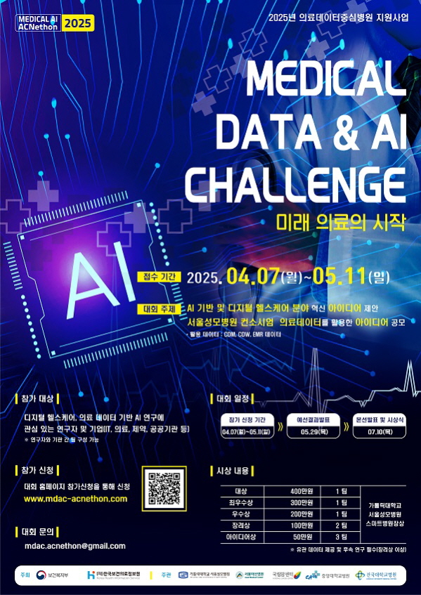 Medical Data & AI Challenge : 미래의료의 시작 (컨소시엄 의료데이터를 활용한 AI 혁신 아이디어 공모전… 공모분야 기획/아이디어/마케팅, 대회/전시/제작 접수기간2025.04.07 ~ 2025.05.11 D+284 종료 참가자격 기타 제한 주최보건복지부 1등상금(상품)200만원~499만원 홈페이지 바로가기 첨부파일 다운로드 유의사항 ※본 내용은 참고 자료로 내용의 오류와 변동에 대해 책임지지 않습니다. (오류 및 변동 신고는 상단의 '제안/오류' 신고를 통해 해주십시오.) ※주최사 사정에 따라 일정 및 내용이 변경될 수 있으니 주최사 홈페이지 등을 통해 관련 안내를 수시로 확인하시기 바랍니다. 상세내용 ■ 제목Medical Data & AI Challenge : 미래의료의 시작 (컨소시엄 의료데이터를 활용한 AI 혁신 아이디어 공모전) ■ 기간 - 접수기간 : 2025년 4월 7일(월) ~ 2025년 5월 11일(일) 23:59까지 - 결과 발표 : 2025년 5월 29일(목) ※ 아이디어상 3팀 / 본선 5팀 발표 평가 준비 필수 - 시상식 및 행사 : 2025년 7월 10일(목), 오후 2시 / 성의회관 대강당 ※ 본선 5팀 발표 평가 후 최종 수상팀 결정(시상식 당일) ※ 수상팀(대상, 최우수상, 우수상, 장려상)은 컨소시엄 연구자와 매칭하여 후속 연구 진행 필수 ■ 참가자격가. 의료 데이터를 활용한 연구에 관심있는 기업 나. 의료 데이터를 활용한 연구에 관심있는 연구자 및 연구팀 다. 연구자와 기업 간 팀 구성 가능 ■ 참여방법 / 접수방법● 대회주제 : AI 기반 및 디지털헬스케어분야 ● 접수방법 : 대회 홈페이지 [참가 신청] 메뉴를 통한 접수 ※ 참가신청서, 보안서약서, 개인정보동의서, 공동연구 확약서 필수 제출 ■ 시상내용 / 혜택 - 대상 (1등) 400만원 및 상장 - 최우수상 (2등) 300만원 및 상장 - 우수상 (3등) 200만원 및 상장 - 장려상 (4~5등) 100만원 및 상장 - 아이디어상 (6~8등) 50만원 및 상장 ■ 유의사항1. 동일 아이디어로 타 경진대회(중앙, 시도, 타공공기관 등이 개최한 유사 대회)에 입상한 경우 참가가 제외되며, 수상이 취소될 수 있습니다. 2. 타인의 아이디어, 기술 등을 모방하였을 경우 발생하는 모든 민·형사상의 책임은 참가자 본인에게 있으며, 추후 문제 발생 시 수상 취소 및 상금환수 조치됩니다. 3. 신청·접수 이후 공개된 아이디어는 법적으로 보호받을 수 없으며, 이를 보호받기 위해서는 신청자가 공개 이전에 직접 지식재산권을 획득하여야 합니다.4. 참가팀 수상작 정보는 행사 종료 후, 대회 성과 홍보 및 보고를 위해 활용될 수 있습니다.5. 심사결과에 따라 적합한 수상작이 없을 경우 시상 내역이 변경될 수 있습니다.6. 심사 세부 결과는 비공개 원칙입니다. ■ 문의서울성모병원 정보전략팀(02-2258-5809) / mdac.acnethon@gmail.com 목록
