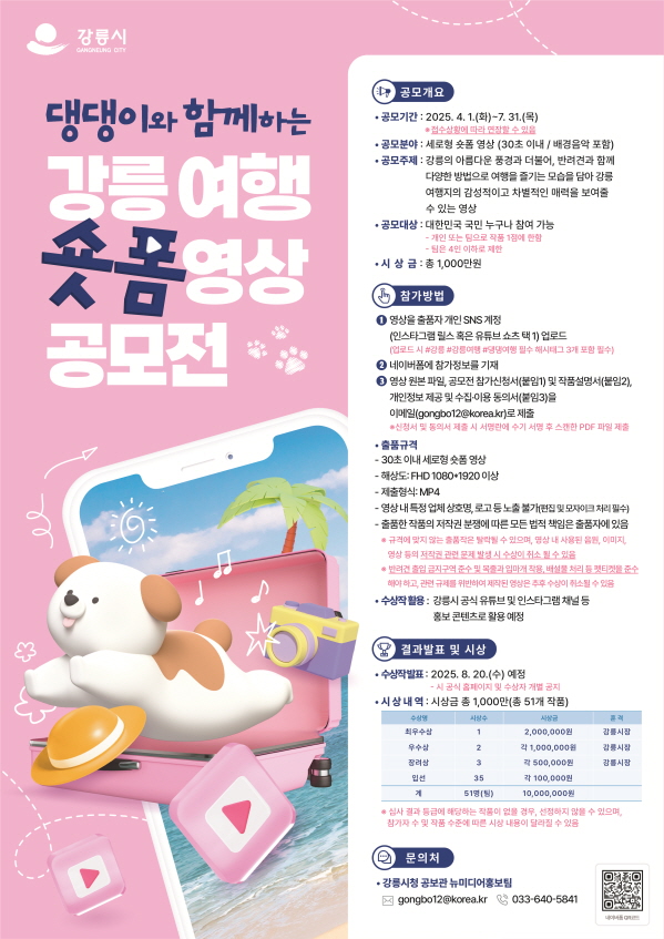 댕댕이와 함께하는 강릉 여행 숏폼 영상 공모전 공모분야 사진/영상 접수기간2025.04.01 ~ 2025.07.31 D+203 종료 참가자격 제한없음 주최강릉시 1등상금(상품)200만원~499만원 홈페이지 바로가기 첨부파일 다운로드 유의사항 ※본 내용은 참고 자료로 내용의 오류와 변동에 대해 책임지지 않습니다. (오류 및 변동 신고는 상단의 '제안/오류' 신고를 통해 해주십시오.) ※주최사 사정에 따라 일정 및 내용이 변경될 수 있으니 주최사 홈페이지 등을 통해 관련 안내를 수시로 확인하시기 바랍니다. 상세내용 ■ 제목댕댕이와 함께하는 강릉 여행 숏폼 영상 공모전 ■ 개요반려견과 함께하는 강릉 여행지의 매력적인 모습을 소개하고 효과적으로 홍보할 수 있는 숏폼 영상 발굴을 위하여 댕댕이와 함께하는 강릉 여행 숏폼 영상 공모전을 개최하오니 적극 응모하여 주시기 바랍니다. ■ 기간 - 접수 기간 : 2025. 4. 1.(화)~7. 31.(목) *접수상황에 따라 연장할 수 있음 ■ 참가자격대한민국 국민 누구나 참여 가능- 개인 또는 팀으로 작품 1점에 한함- 팀은 4인 이하로 제한 ■ 참여방법 / 접수방법<공모분야> 세로형 숏폼 영상 (30초 이내 / 배경음악 포함) <공모주제> 강릉의 아름다운 풍경과 더불어, 반려견과 함께 다양한 방법으로 여행을 즐기는 모습을 담아 강릉 여행지의 감성적이고 차별적인 매력을 보여줄 수 있는 영상 <참가방법>① 영상을 출품자 개인 SNS 계정(인스타그램 릴스 혹은 유튜브 쇼츠 택 1) 업로드 (업로드 시 #강릉 #강릉여행 #댕댕여행 해시태그 3개 포함 필수)② 네이버폼에 참가정보를 기재(https://naver.me/5l7T1bPx)③ 영상 원본 파일, 공모전 참가신청서(붙임1) 및 작품설명서(붙임2), 개인정보 제공 및 수집·이용 동의서(붙임3)을 이메일(gongbo12@korea.kr)로 제출※신청서 및 동의서 제출 시 서명란에 수기 서명 후 스캔한 PDF 파일 제출 <출품규격>- 30초 이내 세로형 숏폼 영상- 해상도: FHD 1080*1920 이상- 제출형식: MP4- 영상 내 특정 업체 상호명, 로고 등 노출 불가(편집 및 모자이크 처리 필수)- 출품한 작품의 저작권 분쟁에 따른 모든 법적 책임은 출품자에 있음 ■ 시상내용 / 혜택 - 최우수상 1팀 : 200만원 및 강릉시장상 - 우수상 2팀 : 각 100만원 및 강릉시장상 - 장려상 3팀 : 각 50만원 및 강릉시장상 - 입선 35팀 : 각 10만원 ■ 유의사항※ 규격에 맞지 않는 출품작은 탈락될 수 있으며, 영상 내 사용된 음원, 이미지, 영상 등의 저작권 관련 문제 발생 시 수상이 취소 될 수 있음.※ 반려견 출입 금지구역 준수 및 목줄과 입마개 착용, 배설물 처리 등 펫티켓을 준수해야 하고, 관련 규제를 위반하여 제작된 영상은 추후 수상이 취소될 수 있음. ■ 문의강릉시청 공보관 뉴미디어홍보팀 - 전화 : 033-640-5841 - 이메일 : gongbo12@korea.kr 목록