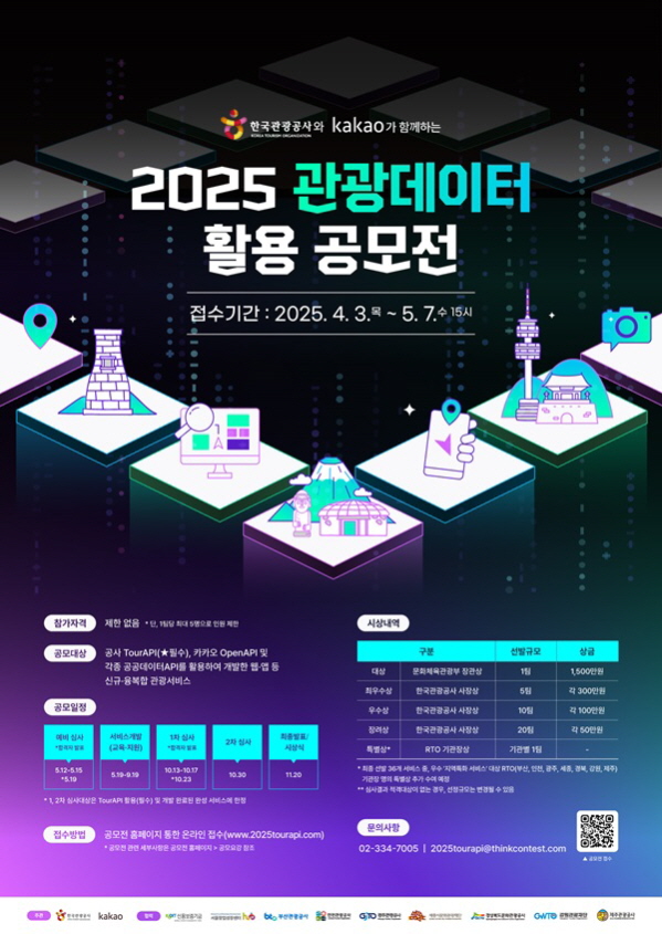 2025 관광데이터 활용 공모전 공모분야 게임/어플/프로그램, 대회/전시/제작 접수기간2025.04.03 ~ 2025.05.07 D+288 종료 참가자격 제한없음 주최한국관광공사, kakao 주관한국관광공사, kakao 1등상금(상품)1천만원 초과 홈페이지 바로가기 첨부파일 다운로드 유의사항 ※본 내용은 참고 자료로 내용의 오류와 변동에 대해 책임지지 않습니다. (오류 및 변동 신고는 상단의 '제안/오류' 신고를 통해 해주십시오.) ※주최사 사정에 따라 일정 및 내용이 변경될 수 있으니 주최사 홈페이지 등을 통해 관련 안내를 수시로 확인하시기 바랍니다. 상세내용 ■ 제목2025 관광데이터 활용 공모전 ■ 기간 - 접수 기간 : 2025년 4월 3일 ~ 5월 7일(수) 15시 ■ 참가자격제한없음 ※ 1팀당 최대 5명으로 인원제한 ※ 동일 서비스로 본 공모전 수상 및 공사 주관 지원사업 수혜자는 참가 제외 대상임 ■ 참여방법 / 접수방법<공모대상>공사 필수카카오 및 각종 공공데이터를 활용하여 개발한 웹앱 등 신규융복합 관광서비스 - 신규 : 공사 TourAPI(필수) 및 공공데이터 등을 활용하여 신규 개발한 서비스 - 융복합 : 기존개발 및 운영하고 있는 웹 · 앱서비스에 TourAPI(필수) 및 공공데이터 등을 접목하여 개선 및 고도화한 서비스 <신청방법> 공모전 홈페이지 온라인 접수 - 공모전 홈페이지 ➊ 접속 양식 참가신청서 ➋제안서 다운로드 및 작성 기한 내 온라인 접수 ■ 시상내용 / 혜택 - 대상 문체부 장관상 1팀 : 1,500만원 - 최우수상 공사 사장상 5팀 : 각 300만원 - 우수상 공사 사장상 10팀 : 각 100만원 - 장려상 공사 사장상 20팀 : 각 50만원 - 특별상 RTO 기관장상 : 기관별 1팀 ※ 수상팀 후속지원은 공고문 참조 ■ 유의사항 - 동일 서비스로 본 공모전 수상 및 공사 주관 지원 사업 수혜자 서비스 개발 구축지원 타 공모전 입상작 등은 심사에서 제외됩니다. - 공정한 심사를 위해 접수 마감 시까지 제출된 서류만 평가하며 제출서류 미비(작성 가이드 미 준수 작성 항목 누락 등)로 인한 불이익은 지원자 책임입니다. - 참가신청서 내 팀 구성원 정보는 정확히 기재해 주시기 바라며 기재 착오 또는 누락 연락 불가로 인한 불이익은 지원자 책임입니다 - 개발 서비스에 대한 소유권은 지원자에게 있으며 공모전 참여를 위한 제출서류 공모작 등 초상권 저작권 표절 등 관련 법적인 문제가 발생할 경우 모든 책임은 지원자에게 있습니다 - 제출내역 및 제출서류가 허위 또는 결격사유가 있다고 판단되는 경우 평가대상 제외 수상 취소 및 상금을 회수할 수 있습니다 - 심사는 외부 전문 심사위원이 공정하게 평가하며 심사 세부결과 등 관련 자료는 일체 비공개합니다 - 심사결과 적격대상이 없는 경우 선정규모는 변경될 수 있습니다 ■ 문의공모전 운영 사무국 - 전화 : 02-334-7005 - 이메일 : 2025tourapi@thinkcontest.com 공모전 접수 페이지 : https://www.2025tourapi.com/ 목록