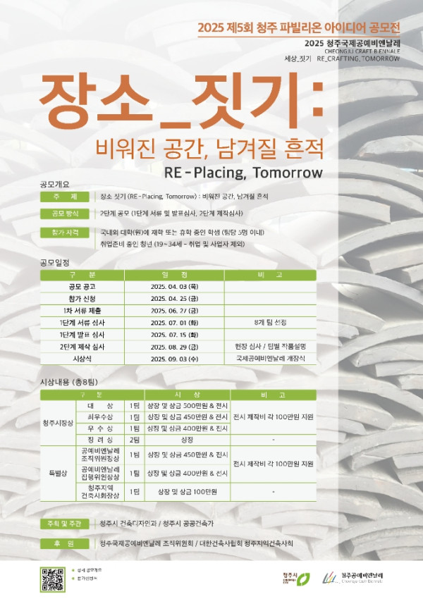 2025 제5회 청주 파빌리온 아이디어 공모전 공모분야 건축 설계/건축디자인 접수기간2025.04.03 ~ 2025.04.25 D+300 종료 참가자격 대학(원)생/청년 주최청주시 주관청주시 1등상금(상품)500만원~1천만원 홈페이지 바로가기 첨부파일 다운로드 유의사항 ※본 내용은 참고 자료로 내용의 오류와 변동에 대해 책임지지 않습니다. (오류 및 변동 신고는 상단의 '제안/오류' 신고를 통해 해주십시오.) ※주최사 사정에 따라 일정 및 내용이 변경될 수 있으니 주최사 홈페이지 등을 통해 관련 안내를 수시로 확인하시기 바랍니다. 상세내용 ■ 제목2025 제5회 청주 파빌리온 아이디어 공모전 ■ 개요 예술, 디자인과 미라는 공통 속성을 가진 건축과 공예가 청주시의 대표적인 국제문화예술 행사인 “2025 청주공예비엔날레”와 동반하는 의미있는 기회의 장을 마련함과 동시에 건축의 공공적 가치의 중요성을 알려 건축문화의 진흥을 도모하기 위해 2025 제5회 청주 파빌리온 아이디어 공모전을 추진하오니 창의적 사고와 열정을 가진 대학(원)생들과 취업을 앞 둔 청년들의 많은 참여를 바랍니다. ■ 기간 - 신청 기간 : 2025. 4. 3(수) ~ 4. 25.(금) 18시 마감 / 이메일 접수 - 1차 서류 제출 : 2025. 6. 27.(금) 18시 마감 / 이메일 접수 ■ 참가자격 - 전국 국내‧외 대학(원)에 재학 또는 휴학 중인 개인 또는 팀 - 공고일 기준 19세~34세의 청년으로 구성된 개인 또는 팀 - 팀당 5명 이내 구성/ 현재 재직 또는 사업을 운영 중이라면 참여불가 ■ 참여방법 / 접수방법<공모 주제> “장소 짓기 – RE-Placing Tomorrow” * 위 치 : 청주시 청원구 내덕동 861 번지, P01 주차장 옥상 잔디밭 <제출방법> ❍ 참가신청 : 참가신청서 제출 [서식1] / E-mail 제출(rmdwjd13@korea.kr) ❍ 1차 제출 : 팀당 10분 이내 발표 / E-mail 제출(rmdwjd13@korea.kr) - 기획안 10페이지 이내(A4기준) ※ 프레젠테이션이 가능한 형태의 파일 제출 - 개인정보 제공 및 이용동의서[서식2], 서약서[서식3] - 건강·고용보험자격득실확인서 또는 재학(휴학)증명서 ❍ 2차 제출 : - 내덕동 861번지, P01 주차장 옥상 잔디밭에 작품 설치 및 작품 설명 준비 - 튜터(팀당 튜터2명 배정)와의 소통 및 협업을 통해 2차 심사 준비 - 확약서[서식4], 작품설명서 제출(A4기준 2매 이내)[서식5] - 정해진 규격(바닥사이즈 5m(가로) × 5m(세로) × 높이 3.6m) 내 설치 ※ 기상 변화에 따라 설치 일정 변동될 수 있음 ■ 시상내용 / 혜택 구 분시 상 비고청주시장상대 상1팀상장 및 상금 500만원 &전시전시 제작비 1,000천원 지원최우수상1팀상장 및 상금 450만원 &전시우 수 상1팀상장 및 상금 400만원 &전시장 려 상2팀상장 특별상공예비엔날레조직위원장상1팀상장 및 상금 450만원 &전시전시 제작비 1,000천원 지원공예비엔날레집행위원장상1팀상장 및 상금 400만원 &전시청주지역건축사회장상1팀상장 및 상금 100만원 ※ 대상, 최우수, 우수, 조직위원장, 집행위원장상은 작품을 제작하여 청주공예비엔날레 행사 기간 동안 전시 참여※ 접수 상황 및 심사 결과에 따라 시상 내용은 변동이 있을 수 있음 ■ 유의사항 ❍ 공공재정환수법 시행사항 유의 [붙임1] ❍ 공모전과 관련된 모든 진행상황 청주시 누리집 공개(1, 2차 심사결과 포함) ❍ 2차 심사(제작) 준비를 위해 상금 중 일부(팀당 300만원) 선지급 (단, 참가자 전원의 확약서 제출 필수) ※ 상금과 지원된 전시제작비 이외의 재료비·철거비 등 지원 불가 ❍ 1차 상금 수령 후 2차 작품을 설치하지 않으면 수상은 취소되며 상금은 반환 ❍ 2차 진출팀은 시상식 전 프로필(사진 포함)과 작품 제작 과정 및 전시 사진(30매 이상), 동영상(3분 내외) 제출 ❍ 작품 설치 및 철거 관련 주의사항 - 다수가 이용하는 잔디마당임을 감안하여 안전성 및 내구성 확보해야 함 - 팀원으로 등록된 인원만 작품 제작 참여 가능 - 팀당 지정된 설치 공간 내 설치하여야 하며 *설치 규격을 준수해야함 *설치 규격 : 5m(가로)×5m(세로)×3.6m(높이) 이내 - 주 재료는 친환경재료 또는 재활용 가능한 소재를 활용해야 하며 기획안 작성시 전시 후 재활용방안 제시 - 작품 설치 후 유지ㆍ보존을 위해 참가자가 관리(2차 진출팀 협의) - 작품 설치 후 2달 정도 전시 후 철거 예정, 자진 철거하여야 함 ❍ 다음에 해당하는 작품은 출품 할 수 없으며 해당 시 수상 취소 - 표절・모방 또는 타 공모전에 출품한 동일・유사한 작품 - 다른 작품을 표절 및 모방한 것으로 인정되는 디자인 - 본 공모전에 명시된 출품물 규격에 적합하지 않은 디자인 ❍ 표절 및 모방에 대한 심사는 심사위원의 결정에 따름 ❍ 수상 후에라도 위반 사실이 밝혀질 경우 수상 취소 및 상금을 반환해야 함 ❍ 출품된 작품의 저작권은 응모자에게 있음 - 단, 모든 출품작의 비상업적 활동에 한하여 홍보자료, 교육자료, 출판 및 전시 등을 위해 사용할 수 있음 - 제출된 작품의 저작권 분쟁에 따른 모든 책임은 응모자에게 있음 ❍ 저작권 분쟁에 따른 문제 발생 시 시상 취소 및 상금을 반환해야 함 ■ 문의청주시 주택토지국 건축디자인 (담당자 장유주, ☎043-201-2542) 목록