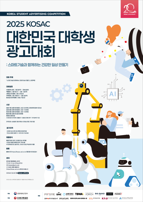 2025 대한민국 대학생 광고대회 (KOSAC) 공모분야 기획/아이디어/마케팅, 기타분야 접수기간2025.05.07 ~ 2025.05.15 D+280 종료 참가자격 대학(원)생/청년 주최문화체육관광부 주관한국광고총연합회 후원/협찬피알원, The SMC, 엠포스, TBWA KOREA, 애드리치, 빅밴드앤코, 이노레드, 휘닉스커뮤니케이션즈, 드림인사이트, 스프링앤프라워, 서비스플랜코리아, 한국광고학회, 한국광고홍보학회, 한국광고PR실학회 1등상금(상품)500만원~1천만원 홈페이지 바로가기 첨부파일 다운로드 유의사항 ※본 내용은 참고 자료로 내용의 오류와 변동에 대해 책임지지 않습니다. (오류 및 변동 신고는 상단의 '제안/오류' 신고를 통해 해주십시오.) ※주최사 사정에 따라 일정 및 내용이 변경될 수 있으니 주최사 홈페이지 등을 통해 관련 안내를 수시로 확인하시기 바랍니다. 상세내용 ■ 제목2025 대한민국 대학생 광고대회(KOSAC) ■ 개요2025 대한민국 대학생 광고대회(KOSAC, Korea Student Advertising Competition)는 광고산업 활성화와 예비 광고인들의 실무능력향상을 목표로 마련된 국내 대표 산학연계 프로그램입니다.문화체육관광부의 지원과 광고업계 및 학계의 후원으로 개최되는 본 대회는 캠페인 전 과정에 참여하고 경쟁 프레젠테이션을 통해 우수광고인을 선발하는 특별한 경험을 제공할 것입니다. ■ 기간 - 접수기간 : 2025년 5월 7일(수) ∼ 5월 15일(목), 23:50까지 ■ 참가자격o 2년제 이상 대학 및 대학원 재(휴)학생/지도교수를 선임한 2~5인의 팀 구성 필수※ 2025년도 8월 졸업예정자, 국내 대학에 재학 중인 외국인도 참가 가능※ 광고업계 종사자, 사회인, 해외 대학에 재학 중인 외국인, 한국인 유학생은 참가 불가 ■ 참여방법 / 접수방법<대회주제>「스마트기술과 함께하는 건강한 일상 만들기」프로젝트o 아래 3가지 주제 중 하나를 선택하여 캠페인을 제시하시오. (1) 스마트 디바이스와 기술을 활용한 편리하고 살기 좋은 세상 만들기 캠페인 제안- 일상생활에서 불편한 점이나 사회문제를 스마트 디바이스와 기술을 활용해 해결할 수 있는 아이디어를 제시하고 이를 확산시킬 수 있는 캠페인 전략 제시(2) 디지털 세상 속, 균형 잡힌 라이프스타일 만들기 캠페인 제안- 디지털 기기와 소셜미디어 등을 긍정적으로 활용하면서 오프라인의 건강한 삶을 누릴 수 있는 균형 잡힌 라이프스타일 만들기 캠페인 전략 제시(3) 올바른 인공지능(AI) 사용으로 풍요로운 삶 만들기 캠페인 제안- 인공지능기술이 빠르게 일상에 스며들고 있는 지금, 이를 올바르고 책임 있게 활용하여 우리의 삶을 더욱 풍요롭게 만들자는 메시지를 담은 캠페인 전략 제시 <제출방식>o (부문) 출품 주제에 대한 크리에이티브 제작물 시안을 포함한 캠페인 전체 기획서o (규격) 파워포인트 슬라이드 30장 이내- 슬라이드 크기 : MS파워포인트 페이지 설정 따름(16:9, 25.4cm×14.2cm)- 기획서 30장 내에 아이디어를 효율적으로 전달할 수 있는 크리에이티브 제작물을 포함하여 구성o (내용) 온오프라인 매체 제한 없이 아이디어를 효율적으로 확산시킬 수 있는 전략제시o (유의사항) ① 동영상/음성 파일 첨부 불가 ※ 서류심사 통과자(지역대회 및 전국대회 심사 대상)는 발표용 파일(ppt, pptx)로 수정·보완하여 제출할 수 있으며, 동영상/음성파일 첨부 가능 ② 파일형식 : ppt, pptx, PDF(파워포인트 파일을 PDF로 변환하여 제출 가능) ※제출한 폰트가 심사 노트북에서 정상적으로 적용되지 않는 등의 시스템적 문제가 발생할 수 있으므로, 가능하면 PDF 버전으로 제출하는 것을 권장※키노트 제출 불가 ③ 출품방법 : 홈페이지(http://kosac.ad.co.kr)를 통한 온라인 접수(우편, 방문접수 불가)o PPT 작품파일, 폰트 파일을 각각 제출o 폰트파일 업로드 시에는, 개별적으로 사용한 폰트(다운로드 받은 폰트)들은 반드시 단일 폴더에 넣고 압축(zip)파일 형태로 업로드o 기획서 작품 용량제한: 100MB 이하 (작품파일, 폰트 등을 포함한 용량) ※PDF파일 제출 시 별도의 폰트파일 제출필요 없음 ④ 지역대회(예심PT) 및 전국대회(본심PT)는 제출된 기획서를 기반으로 발표시간 10분(전국대회), 10분(지역대회)으로 진행되며 별도의 질의응답 시간은 없음 <출품 및 제작규정>o (PPT표지 및 내지 규정) ① KOSAC 심사 전 과정은 Blind Test로 진행 ② PPT 표지에 팀명, 작품 제목 외에는 학교, 학과, 기타 소속, 이름 등 개인정보 작성 금지③ PPT 내지에도 학교, 학과, 기타 소속, 이름 등 개인정보 노출 금지 특히 각 학교 내 설문진행 결과자료 등에 학교명, 개인이름 작성 금지 (예: ‘광고대학교 3학년 김코삭’→ ‘OO대학교 3학년 김OO’으로 기입) ※ 제출방식을 준수하지 않은 작품은 심사에 불이익을 당할 수있습니다. o (제작규정) ① 수상작은 반환하지 않으며, 수상작의 저작권은 출품자에게 귀속됩니다. 단, 수상작에 한해 연합회에서 대회홍보, 마케팅, 교육 등의 목적으로 출품작을 사용할 수 있습니다. ② 출품작품은 기존에 발표되지 않은 순수한 창작 작품이어야 합니다. 표절 또는 모방작으로 판명될 경우 심사에서 제외되며, 수상하였더라도 추후에 표절 사실이 밝혀질 경우 수상을 취소합니다. ③ 인공지능(AI)을 활용할 수 있으나 사