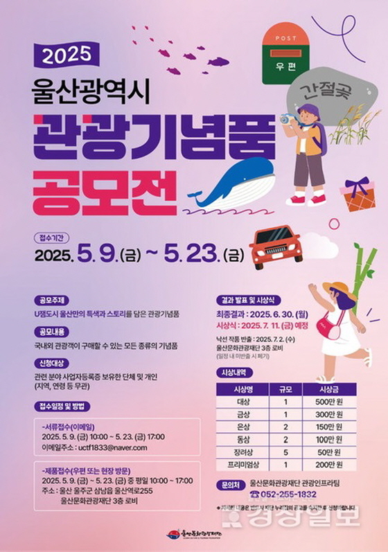 2025 울산광역시 관광기념품 공모 공모분야 대회/전시/제작, 기타분야 접수기간2025.05.09 ~ 2025.05.23 D+272 종료 참가자격 기타 제한 주최울산문화관광재단 주관울산문화관광재단 1등상금(상품)500만원~1천만원 홈페이지 바로가기 첨부파일 다운로드 유의사항 ※본 내용은 참고 자료로 내용의 오류와 변동에 대해 책임지지 않습니다. (오류 및 변동 신고는 상단의 '제안/오류' 신고를 통해 해주십시오.) ※주최사 사정에 따라 일정 및 내용이 변경될 수 있으니 주최사 홈페이지 등을 통해 관련 안내를 수시로 확인하시기 바랍니다. 상세내용 ■ 제목2025 울산광역시 관광기념품 공모 ■ 기간 - 서류 접수 : 2025. 5. 9.(금) 10:00 ~ 5. 23.(금) 17:00 <15일간> - 실물 접수 : 2025. 5. 9.(금) ~ 5. 23.(금) 중 평일 10:00~17:00 ※주말 및 공휴일, 12:00~13:00제외 ■ 참가자격관련 분야 사업자등록증 보유 단체 또는 개인 ■ 참여방법 / 접수방법<공모주제> U잼도시 울산만의 특색과 스토리를 담은 관광기념품 <공모분야>(1) 일반 분야 : 국내·외 관광객을 대상으로 판매할 수 있고, 즉시 생산이 가능한 제품(2) 프리미엄 분야 : 국내·외 관광객을 대상으로 판매할 수 있고, 선물 및 장식용으로 가능한 제품 <서류 접수 방법> 이메일 접수 uctf1833@naver.com 제출 내용① (필수) 참가신청서(서식1) ② (선택) 증빙서류 - 식품·식품첨가물품목제조보고서(식품 경우 필수) - 화장품제조업·책임판매업등록증(화장품 경우 필수) - 기타 신청 제품 관련 인증서류 등 ※ 실물 접수 방법 및 자세한 내용은 홈페이지 공고문 참조 ■ 시상내용 / 혜택 - 대상 1 : 500만원 - 금상 1 : 300만원 - 은상 2 : 각 150만원 - 동상 2 : 각 100만원 - 장려상 5 : 각 50만원 - 프리미엄상 1 : 200만원 ■ 유의사항유의사항은 공고문의 내용을 참조 바랍니다. ■ 문의재단법인 울산문화관광재단 관광인프라팀 (052-255-1832) - 안내시간 : 평일 09:00~18:00 (점심시간 12:00~13:00 제외 목록