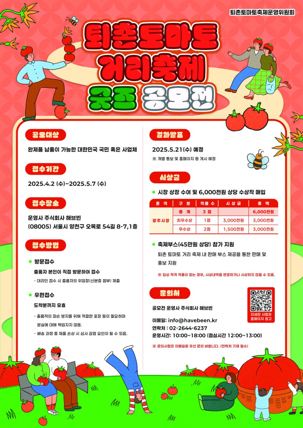 2025 퇴촌토마토거리축제 굿즈 공모전 공모분야 대회/전시/제작, 기타분야 접수기간2025.04.02 ~ 2025.05.07 D+287 종료 참가자격 기타 제한 주최퇴촌토마토축제운영위원회 1등상금(상품)200만원~499만원 홈페이지 바로가기 첨부파일 다운로드 유의사항 ※본 내용은 참고 자료로 내용의 오류와 변동에 대해 책임지지 않습니다. (오류 및 변동 신고는 상단의 '제안/오류' 신고를 통해 해주십시오.) ※주최사 사정에 따라 일정 및 내용이 변경될 수 있으니 주최사 홈페이지 등을 통해 관련 안내를 수시로 확인하시기 바랍니다. 상세내용 ■ 제목 2025 퇴촌토마토거리축제 굿즈 공모전 ■ 기간 - 접수기간 : 2025.04.02.(수) ~ 2025.05.07.(수) ■ 참가자격완제품 납품이 가능한 대한민국 국민 혹은 사업체 ❍ 퇴촌의 명물 ‘토마토’를 상징적으로 활용한 다양한 굿즈 및 굿즈 ❍ 공예품, 공산품, 캐릭터상품 등으로 상품화와 다량생산이 가능한 완제품 ■ 참여방법 / 접수방법● 출품요건 : 개인 혹은 업체 당 3개 이하 <접수방법>방문 또는 우편접수 ❍ 방문접수 : 출품자 본인이 직접 방문하여 접수 - 대리인 접수 시 출품자의 위임장(신분증 첨부) 제출 [서식6] ※ 주차장 이용이 불가합니다. 대중교통을 적극 이용해주시기 바랍니다. 자가용 이용 시 인근 주차장 정보를 사전에 확인 후 방문해주시기 바랍니다. ❍ 우편접수 : 도착분까지 유효 - 출품작의 파손 방지를 위해 적절한 포장 등이 필요하며 분실에 대해 책임지지 않음. 배송 과정 중 제품 손상 시 심사 감점 요인이 될 수 있음. <제출내역> ① 출품작품 ② 참가신청서 [서식 1] ③ 개인정보 수집동의서 각 1부 [서식 2] ④ 출품작 설명서 [서식 3] ⑤ 서약서 [서식 4] ⑥ 공모전 수상작 이용 동의서 [서식 5] ⑦ 위임장(필요시) [서식 6] ⑧ 신분증 사본 ⑨ 사업자등록증(사업체 제출자만 해당) <접수장소>운영대행사 (주식회사 해브빈) : (08005) 서울시 양천구 오목로 54길 8-7 1층 <응모제한> ❍ 양산 불가능한 제품 ❍ 타 공모전 등에 출품하여 입상한 제품 ❍ 국내·외에 이미 상품화된 제품의 유사 작품 및 모방품 ❍ 저작권, 상표권, 특허권 등과 관련하여 법적 분쟁의 소지가 있는 제품 ❍ 주문 제작(OEM)하는 하청업체는 원 주문자의 제품을 출품할 수 없음 ❍ 보관·운반이 곤란하여 축제 굿즈로 상품화하기 어려운 제품 ❍ 제품, 포장, 설명서 등이 하나의 세트로 구성되지 않은 제품 ❍ 부패 및 변질의 위험이 있어 축제 굿즈로 부적절한 제품(가공식품 등) ❍‘출품요건’에 위배 되는 제품 ❍ 그 밖에 응모에 부적절하다고 판단되는 제품 등 ※ 기존 제작된 타인의 상품 또는 아이디어를 모방하여 출품하였을 경우 발생하는 모든 피해에 대한 책임은 출품자 본인에게 있음. ■ 시상내용 / 혜택 - 최우수상 1 : 300만원 및 광주시장상 - 우수상 2 : 각 150만원 및 광주시장상 <수상자 특전>축제부스(45만원 상당) 참가 지원 : 퇴촌 토마토 거리 축제 내 판매 부스 1동 제공을 통한 판매 및 홍보 지원 ※ 입상 적격 작품이 없는 경우 시상내역을 변경하거나 시상하지 않을 수 있음 ■ 유의사항❍ 1인(업체)가 2점 이상 출품 시 작품별로 참가 신청서[서식 1] 및 출품작 설명서[서식 3] 제출. ❍ 디자인이 유사한 제품을 세트로 구성하여 1작품으로 출품 가능 (참가 신청서와 출품작 설명서는 세트에 대한 1부만 제출) ❍ 1인(업체)이 2점 이상 출품 시 최고점 작품만 시상하며 그 외 작품은 시상 제외 ■ 문의○ 이 메 일 : info@havebeen.kr ○ 연 락 처 : ☎ 02-2644-6237 * 운영 시간 10:00~18:00 (점심시간 12:00~13:00) * 문의사항은 이메일로 우선 문의 바랍니다. (연락처 기재 필수) 목록