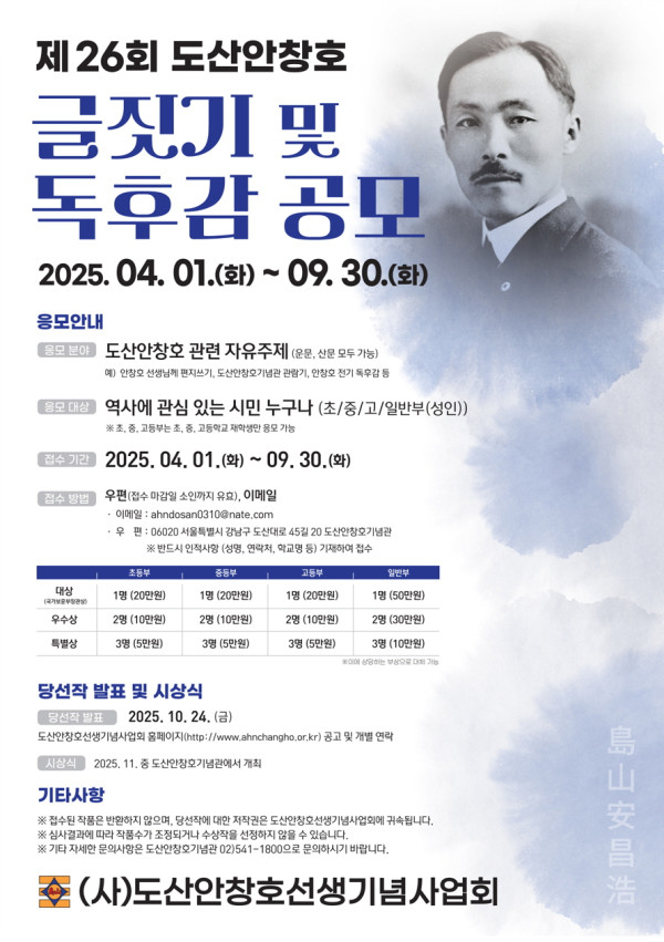 제26회 도산안창호 글짓기 및 독후감 공모 공모분야 문학/시나리오 접수기간2025.04.01 ~ 2025.09.30 D+141 종료 참가자격 제한없음 주최(사)도산안창호선생기념사업회 1등상금(상품)100만원 이하 홈페이지 바로가기 첨부파일 다운로드 유의사항 ※본 내용은 참고 자료로 내용의 오류와 변동에 대해 책임지지 않습니다. (오류 및 변동 신고는 상단의 '제안/오류' 신고를 통해 해주십시오.) ※주최사 사정에 따라 일정 및 내용이 변경될 수 있으니 주최사 홈페이지 등을 통해 관련 안내를 수시로 확인하시기 바랍니다. 상세내용 ■ 제목제26회 도산안창호 글짓기 및 독후감 공모 ■ 기간 - 접수 기간 : 2025. 04. 01.(화) ~ 09. 30.(화) ■ 참가자격 - 역사에 관심 있는 시민 누구나(초/중/고/일반부(성인)) ※ 초, 중, 고등부는 초, 중, 고등학교 재학생만 응모 가능 ■ 참여방법 / 접수방법<응모 분야> - 도산안창호 관련 자유주제(운문, 산문 모두 가능) ※ 예 : 안창호 선생님께편지쓰기, 도산안창호기념관 관람기, 안창호 전기 독후감 등 <접수 방법> 우편(접수 마감일 소인까지 유효) 또는 이메일 - 이메일 : ahndosan0310@nate.com - 우편 : 06020 서울특별시 강남구 도산대로 45길 20 도산안창호기념관 ※ 반드시 인적사항(성명, 연락처, 학교명 등) 기재하여 접수 ■ 시상내용 / 혜택 - 초등부 : 대상 1명 20만원 / 우수상 2명 10만원 / 특별상 3명 5만원 - 중등부 : 대상 1명 20만원 / 우수상 2명 10만원 / 특별상 3명 5만원 - 고등부 : 대상 1명 20만원 / 우수상 2명 10만원 / 특별상 3명 5만원 - 일반부 : 대상 1명 50만원 / 우수상 2명 30만원 / 특별상 3명 10만원 ■ 유의사항 - 접수된 작품은 반환하지 않으며, 당선작에 대한 저작권은 도산안창호선생기념사업회에 귀속됩니다. - 심사결과에 따라 작품수가 조정되거나 수상작을 선정하지 않을 수 있습니다. ■ 문의도산안창호기념관 02)541-1800 목록