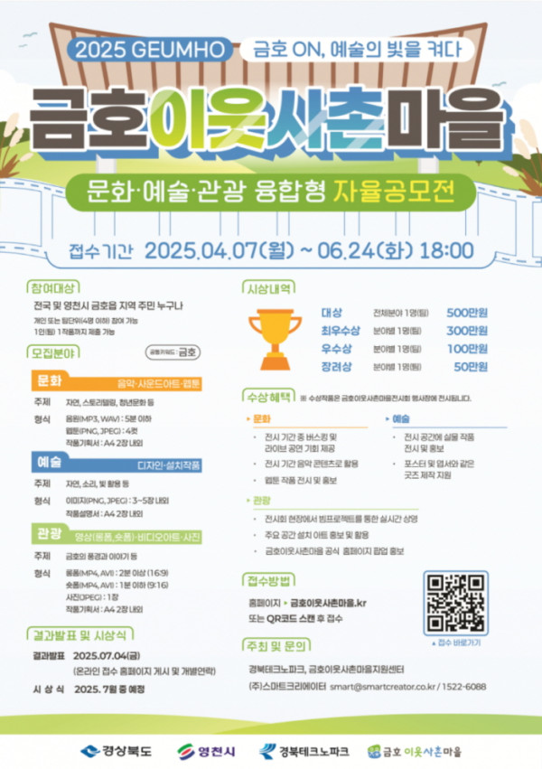 금호 이웃사촌 마을 [문화·예술·관광 융합형 자율공모전] 공모분야 사진/영상, 웹툰/포스터/미술, 로고송/음악 접수기간2025.04.07 ~ 2025.06.24 D+239 종료 참가자격 제한없음 주최경북테크노파크, 금호이웃사촌마을지원센터 주관(주)스마트크리에이터 1등상금(상품)500만원~1천만원 홈페이지 바로가기 첨부파일 다운로드 유의사항 ※본 내용은 참고 자료로 내용의 오류와 변동에 대해 책임지지 않습니다. (오류 및 변동 신고는 상단의 '제안/오류' 신고를 통해 해주십시오.) ※주최사 사정에 따라 일정 및 내용이 변경될 수 있으니 주최사 홈페이지 등을 통해 관련 안내를 수시로 확인하시기 바랍니다. 상세내용 ■ 제목금호 이웃사촌 마을 [문화·예술·관광 융합형 자율공모전] ■ 기간 - 접수기간 : 2025. 04. 07(월) ~ 06. 24(화) 18시까지 ■ 참가자격 전국 및 영천시 금호읍 지역 주민 누구나◦ 개인 또는 팀단위(4명 이하) 참여 가능◦ 1인(팀) 1작품까지 제출 가능 ■ 참여방법 / 접수방법<공모분야>◦ 공통키워드 : 금호 분야형식주제출품형식문화 음악·사운드아트웹툰자연, 스토리텔링,청년문화등⦁음원(MP3, WAV) : 5분⦁웹툰(PNG, JPEG) : 4컷⦁작품기획서 : A4 2장내외예술 디자인·설치작품 자연,소리,빛활용등⦁이미지(PNG, JPEG) : 3~5장 내외⦁작품설명서 : A4 2장내외관광영상(롱폼숏폼)·비디오아트사진금호의풍경과이야기등⦁롱폼(MP4, AVI) : 2분 이상(16:9)숏폼(MP4, AVI) : 1분이하(9:16)⦁사진(JPEG) : 1장⦁작품기획서 : A4 2장내외 <제출형식> ※ 1인(팀) 1작 제출 가능 ◦ 공식홈페이지 접속 또는 큐알스캔 접속 후 분야선택하여 업로드 <접수방법> ➀ 금호이웃사촌마을.kr 또는 QR코드 접속 ➁ 접수폼에 기본 정보 기입 → 분야선택 -> 출품형식 업로드 <제출자료> ➀ (서식1) 문화ㆍ예술ㆍ관광 융합형 자율 공모전 참가 신청서 ➁ (서식2) 문화ㆍ예술ㆍ관광 융합형 자율 공모전 출품 작품 설명서 ➂ (서식3) 문화ㆍ예술ㆍ관광 융합형 자율 공모전 참가 서약서 ➃ (서식4) 개인(기업)정보 수집·활용 동의서<제출형식> ∙ 영상 : MP4, AVI (HD 화질 이상) *롱폼 : 2분 이상(16:9), 숏폼 : 1분 이하(9:16) ∙ 이미지 : PNG, JPEG 3~5장 내외 ∙ 음원 : MP3, WAV 5분 이하 ∙ 사진 : JPEG 1장 ■ 시상내용 / 혜택 - 대상 전체분야1명(팀) : 500만원 - 최우수상 분야별1명(팀) : 각 300만원 - 우수상 분야별1명(팀) : 각 100만원 - 장려상 분야별1명(팀) : 각 50만원 ※ 추가 수상 특별 혜택 (공고문 내용 참조) ■ 유의사항◦ 입상된 작품의 경우 추후 공모전 개최 및 홍보 목적상 필요한 경우 주최측에서 수상작을 활용할 수 있음 ◦ 접수된 작품은 반환하지 않으며 공모전에 출품된 모든 작품의 저작권 (저작권 인격권과 저작재산권)은 출품자(창작자)에 있음◦ 참가자는 자신의 창작물이 저작권 문제가 없음을 보장◦ 수상작의 저작권은 참가자에게 귀속되며 주최 측은 홍보 목적으로 사용 권리를 요청◦ 모든 제출 작품은 타인의 저작권을 침해해선 안되며 입상한 작품이 추후라도 저작권에 위배 될 경우 응모자의 책임으로 당선을 취소하고 상금을 환수함◦ 제출작품에 대한 저작권 등 분쟁에 따른 모든 문제에 대하여는 참가자가 책임을 부담함◦ 그 외 필요한 경우 입상작에 관한 지식 재산권을 양수하거나 실시 • 이용 허락 등을 받을 수 있으며 이 경우에는 창작자와 별도로 약정하여 정함 ■ 문의㈜스마트크리에이터 - 메일 : smart@smartcreator.co.kr - 대표전화 : 1522-6088 목록