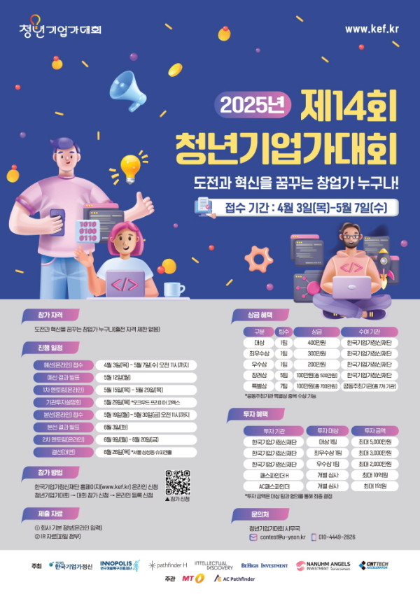 제14회 청년기업가대회 (대상 상금 400만원 및 투자금 최대 5천만원) 공모분야 창업/사업 지원, 기타분야 접수기간2025.04.03 ~ 2025.05.07 D+286 종료 참가자격 제한없음 주최한국기업가정신재단, 연구개발특구진흥재단, 패스파인더H, 인텔렉추얼디스커버리, 비하이인베스트먼트, 나눔엔젤스, 씨엔티테크 주관머니투데이, AC패스파인더 1등상금(상품)200만원~499만원 홈페이지 바로가기 첨부파일 다운로드 유의사항 ※본 내용은 참고 자료로 내용의 오류와 변동에 대해 책임지지 않습니다. (오류 및 변동 신고는 상단의 '제안/오류' 신고를 통해 해주십시오.) ※주최사 사정에 따라 일정 및 내용이 변경될 수 있으니 주최사 홈페이지 등을 통해 관련 안내를 수시로 확인하시기 바랍니다. 상세내용 ■ 제목제14회 청년기업가대회 ■ 기간 - 모집 기간 : 4월 3일 ~ 5월 7일 오전 11시 ■ 참가자격제한 없음 ■ 참여방법 / 접수방법<응모방법 및 제출서류> - 참가방법 : 한국기업가정신재단 홈페이지(www.kef.kr) 온라인 신청 - 제출서류 : (1)회사 기본 정보(온라인 입력) (2)IR 자료(파일 첨부) ■ 시상내용 / 혜택 - 한국기업가정신재단 상금 1 400만원 대상팀 - 한국기업가정신재단 상금 1 300만원 최우수상팀 - 한국기업가정신재단 상금 1 200만원 우수상팀 - 한국기업가정신재단 상금 5 100만원 장려상팀 - 공동주최기관 상금 7 100만원 특별상팀 - 한국기업가정신재단 투자금 1 5,000만원 대상팀 - 한국기업가정신재단 투자금 1 3,000만원 최우수상팀 - 한국기업가정신재단 투자금 1 2,000만원 우수상팀 - 패스파인더H 투자금 2 10억원 개별 심사A – C패스파인더 투자금 2 1억원 개별 심사 ■ 유의사항자세한 내용은 주최측 공모전 홈페이지를 참조 바랍니다. ■ 문의청년기업가대회사무국 - 전화 : 010-4449-2826 - 이메일 : contest@u-yeon.kr 목록