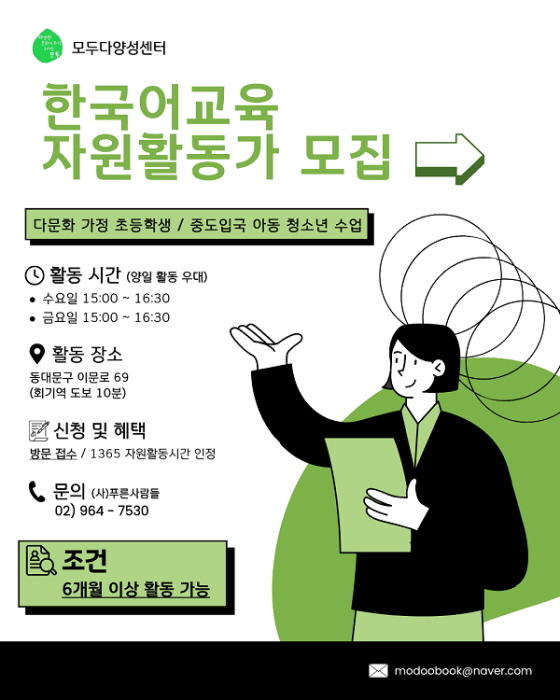 모두다양성센터 한국어교육 자원활동가 모집 접수기간2025.09.05 ~ 2026.03.05 D-30 접수중 참가자격 제한없음, 기타 제한 주최모두다양성센터 주관모두다양성센터 1등상금(상품)기타 홈페이지 바로가기 첨부파일 다운로드 유의사항 ※본 내용은 참고 자료로 내용의 오류와 변동에 대해 책임지지 않습니다. (오류 및 변동 신고는 상단의 '제안/오류' 신고를 통해 해주십시오.) ※주최사 사정에 따라 일정 및 내용이 변경될 수 있으니 주최사 홈페이지 등을 통해 관련 안내를 수시로 확인하시기 바랍니다. 상세내용 ■ 제목모두다양성센터 한국어교육 자원활동가 모집 ■ 기간 모집기간 : 2025.09.05(금) ~ 모집 시까지 ■ 참가자격 - 전공·경력·영어 실력 무관 - 배움과 나눔으로 행복을 느끼고 싶으신 분 - 다문화가정 어린이, 청소년과 함께하는 다양한 활동으로 기쁨을 나누실 분 - 밝고 긍정적인 마음으로 함께하실 분 - 6개월 이상의 꾸준하고 지속적인 참여가 가능하신 분 ■ 활동내용 - 다문화 가정 초등학생 대상 한글 및 학습 지도 - 중도입국 청소년 대상 한국어 수업 지원 ■ 지원방법 - 현장 방문 접수 ■ 참여 혜택 - 1365 자원봉사 시간 인정 ■ 문의 - 전화) 02-964-7530 - 이메일) modoobook@naver.com 목록