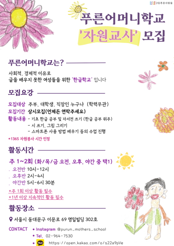 푸른어머니학교 자원교사 모집 접수기간2025.12.01 ~ 2026.12.31 D-331 접수중 참가자격 기타 제한 주최사단법인 푸른사람들 주관사단법인 푸른사람들 1등상금(상품)기타 홈페이지 바로가기 첨부파일 다운로드 유의사항 ※본 내용은 참고 자료로 내용의 오류와 변동에 대해 책임지지 않습니다. (오류 및 변동 신고는 상단의 '제안/오류' 신고를 통해 해주십시오.) ※주최사 사정에 따라 일정 및 내용이 변경될 수 있으니 주최사 홈페이지 등을 통해 관련 안내를 수시로 확인하시기 바랍니다. 상세내용 ■ 제목푸른어머니학교 자원교사 모집 ■ 기간- 연중 상시모집 ■ 참가자격 - 대학생 , 주부, 직장인 모두모두 환영 (전공무관, 경력 무관) - 배움과 나눔으로 행복을 느끼고 싶으신 분 - 어르신과 함께하는 다양한 활동으로 기쁨을 나누실 분 - 일주일에 1~2회 수업이 가능하신 분 - 밝고 긍정적인 마음으로 함께하실 분 - 1년 이상의 지속적인 활동이 가능하신 분 환영합니다 ■ 활동내용 - 비문해 어머니들의 첫 선생님이 되어주실 분! - 한글교육이 기본이고, 다양한 글쓰기, 그림그리기, 스마트폰 수업 등 다양한 수업을 진행합니다. - 선생님과 함께하는 수학여행, 소풍 등 다양한 행사들도 함께해요! ■ 지원방법 및 문의사항 - 인스타그램 DM @purun_mothers_school - 전화 02-964-7530 - 오픈카톡 https://open.kakao.com/o/s22a9pVe ■ 참여 혜택- 1365 봉사시간 인정 목록