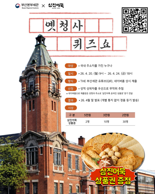 부산세관 옛 청사 퀴즈 풀면 어묵이 온다 접수기간2026.04.20 ~ 2026.04.24 D+4 종료 참가자격 제한없음 주최관세청 1등상금(상품)기타 홈페이지 바로가기 첨부파일 다운로드 유의사항 ※본 내용은 참고 자료로 내용의 오류와 변동에 대해 책임지지 않습니다. (오류 및 변동 신고는 상단의 '제안/오류' 신고를 통해 해주십시오.) ※주최사 사정에 따라 일정 및 내용이 변경될 수 있으니 주최사 홈페이지 등을 통해 관련 안내를 수시로 확인하시기 바랍니다. 상세내용 ■ 제목부산세관 옛청사 퀴즈쇼 이벤트 ■ 개요부산의 역사를 간직한 부산세관 옛 청사가 시민들을 위한 복합문화공간으로 새롭게 태어납니다!곧 진행될 착공식을 기념하며 준비한 퀴즈쇼, 함께 즐겨주실 거죠? ■ 기간 - 참여 기간: 26. 4. 20.(월) 09:00 ~ 4. 24.(금) 18:00 - 결과 발표 및 시상 : 4월 말 발표(별도 연락 없이 경품 등기 발송) ■ 참가자격국내 주소지를 가진 누구나 ■ 참여방법 / 접수방법네이버 폼 제출 : https://naver.me/5PWifdHd ※ 당첨 힌트: 함께 게시된 카드뉴스를 꼼꼼히 살펴보시면 정답 맞히기 훨씬 쉬워요. ■ 시상내용 / 혜택삼진어묵 상품권(총 42명 추첨) : 5만 원권(2명) / 3만 원권(10명) / 2만 원권(30명) 목록